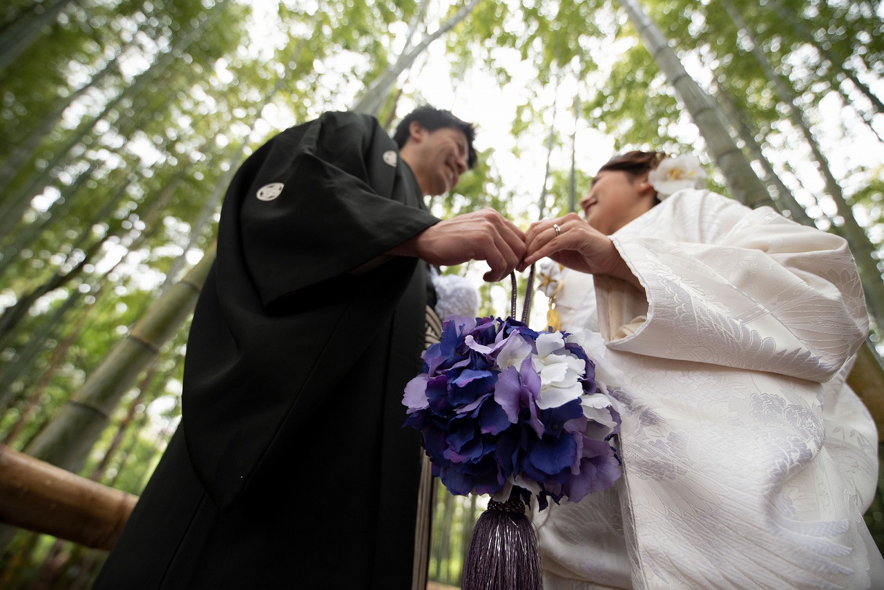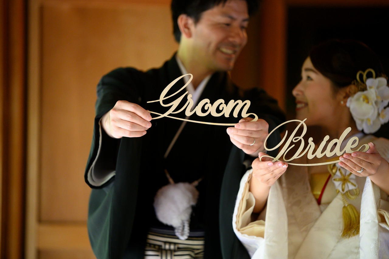 白無垢にゴールドの花嫁小物で自分らしい装い。