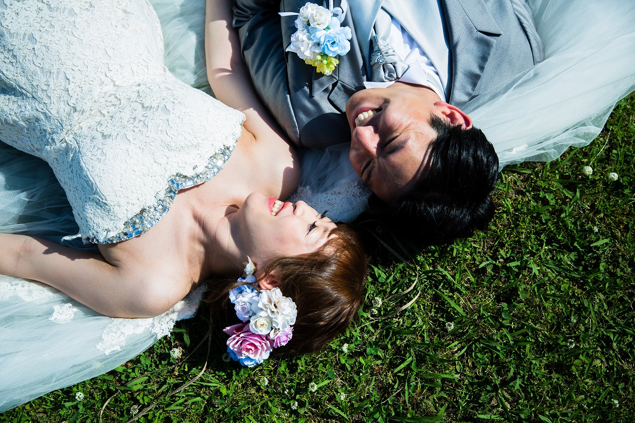 どこまでも澄み渡る青い空の下でウェディングフォト