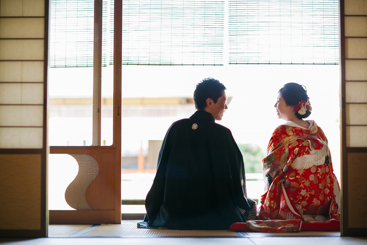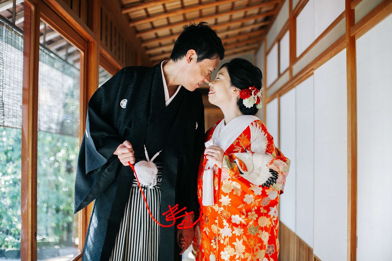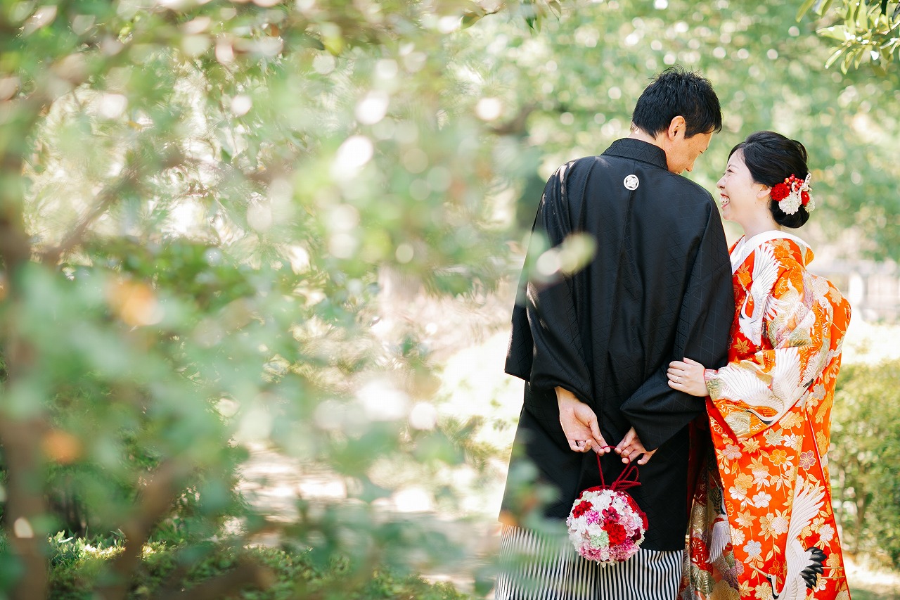ご希望であった、「白鳥庭園」での撮影、緑で溢れる中に赤い色打掛の新婦様の笑顔が眩しく、輝いていました。