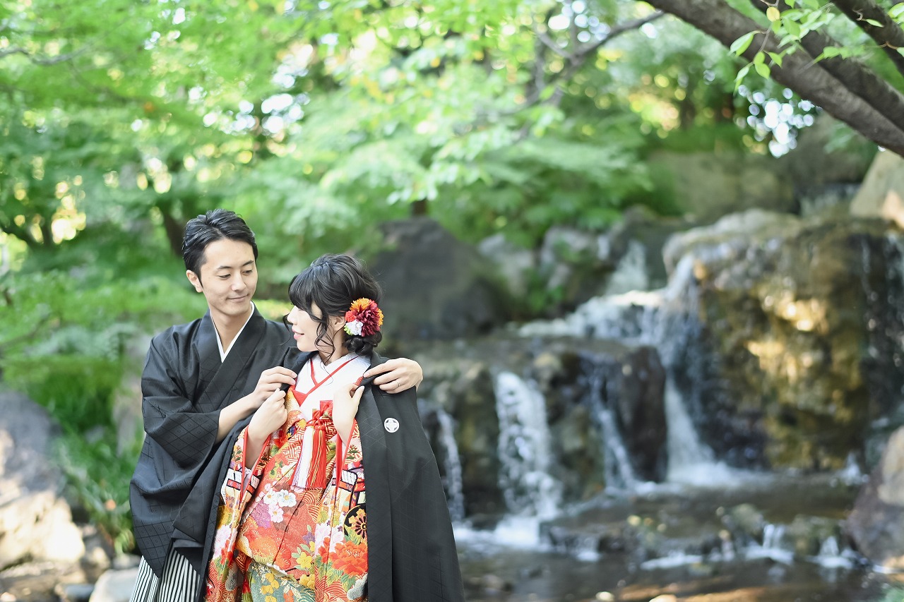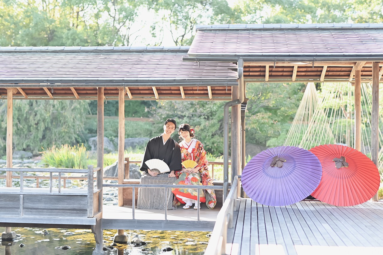趣ある白鳥庭園で、和装の前撮り