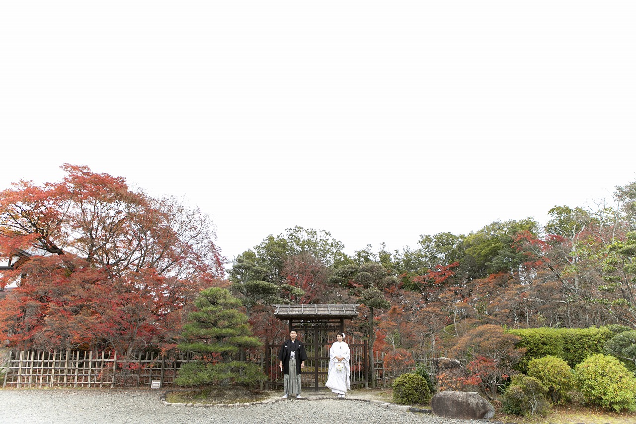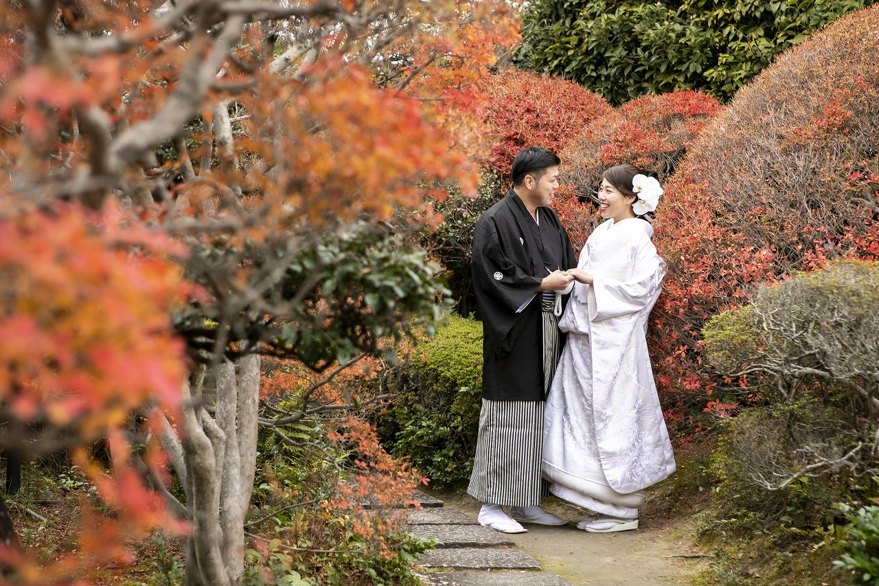 真っ赤な紅葉に囲まれ、白無垢での撮影は新婦様の美しさも一段と引き立ちました!!お茶室内での撮影では洋髪綿帽子を付け、より純白の花嫁に♡