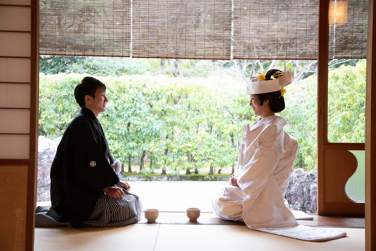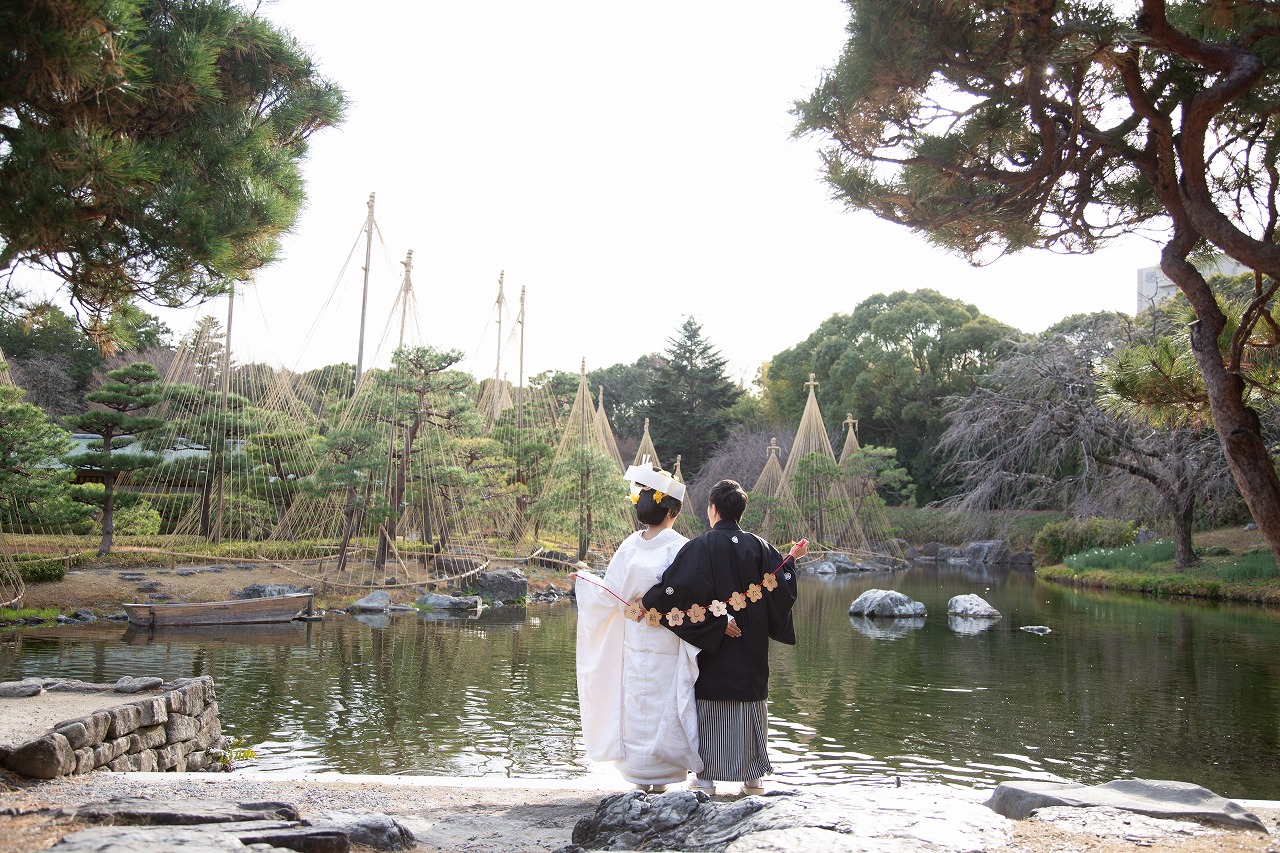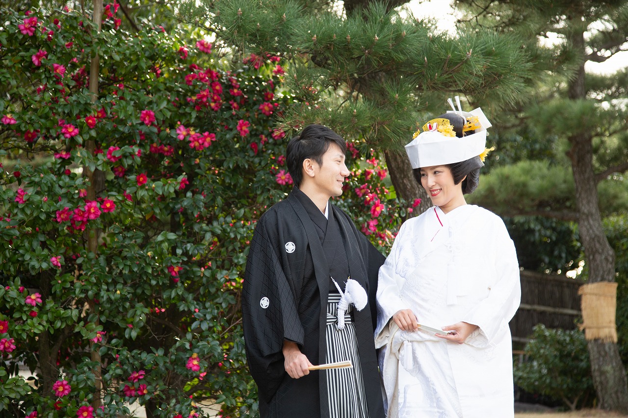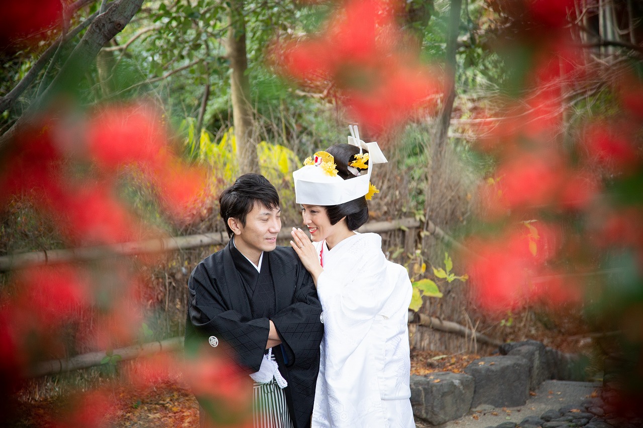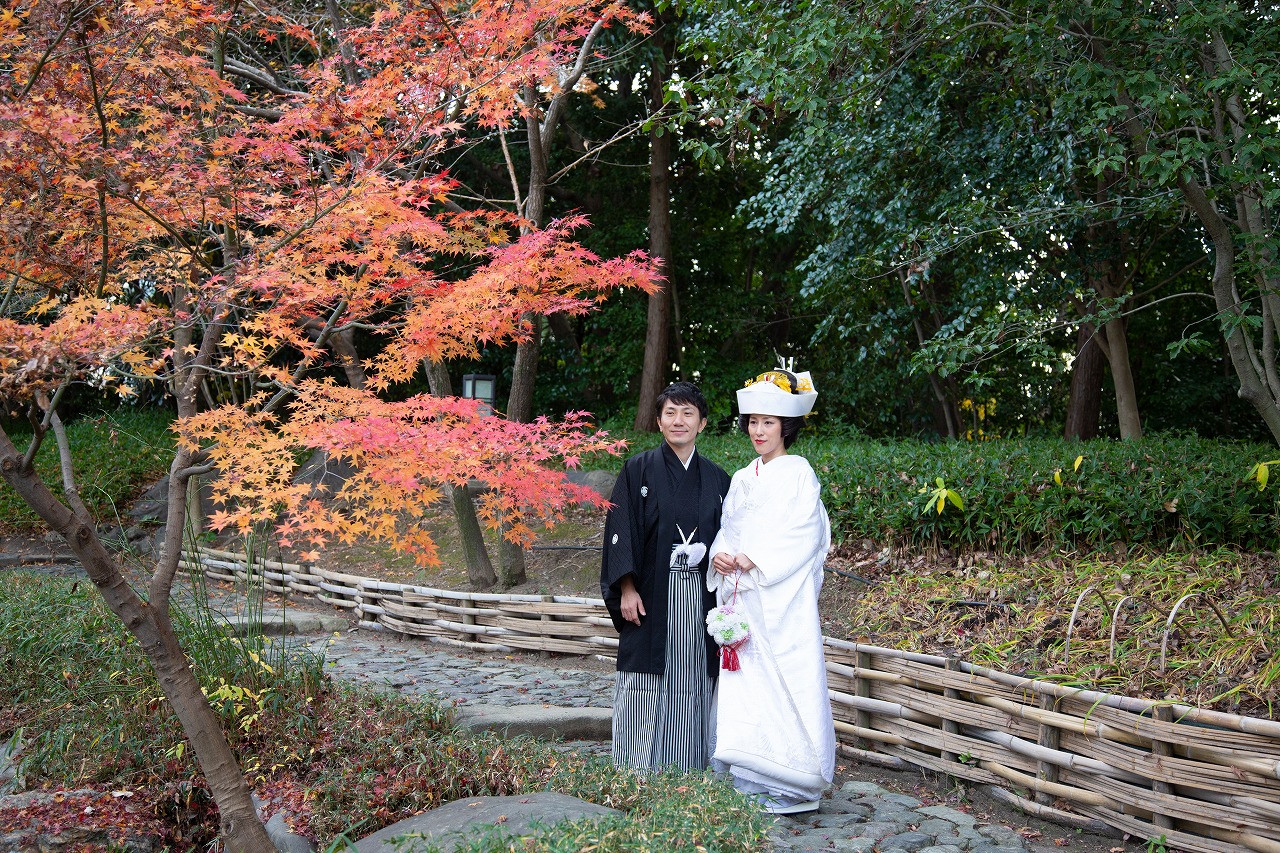 美しい日本庭園で伝統的な白無垢姿での前撮り