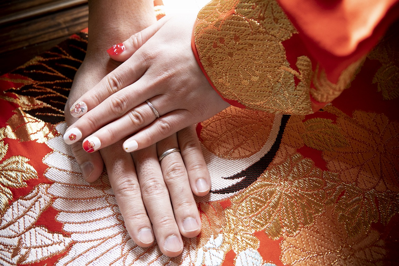 ありがとうございます!また新婦様のネイルアートには紅白をベースに水引きや梅のお花があしらわれ、とっても可愛い指先に♡