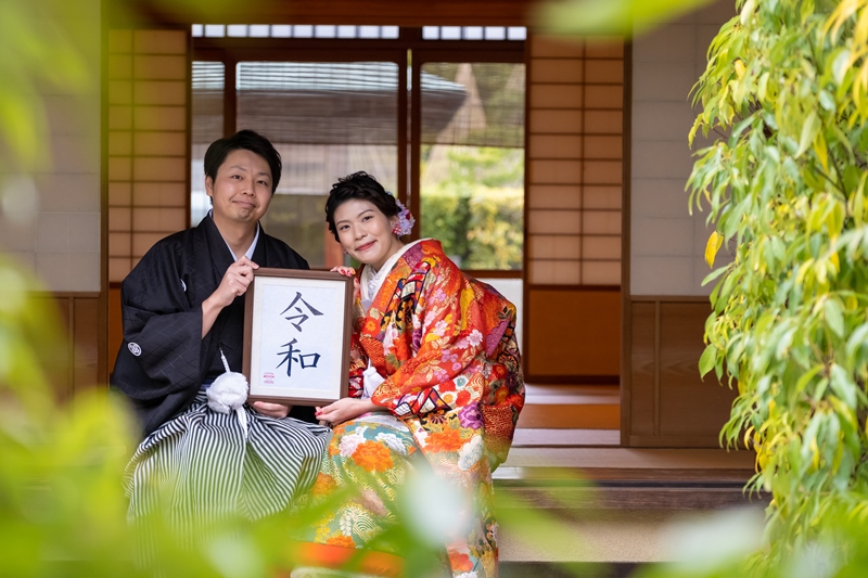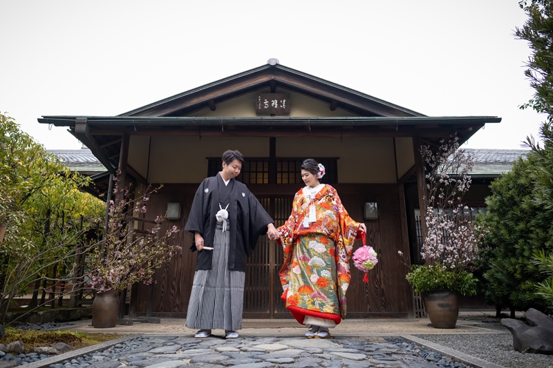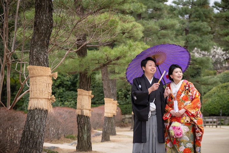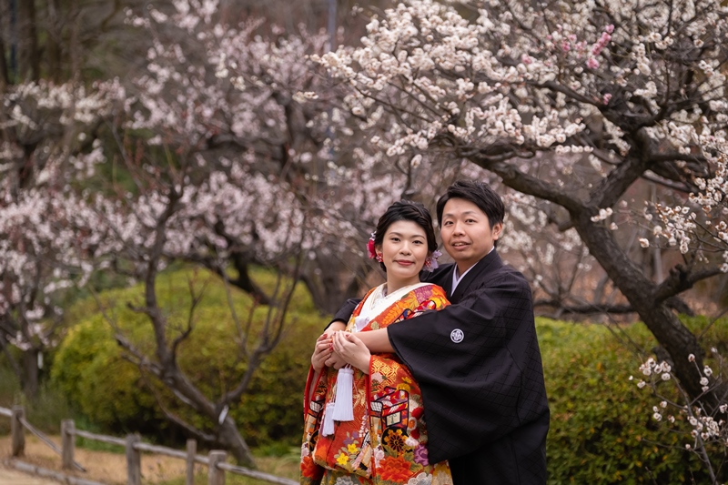 梅が色づく白鳥庭園で趣ある和装前撮り