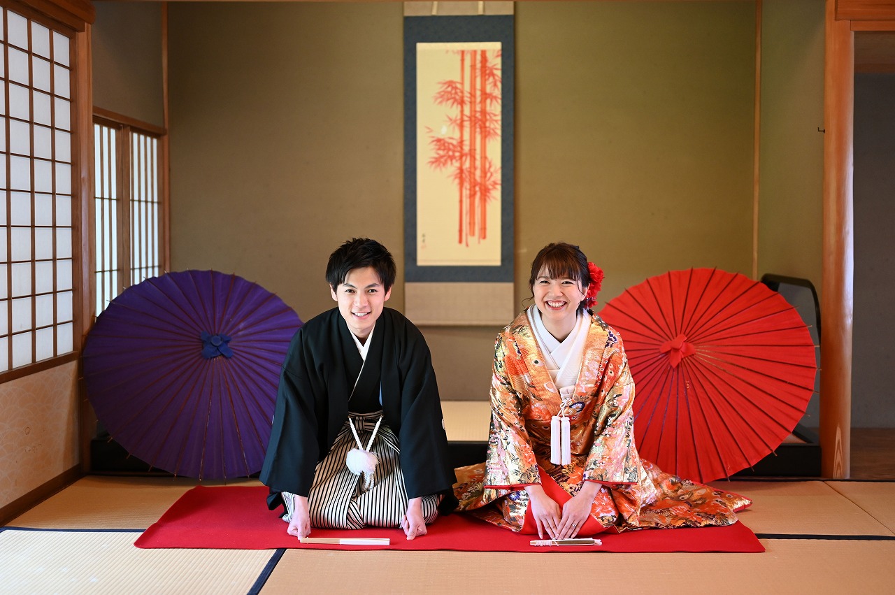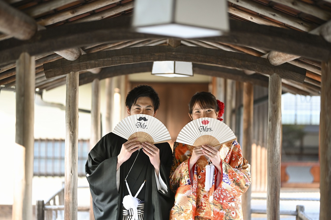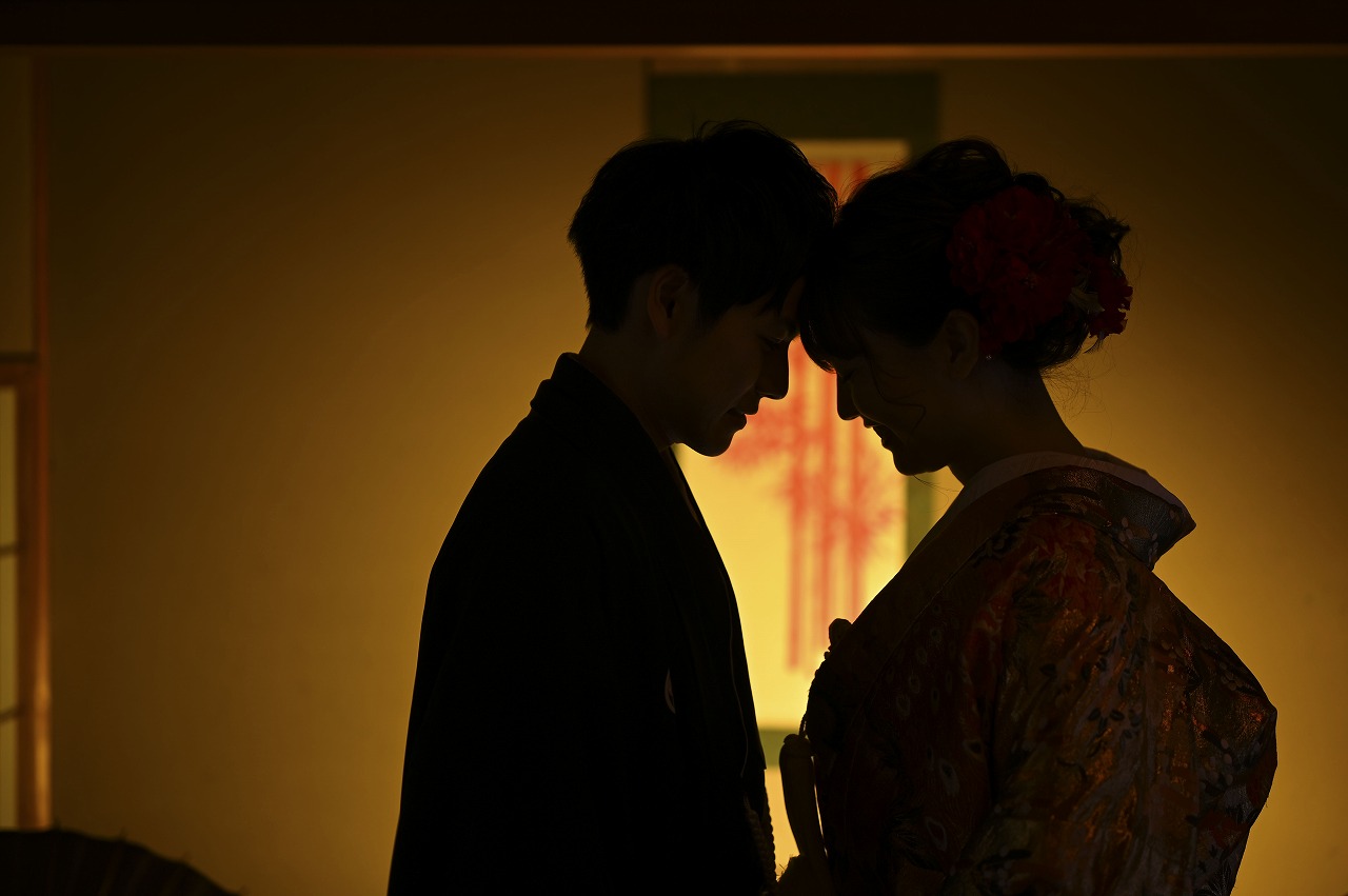 オレンジゴールドの色打掛に大ぶりの赤い髪飾りを付けて可愛らしい装いの新婦様に新郎様は終始、惚れ惚れ♡