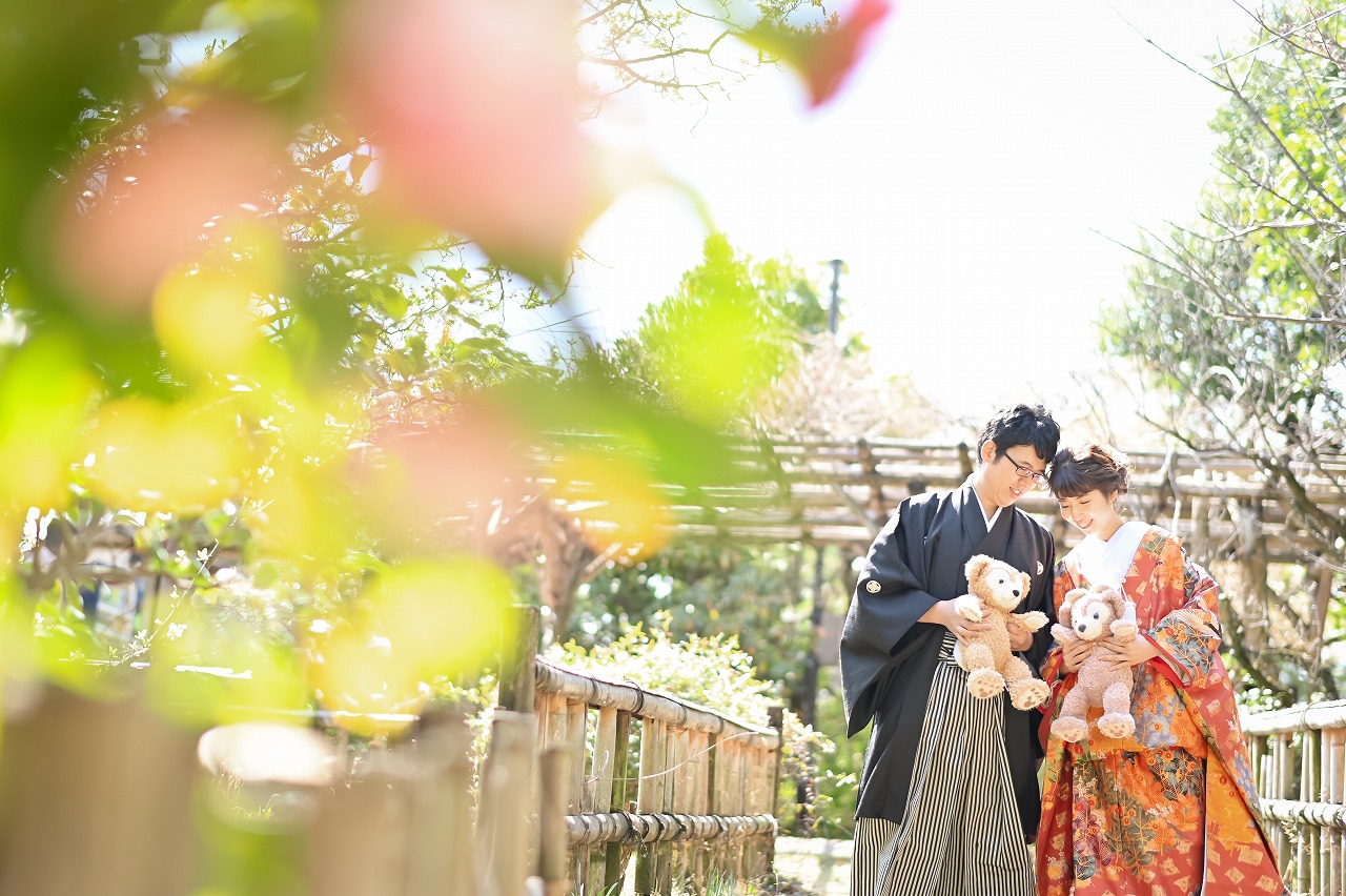 和装はしっとり大人っぽくもお二人らしい自然の表情に。そしてお二人の大好きなディズニーのキャラクターのぬいぐるみ達も一緒に撮影を楽しんで頂けました(´▽`*)