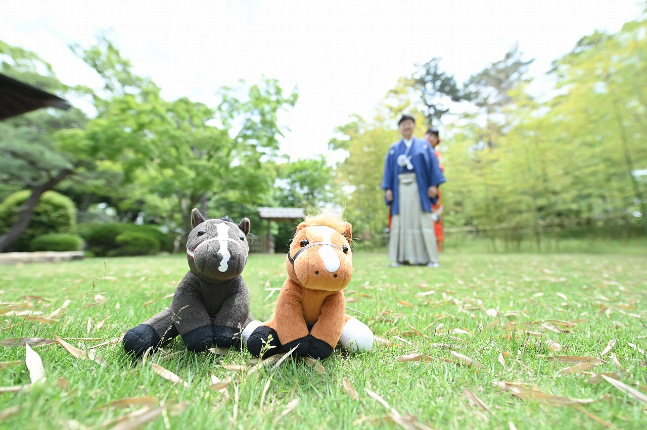 新緑の中で朱色の色打掛とネイビーの紋付が鮮やかで似合っていましたよ!