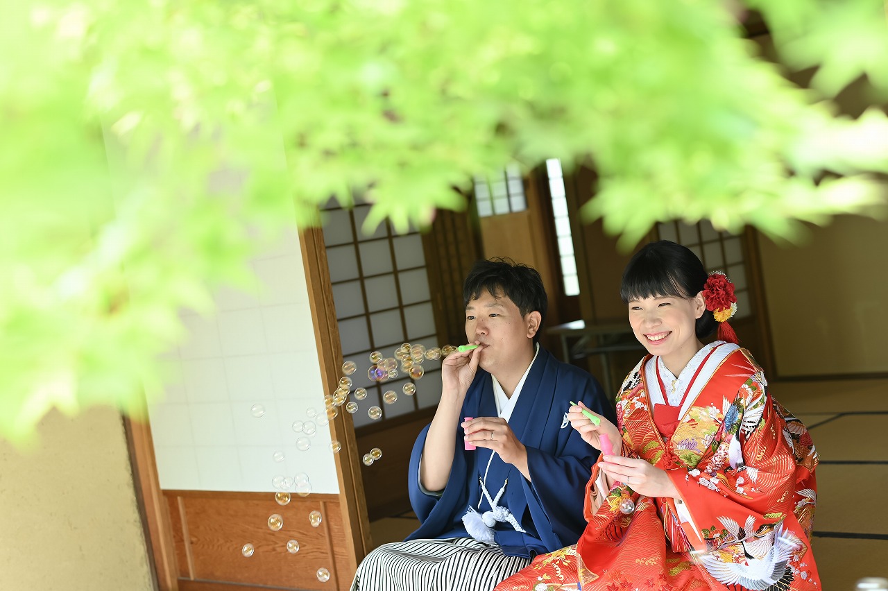 緑に囲まれお二人だけの空間でロケーション和装フォト。