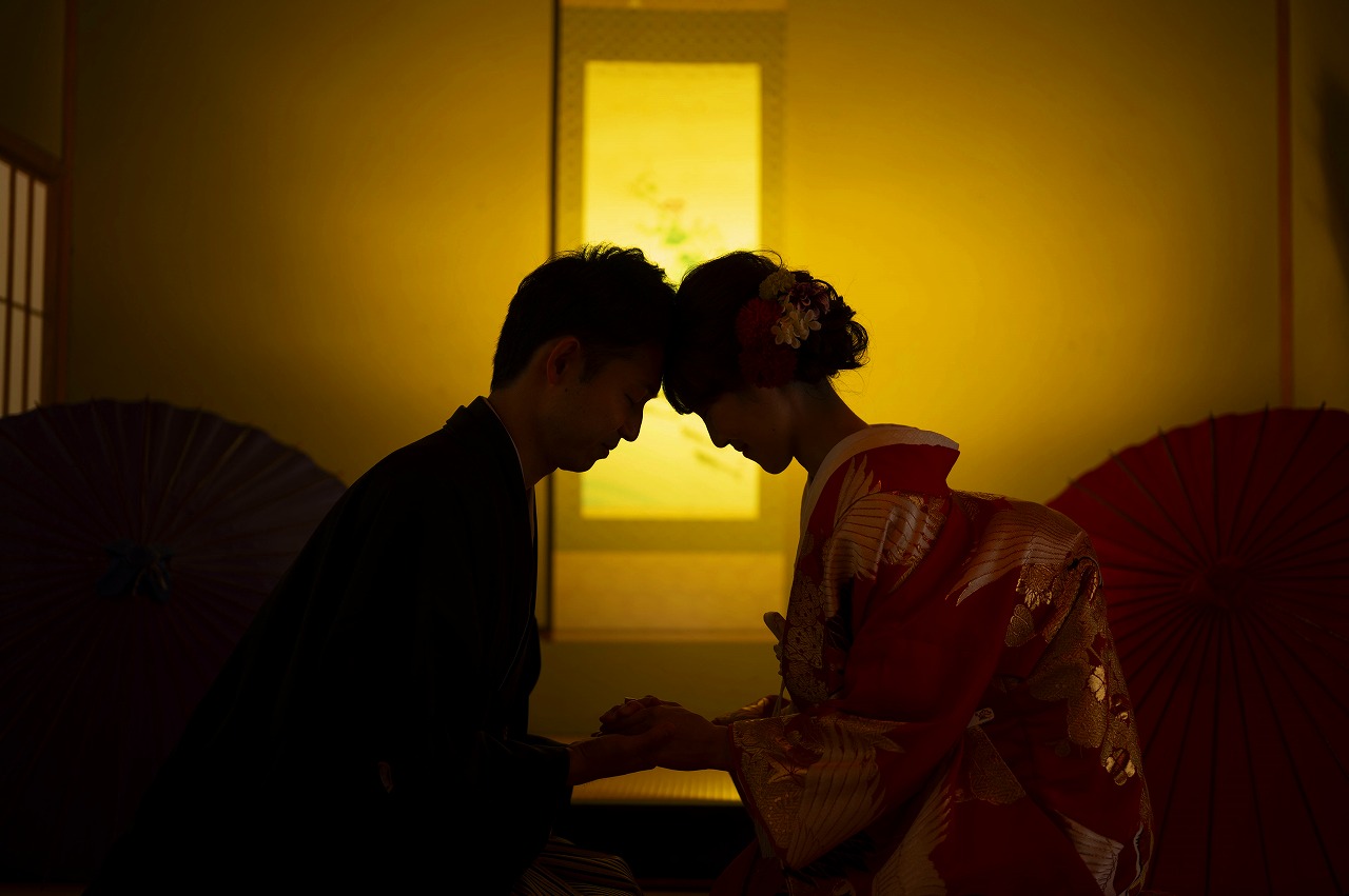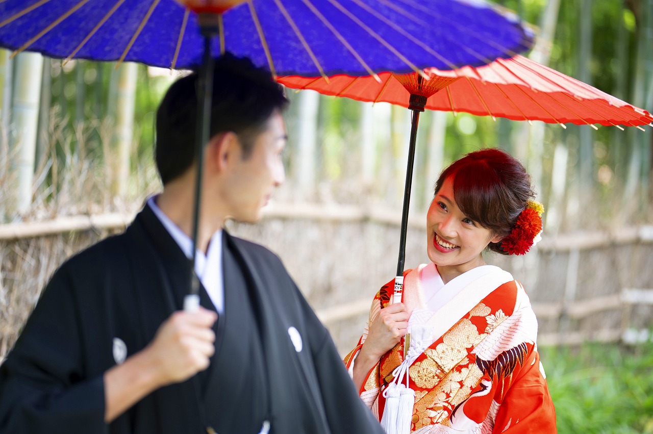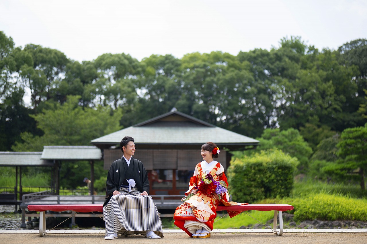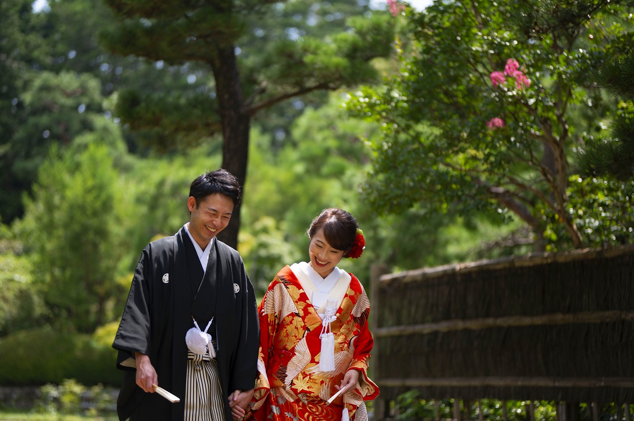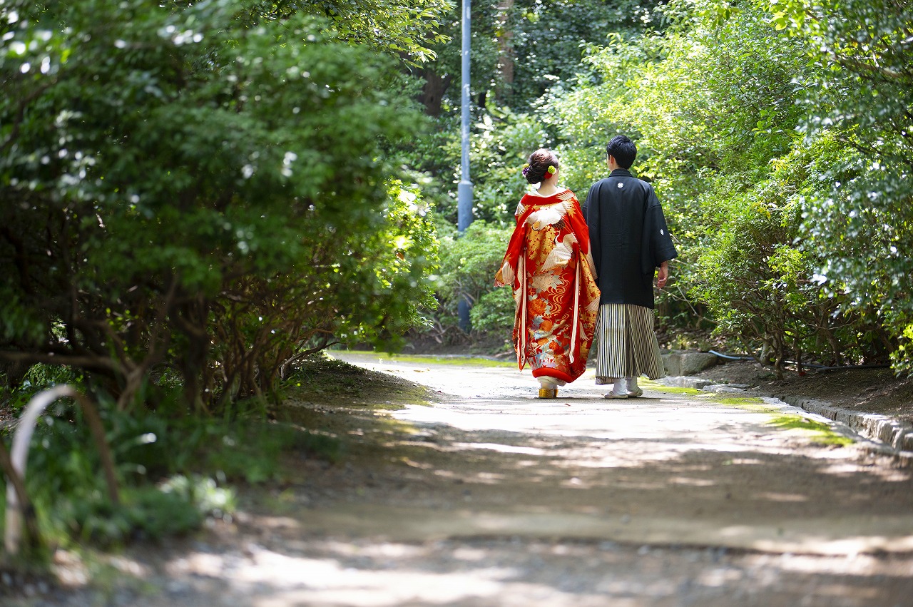緑に囲まれて自然な笑顔があふれる和装ロケーション撮影。