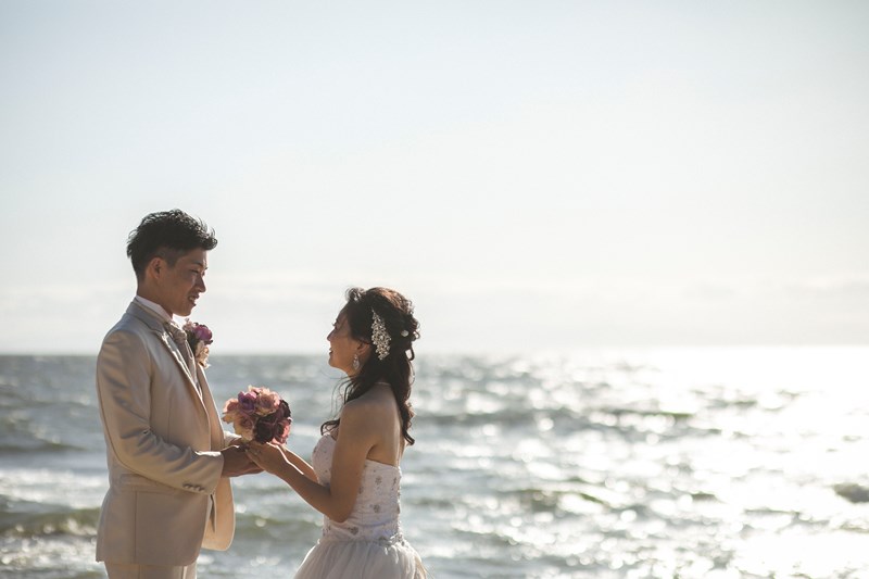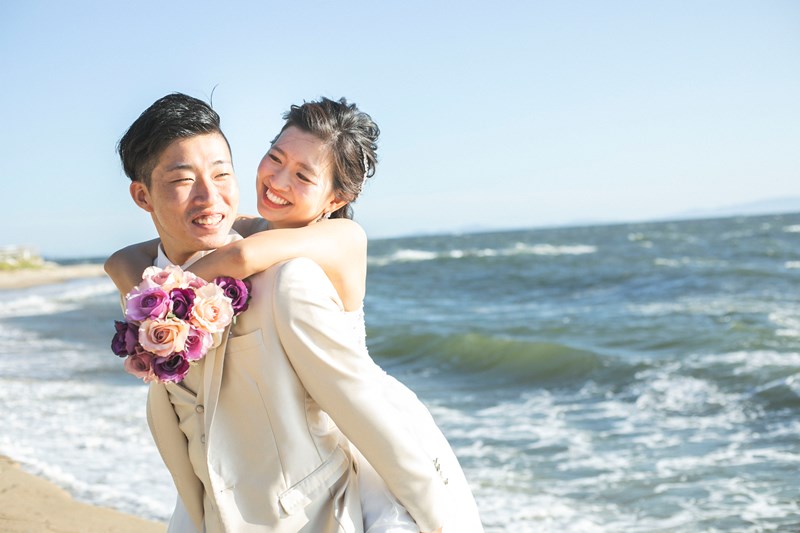 晴れ渡る青空の下、笑顔溢れるビーチ撮影。