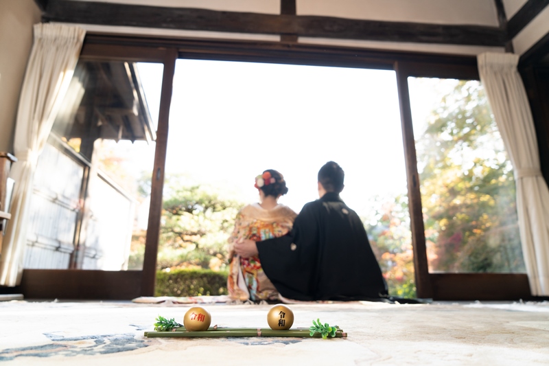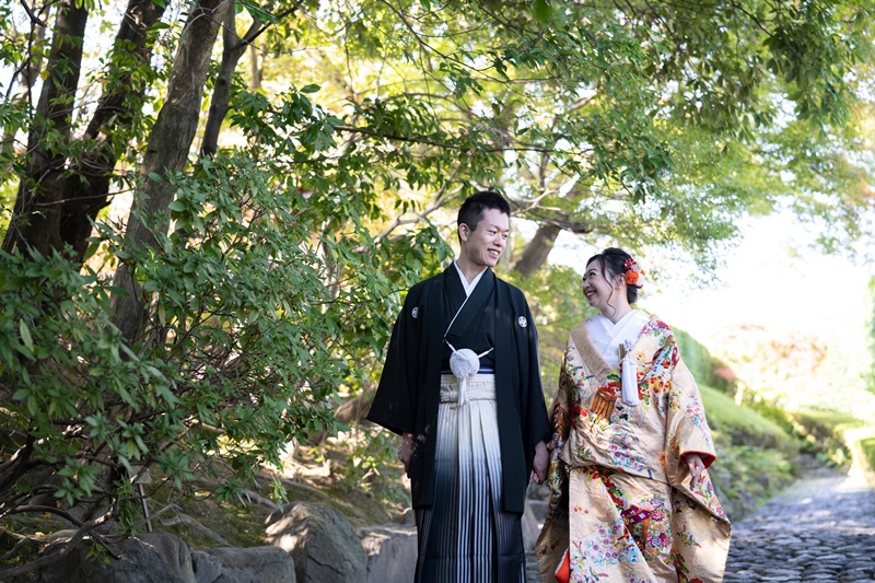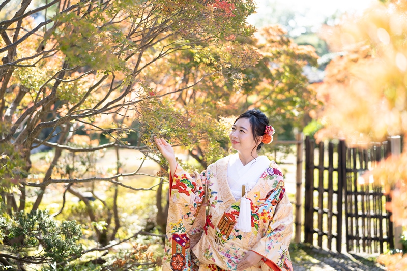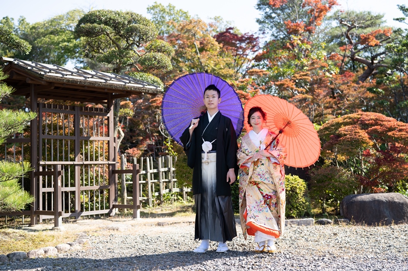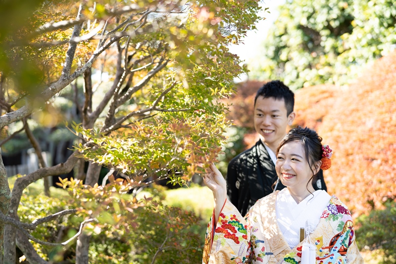 お二人の笑顔がとっても素敵です♪庭園内も秋を感じれるくらい紅葉が色付き始めていてとても雰囲気の良いお写真となっていますね!!