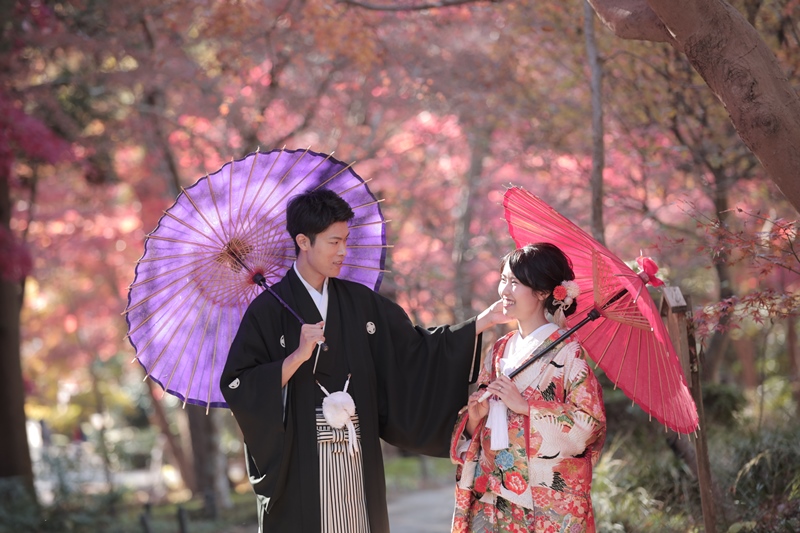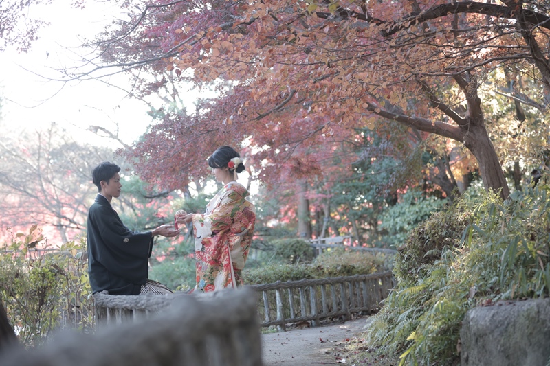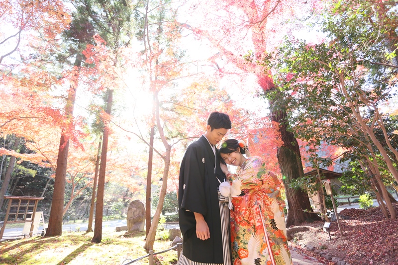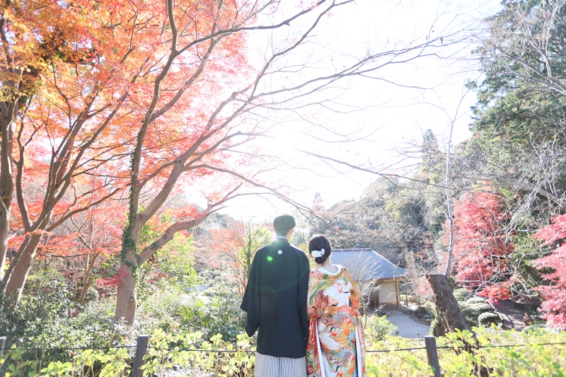どのお写真を見ても紅葉がキレイで、さらにその中に映るお二人の笑顔も最高に素敵です!!ご新婦様のお衣装の打掛も華やかなものもを選んで頂き紅葉に負けずお綺麗でお似合いでした♡