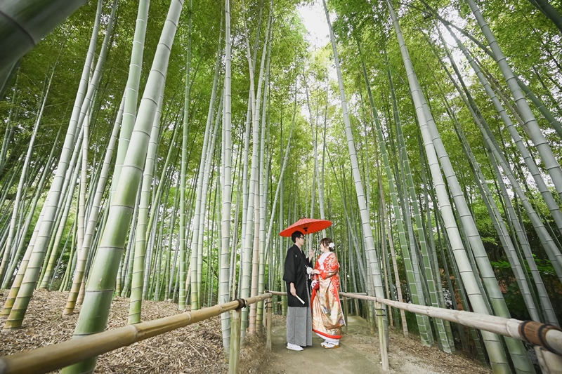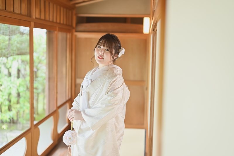 緑が美しい庭園で、お二人の和装姿がとても眩しいです✨