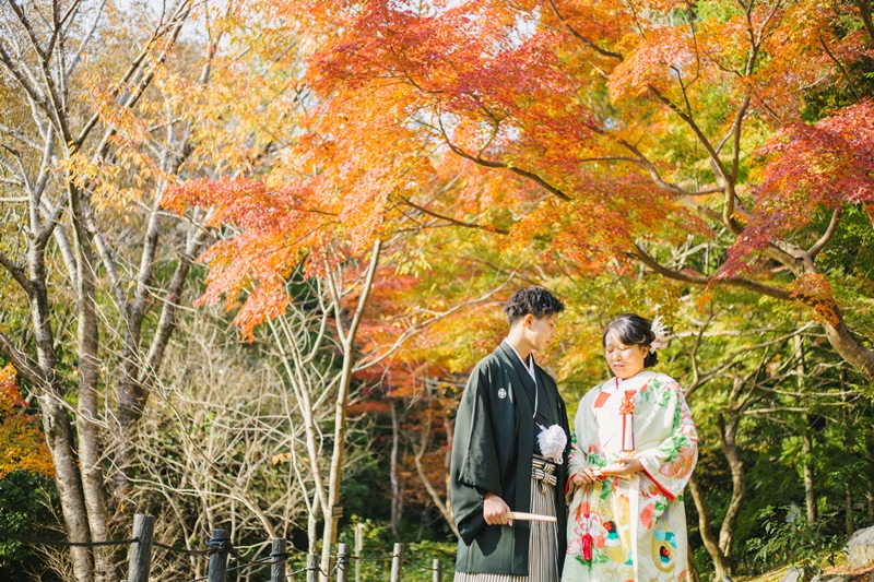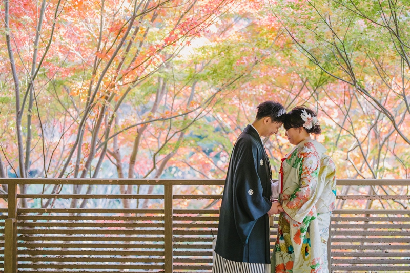赤く色づく紅葉に淡い色の色打掛がとても綺麗でした♡