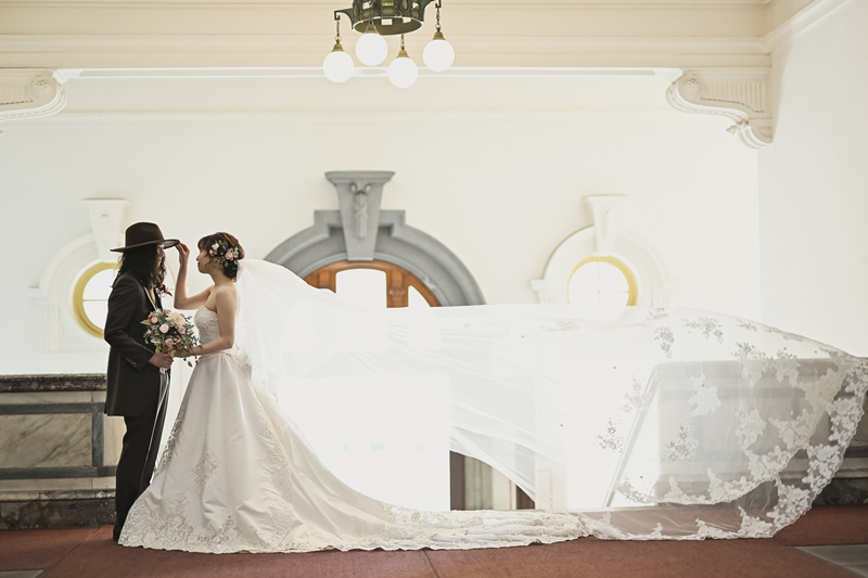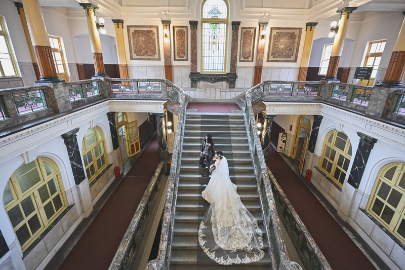 当店で撮影をしていただき、ありがとうございました!!やはり、大階段がメインの市政資料館、トレーンの長いドレスと刺繍入りのヴェールがより一層