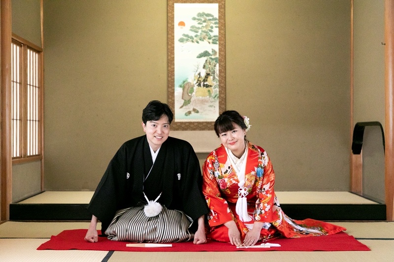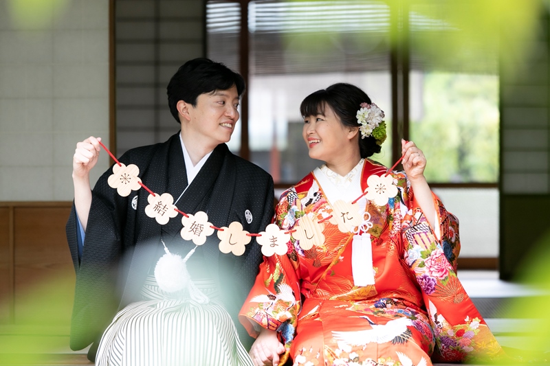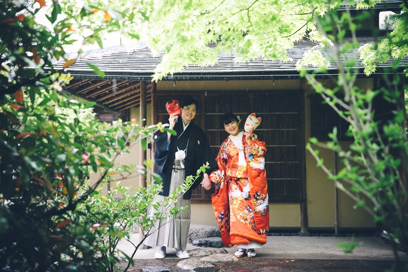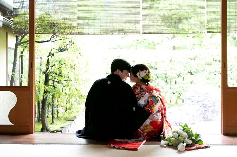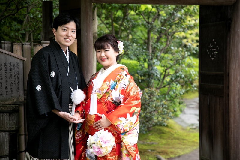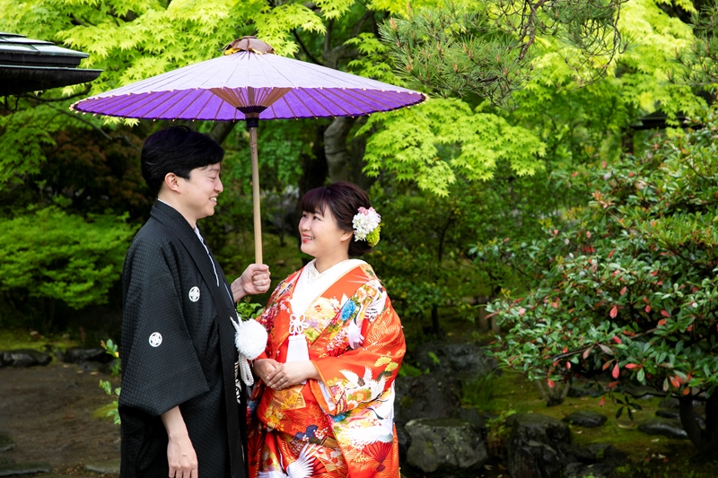 お2人のお写真も雨で濡れて、いつもより色濃く美しい木々をバックに撮影!色打掛の赤がよく映えますよね~(^^)/