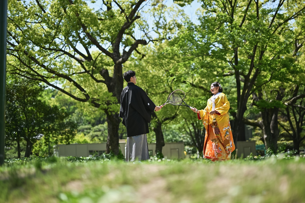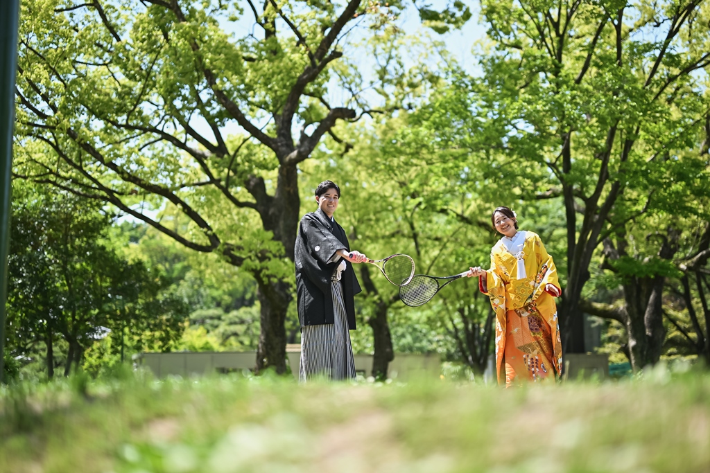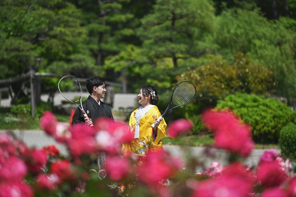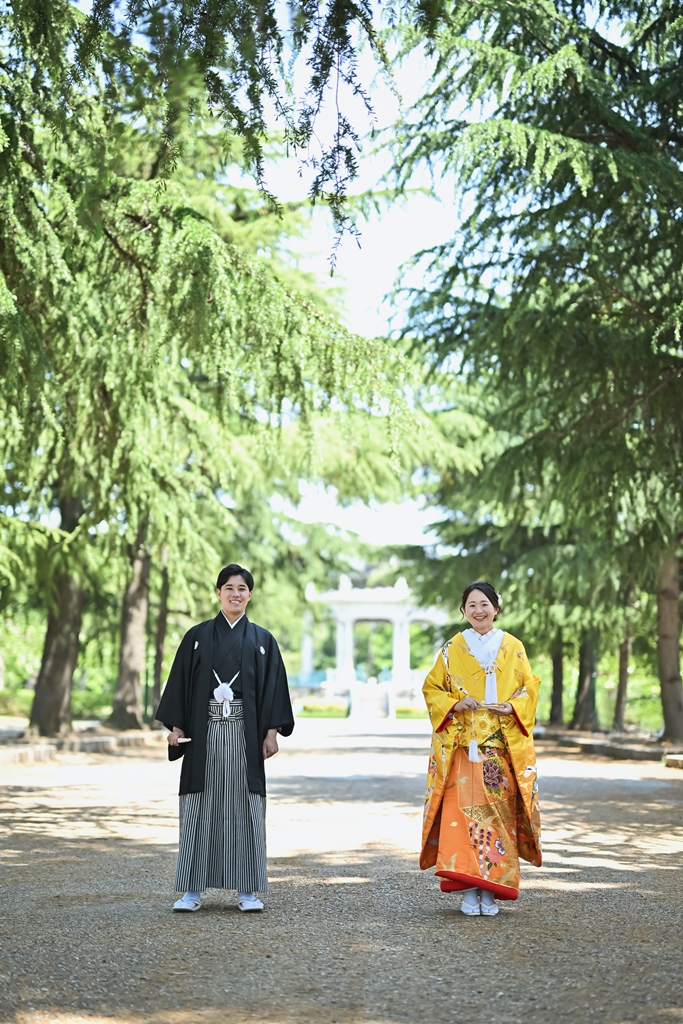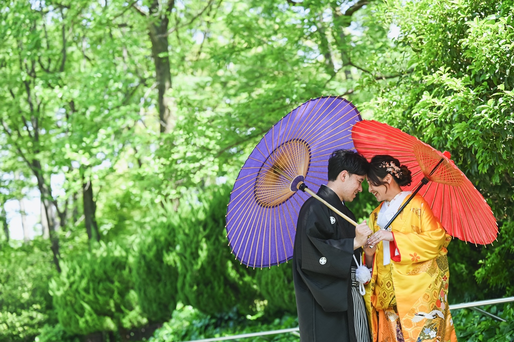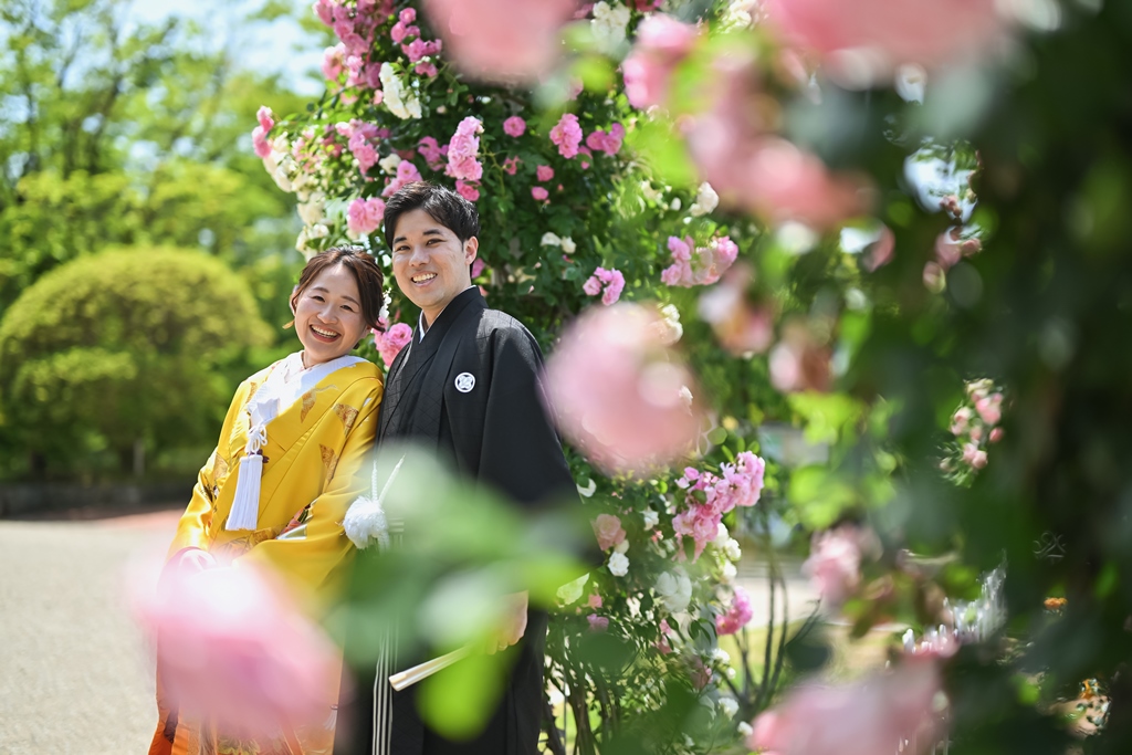 色鮮やかな色打掛が緑に映えて、すごく素敵でした♡自然な緑とお花に囲まれて、天候にも恵まれて最高の想い出が増えたのではないでしょうか!!