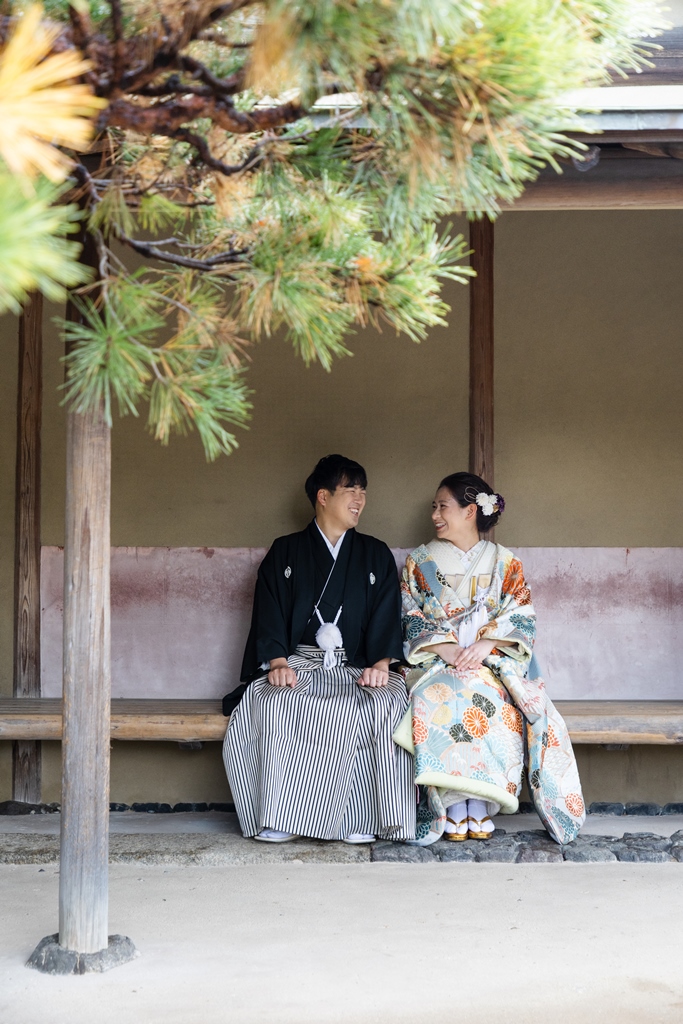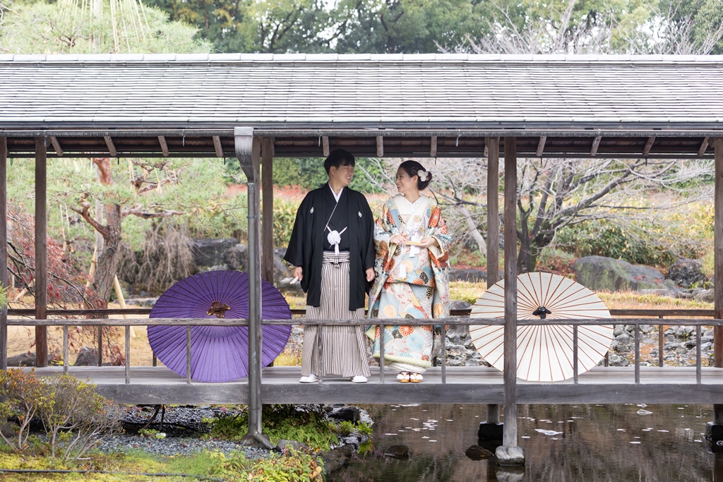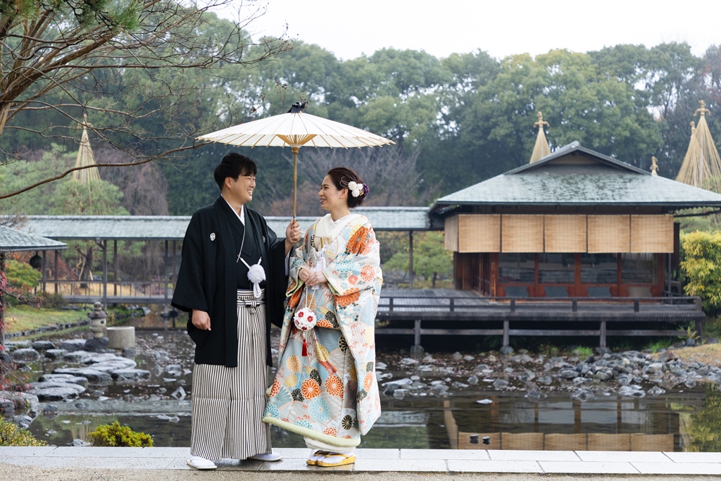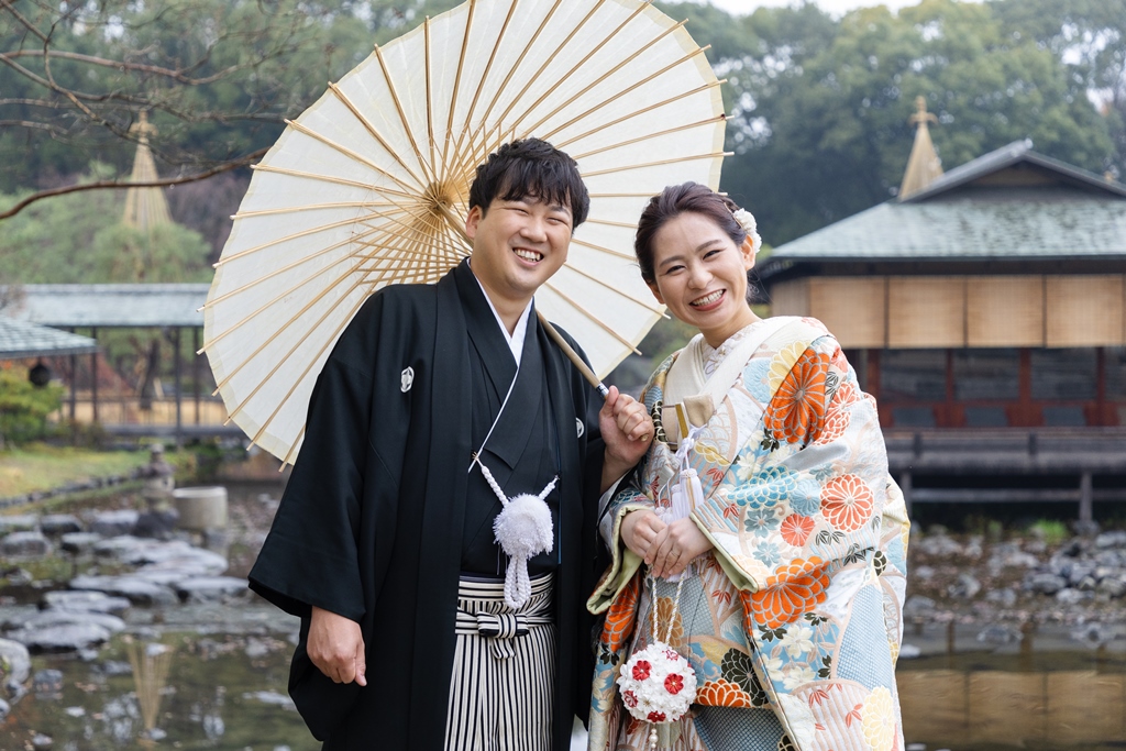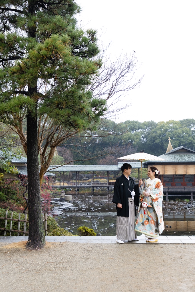ご希望の白鳥庭園での撮影を楽しんでいただけましたね♪冬の風物詩である雪吊りはもちろん、暖冬でまだ紅葉も残っていたので、白鳥庭園らしい絶景の中での撮影となりました☆