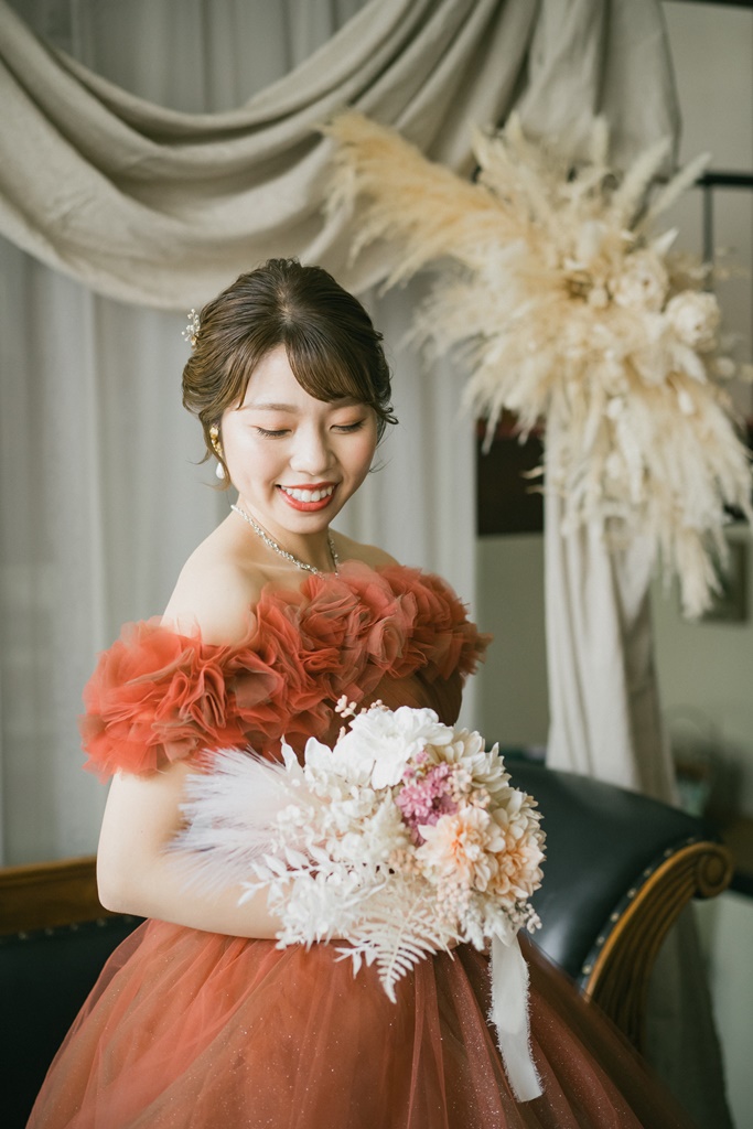 カラードレスでのアトリエスタジオ撮影、お疲れ様でした。ふんわり可愛いプリンセスラインのカラードレスがとってもお似合いの新婦様♡