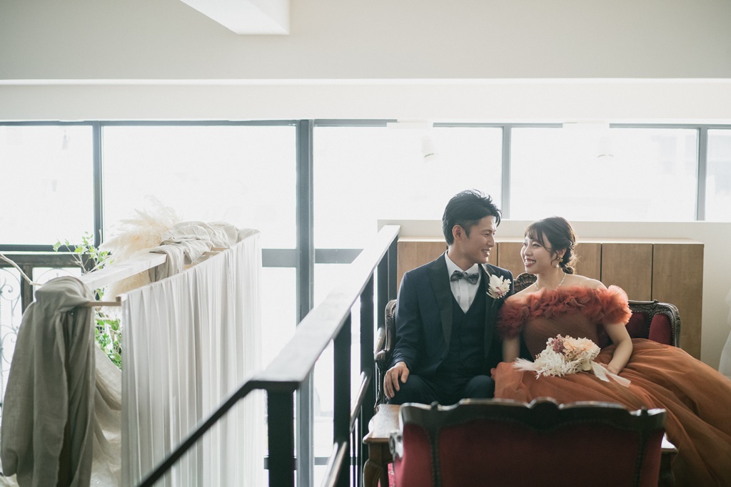 シックでお洒落なアトリエスタジオで笑顔のウェディングフォト