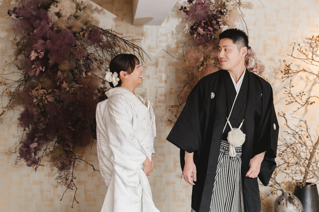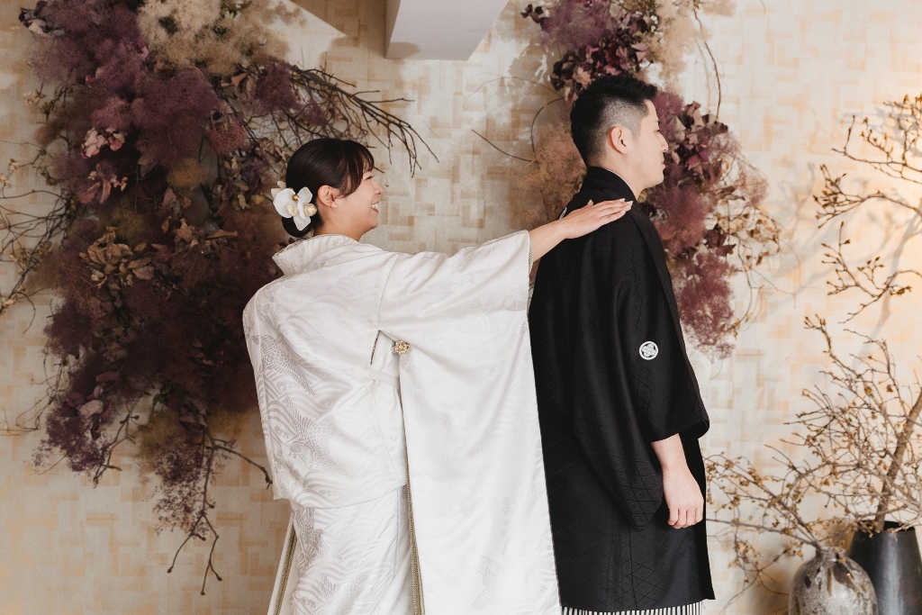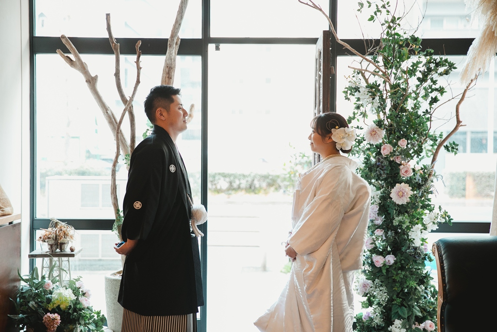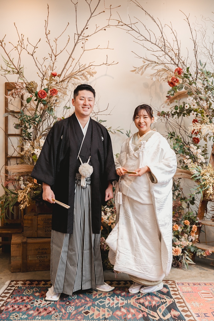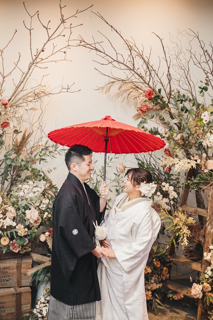 白無垢と色掛下の組み合わせとスタジオの雰囲気がとてもマッチしておりオシャレなお写真たちになっており素敵でした。