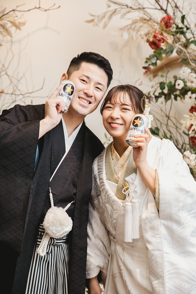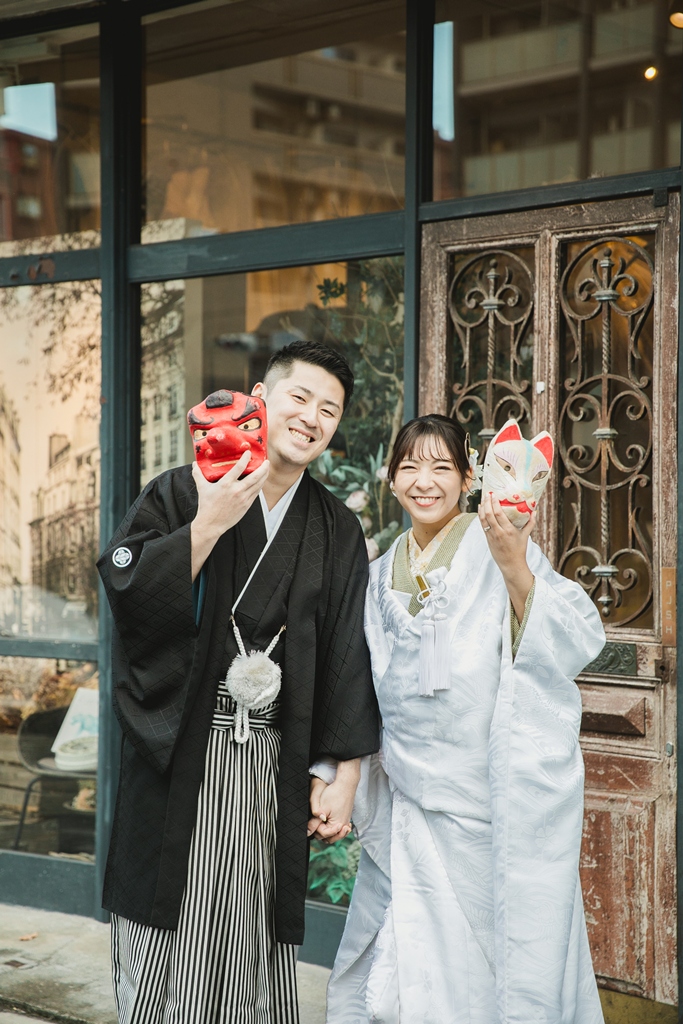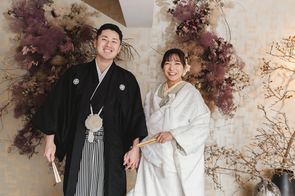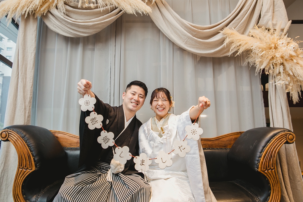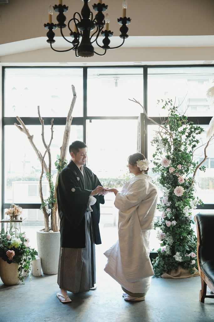 白無垢と色掛下の組み合わせとスタジオの雰囲気がとてもマッチしておりオシャレなお写真たちになっており素敵でした。