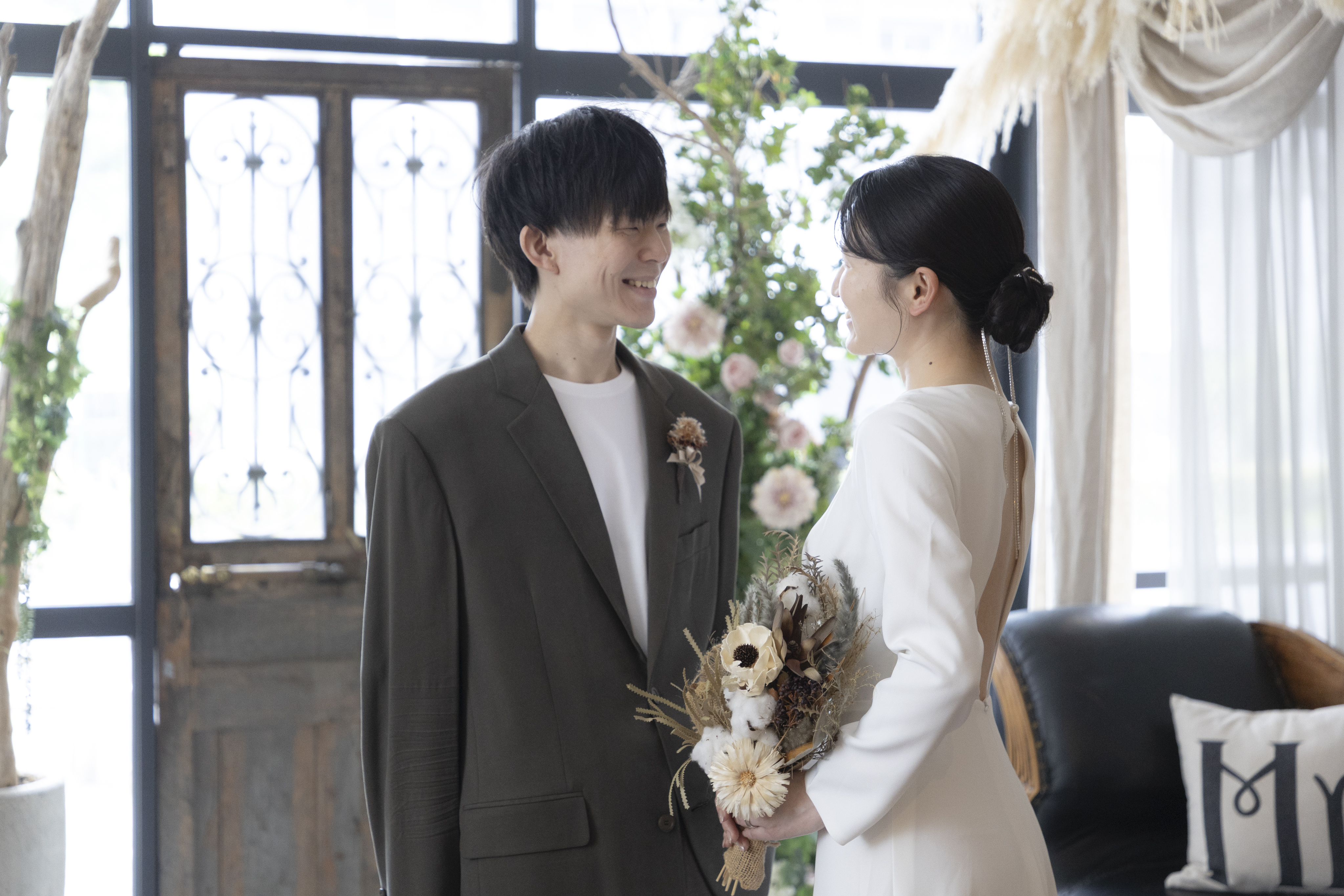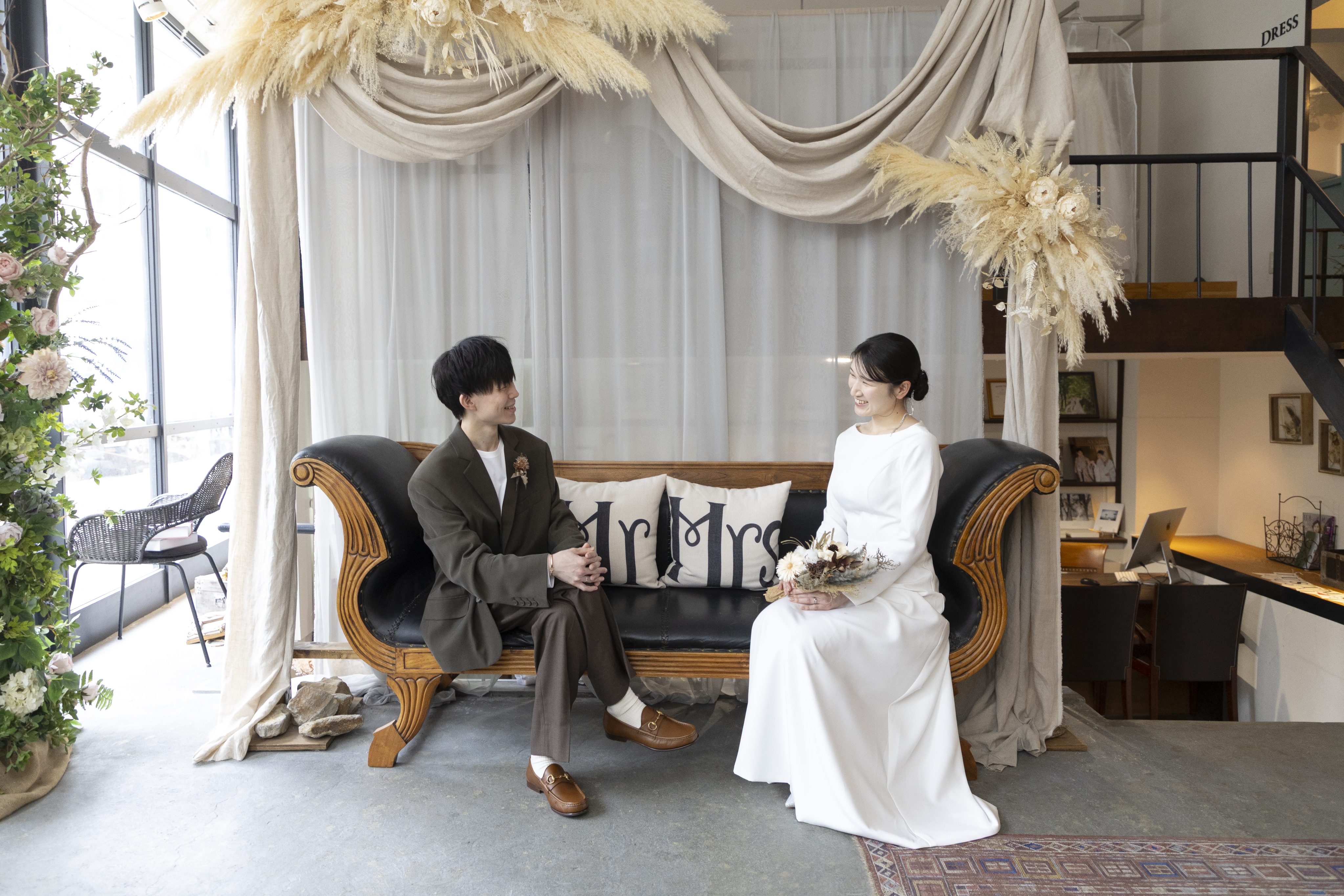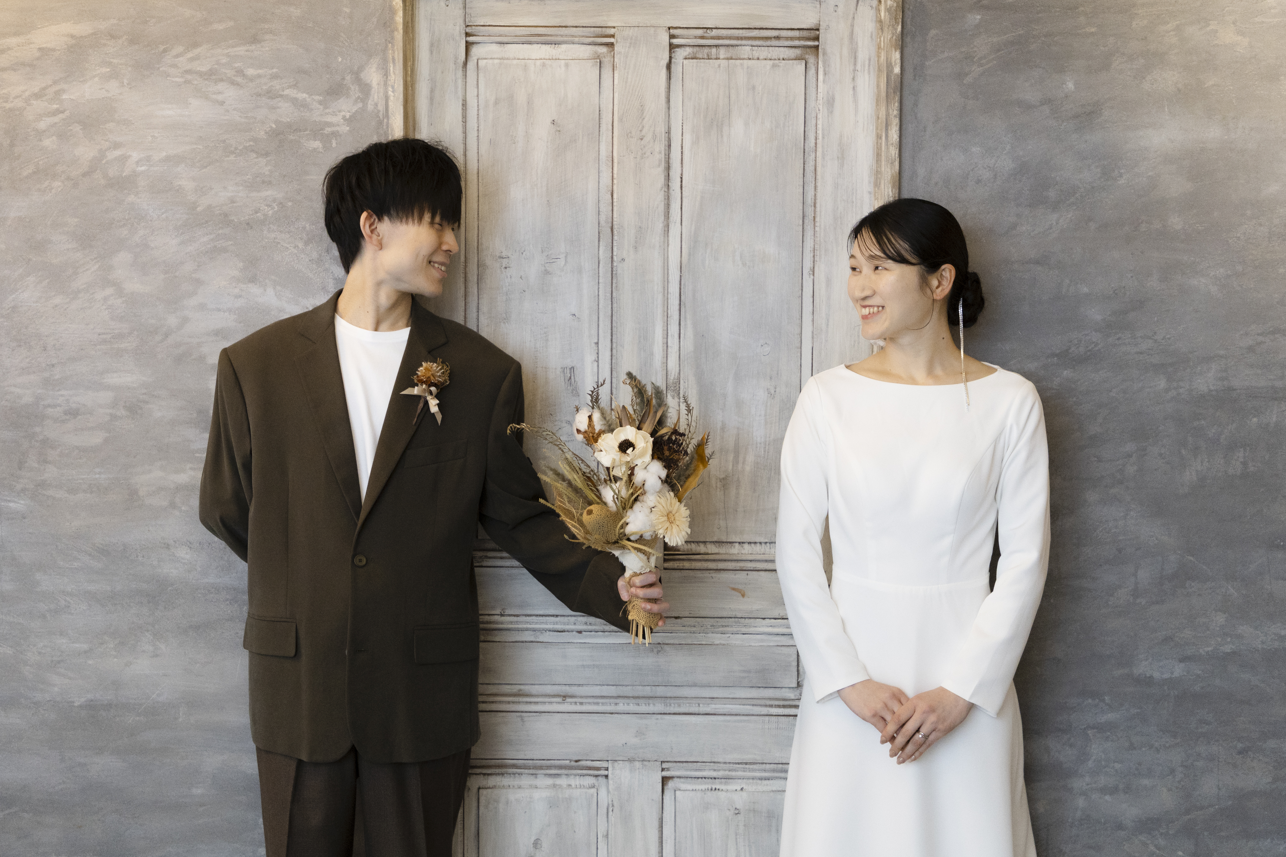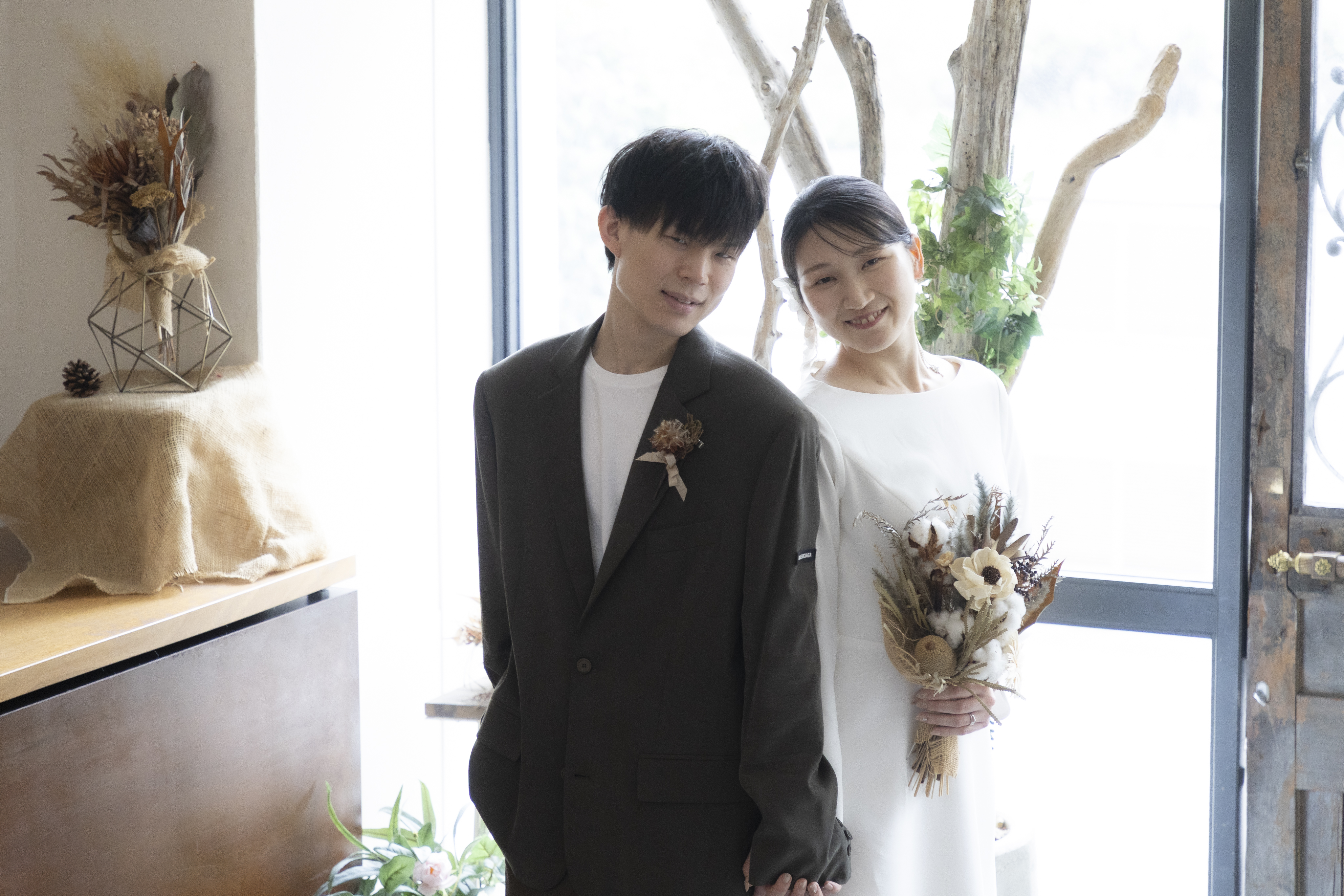 新郎様の落ち着いたカーキに、新婦様のシンプルなウェディングドレスで大人で落ち着いたスタジオにぴったりな衣装でしたね!