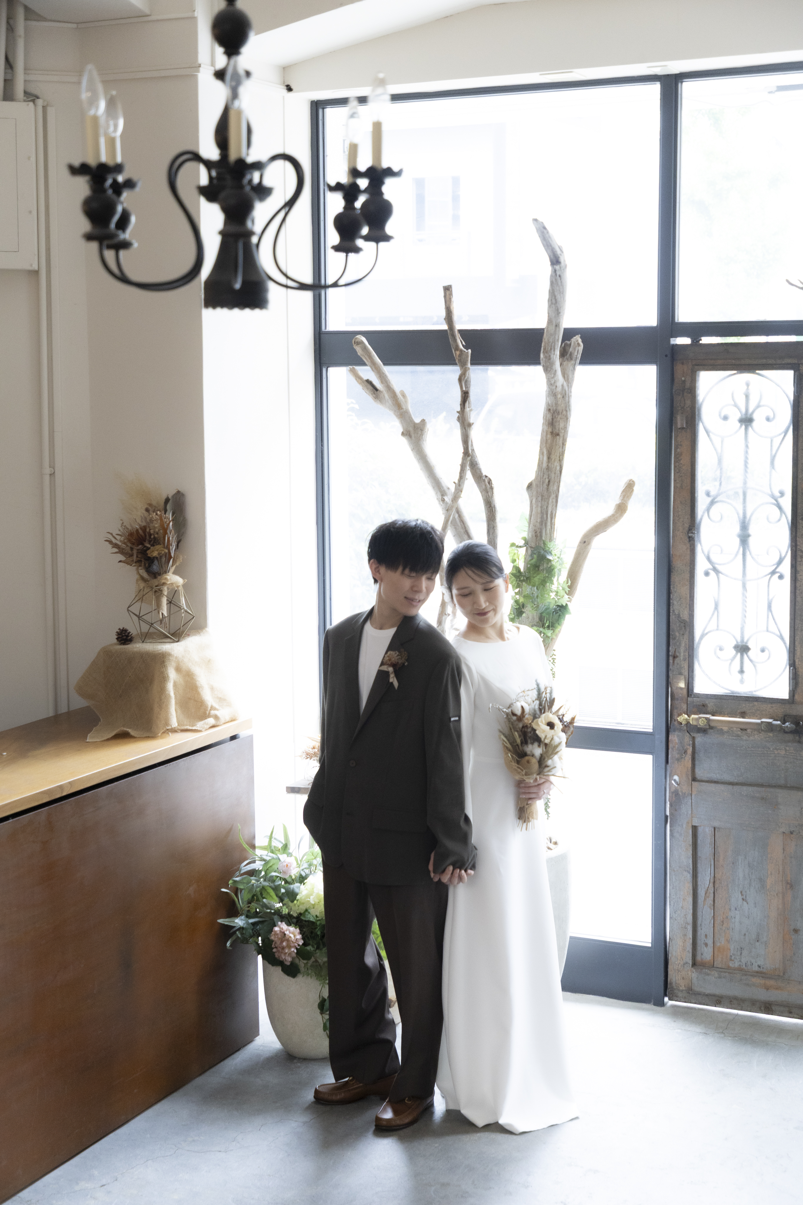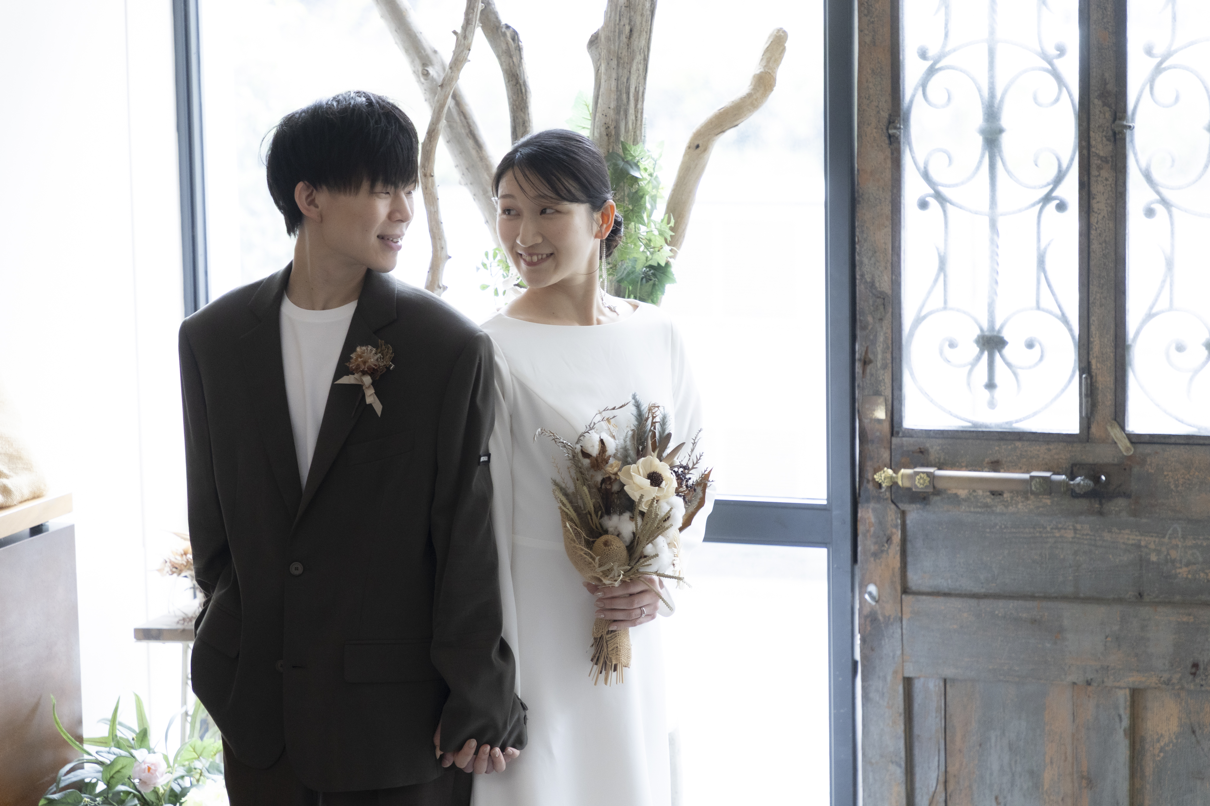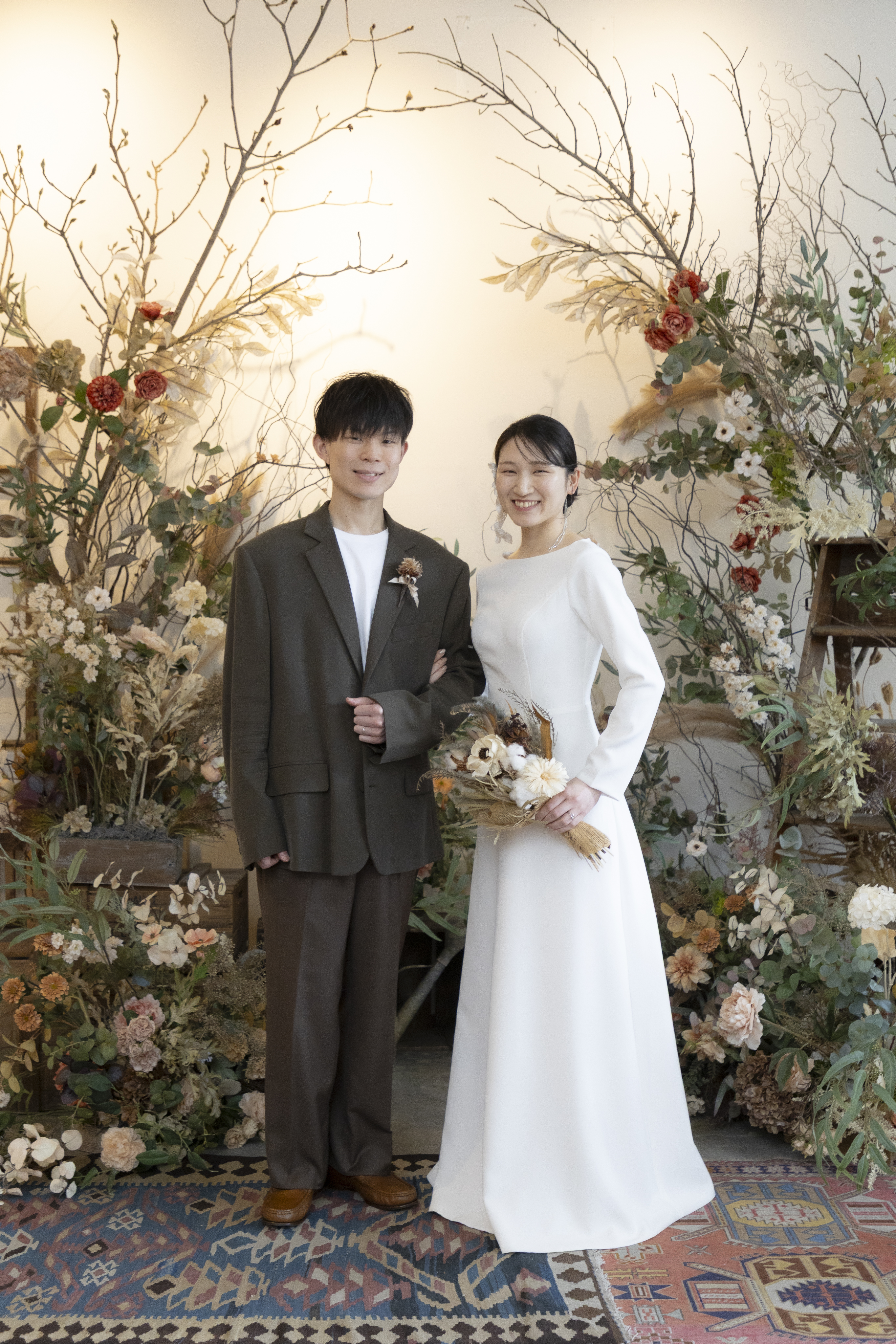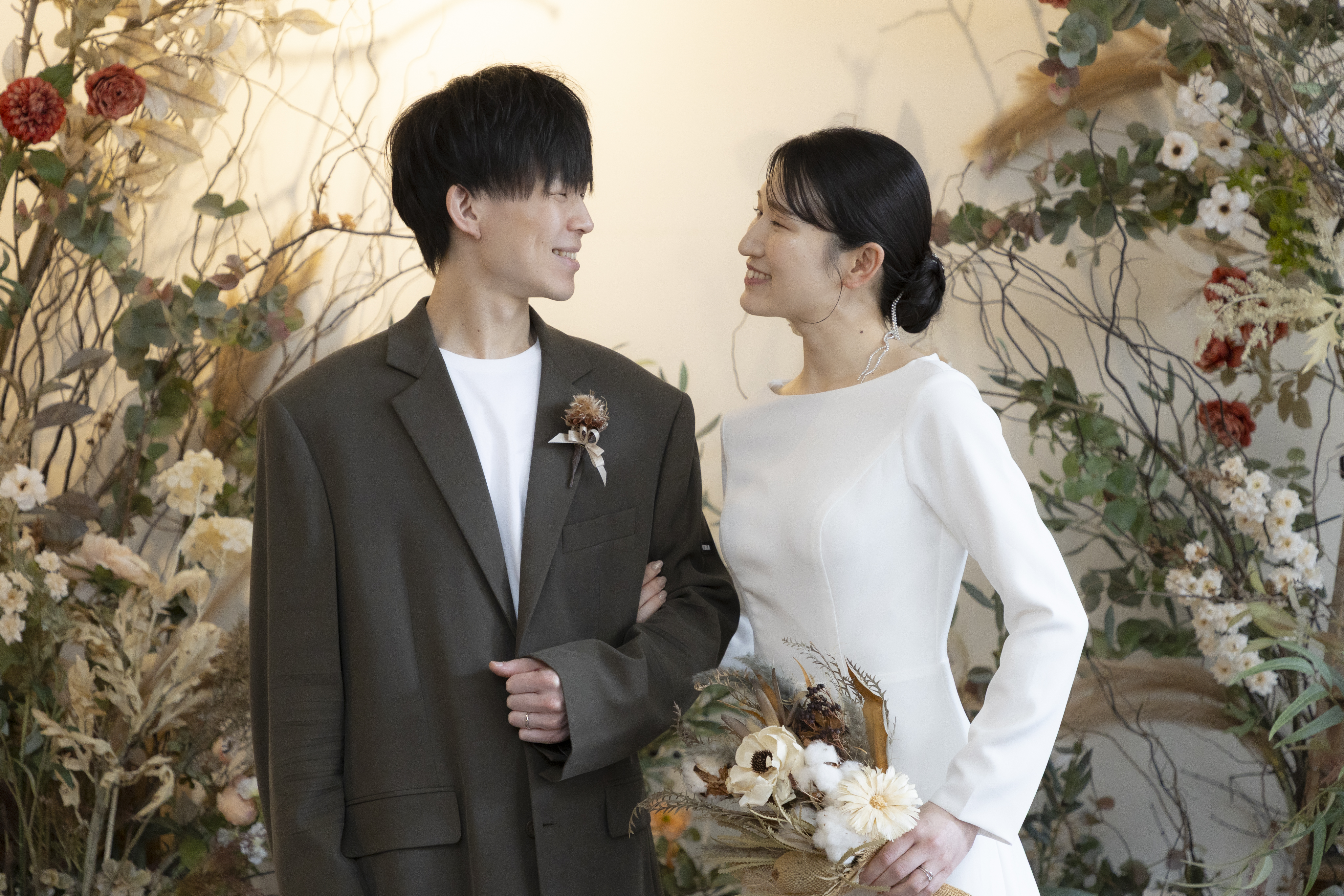 新郎様の落ち着いたカーキに、新婦様のシンプルなウェディングドレスで大人で落ち着いたスタジオにぴったりな衣装でしたね!