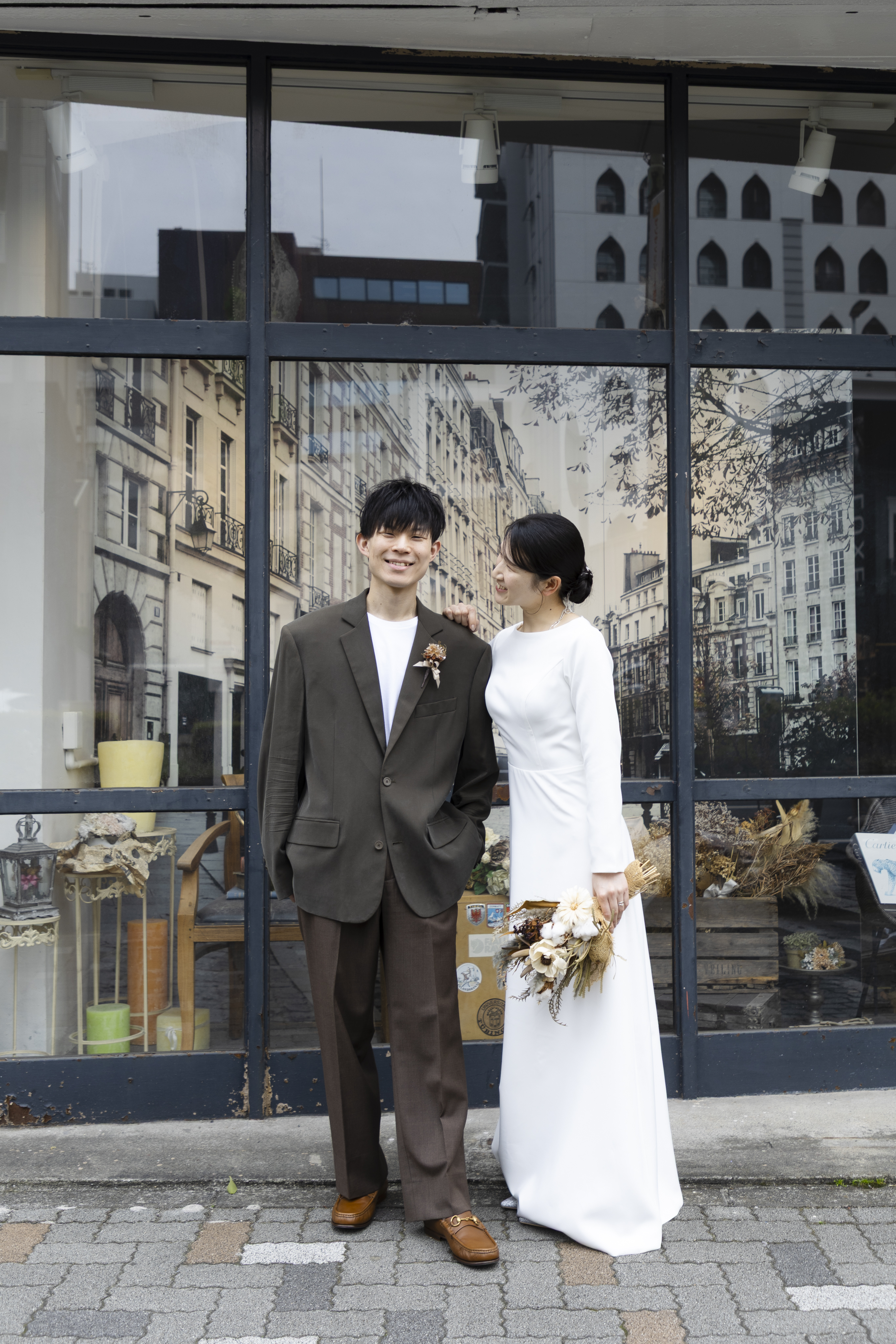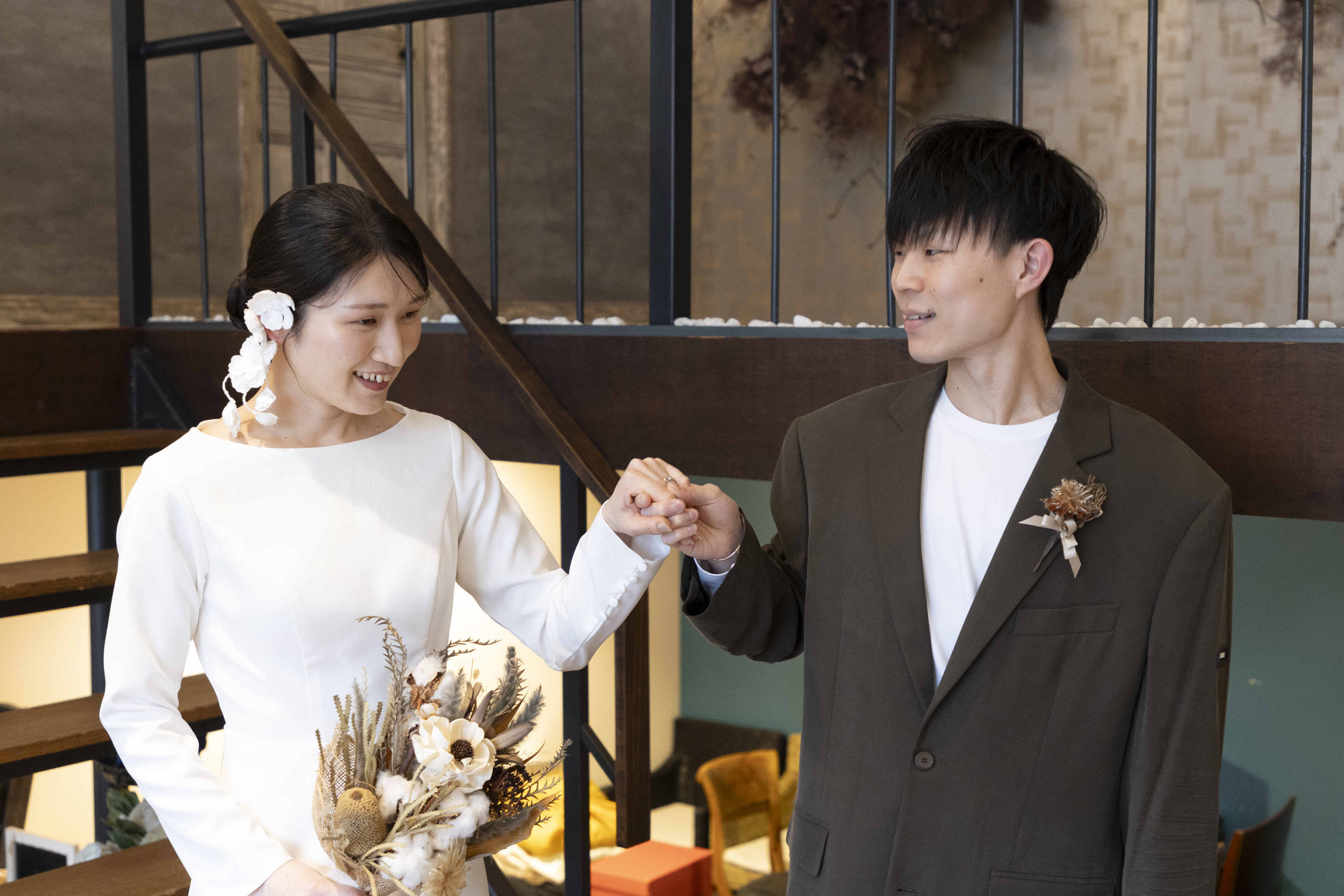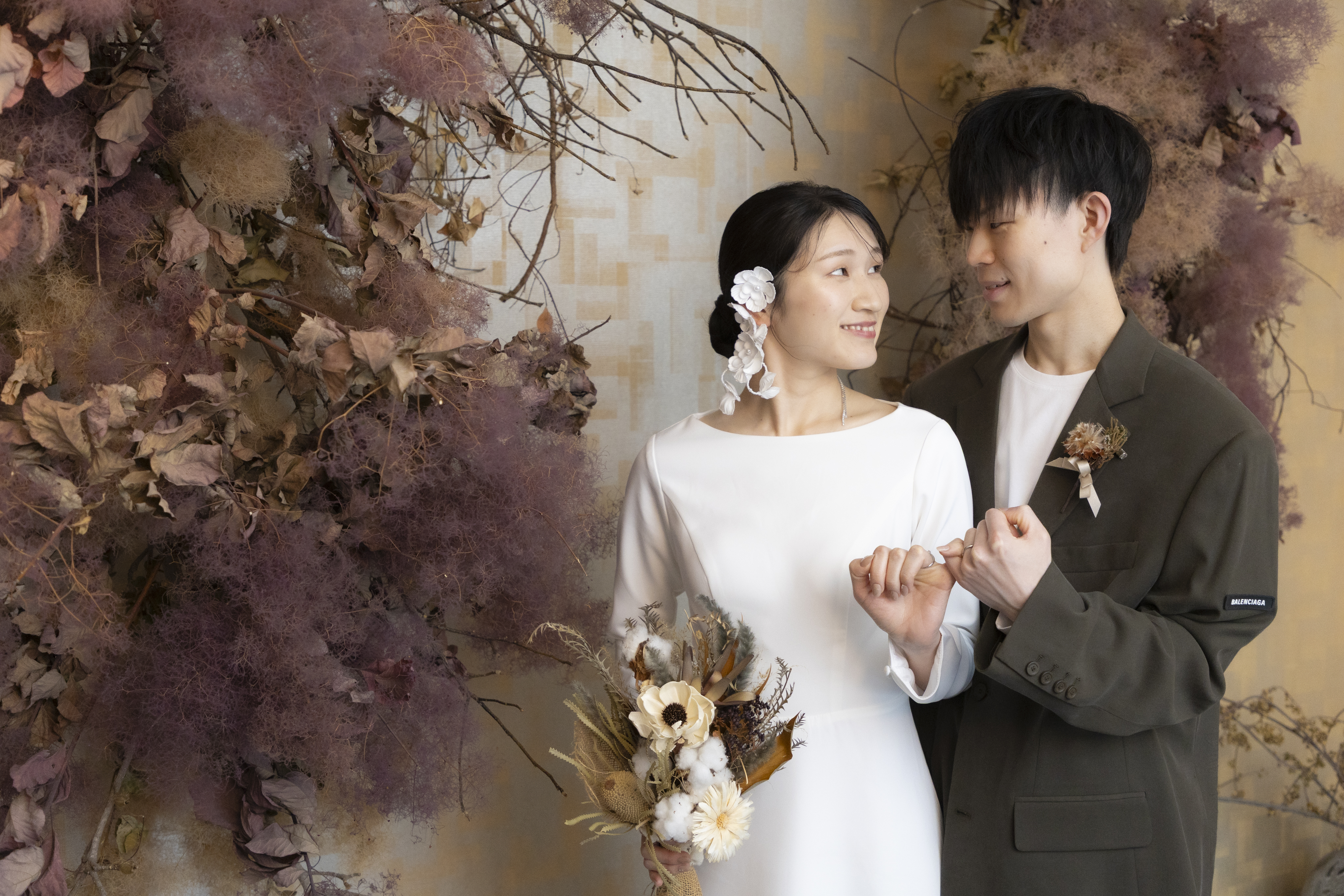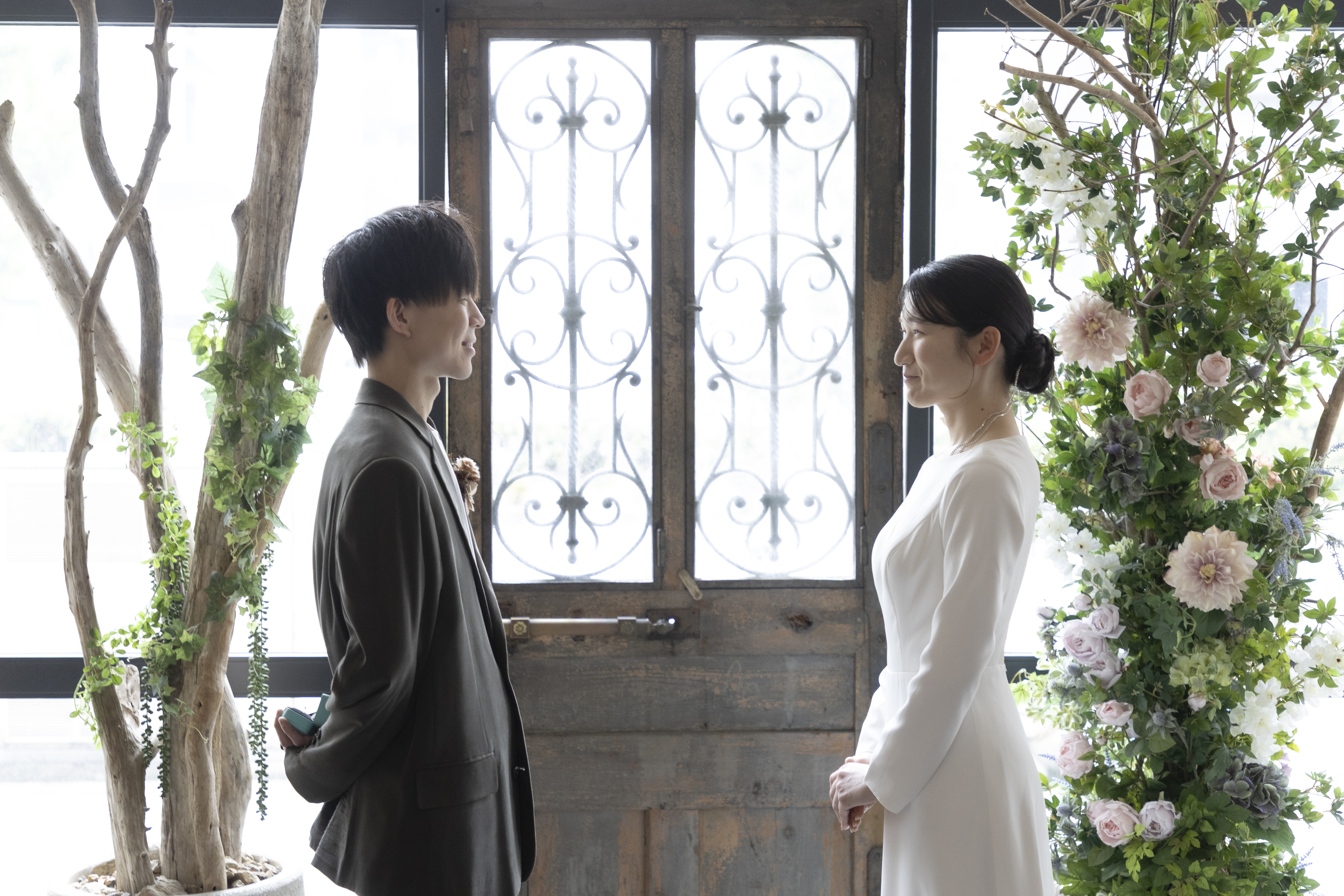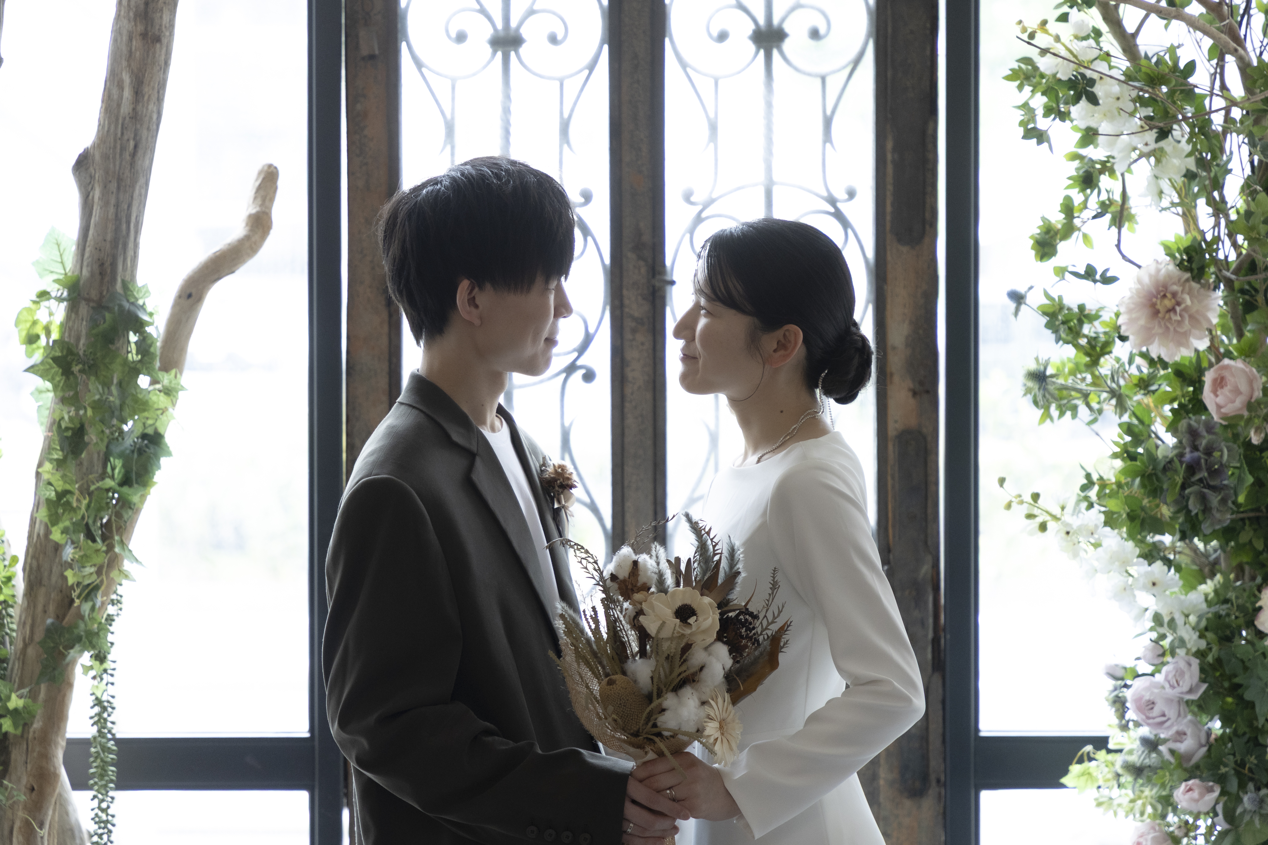 新郎様の落ち着いたカーキに、新婦様のシンプルなウェディングドレスで大人で落ち着いたスタジオにぴったりな衣装でしたね!