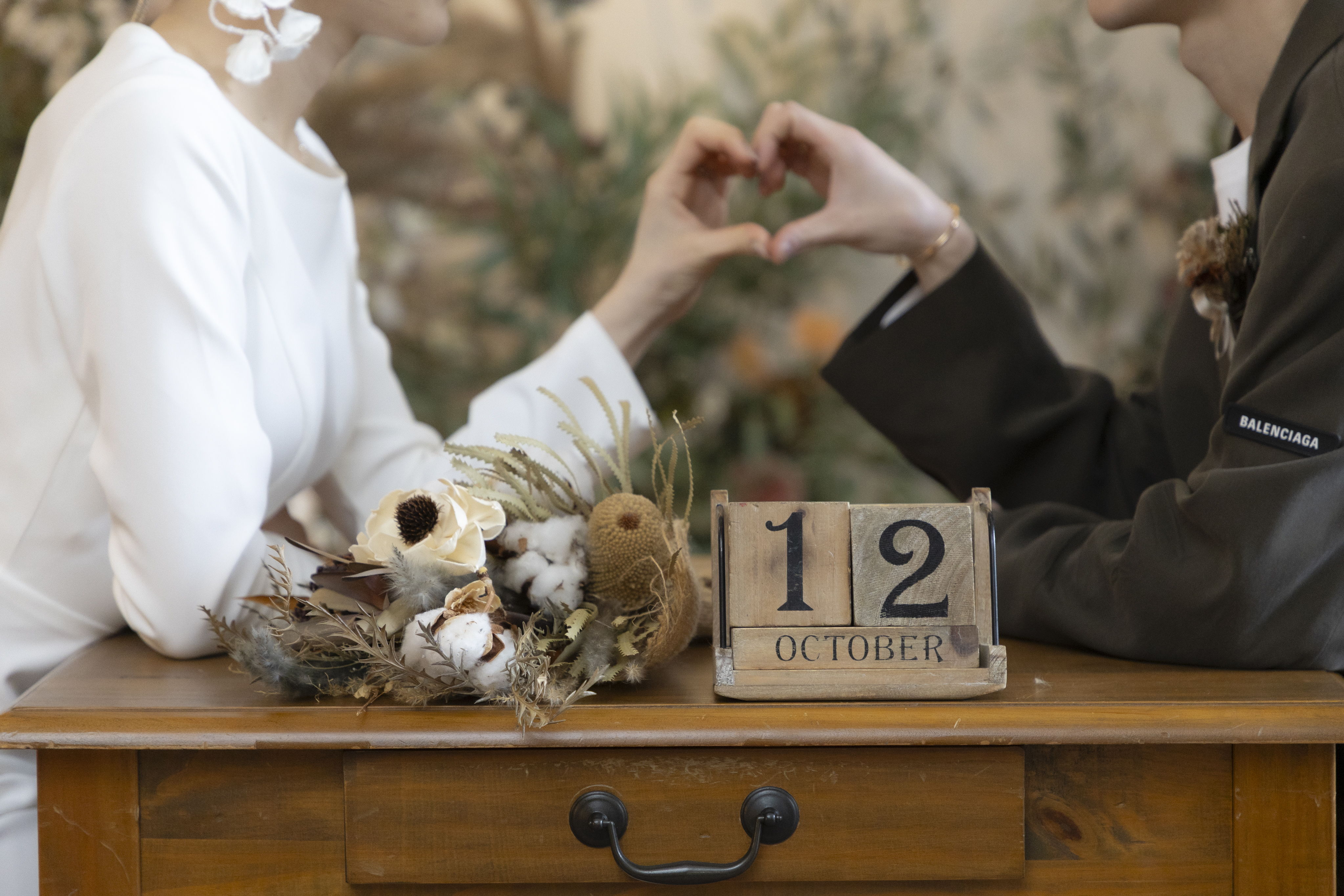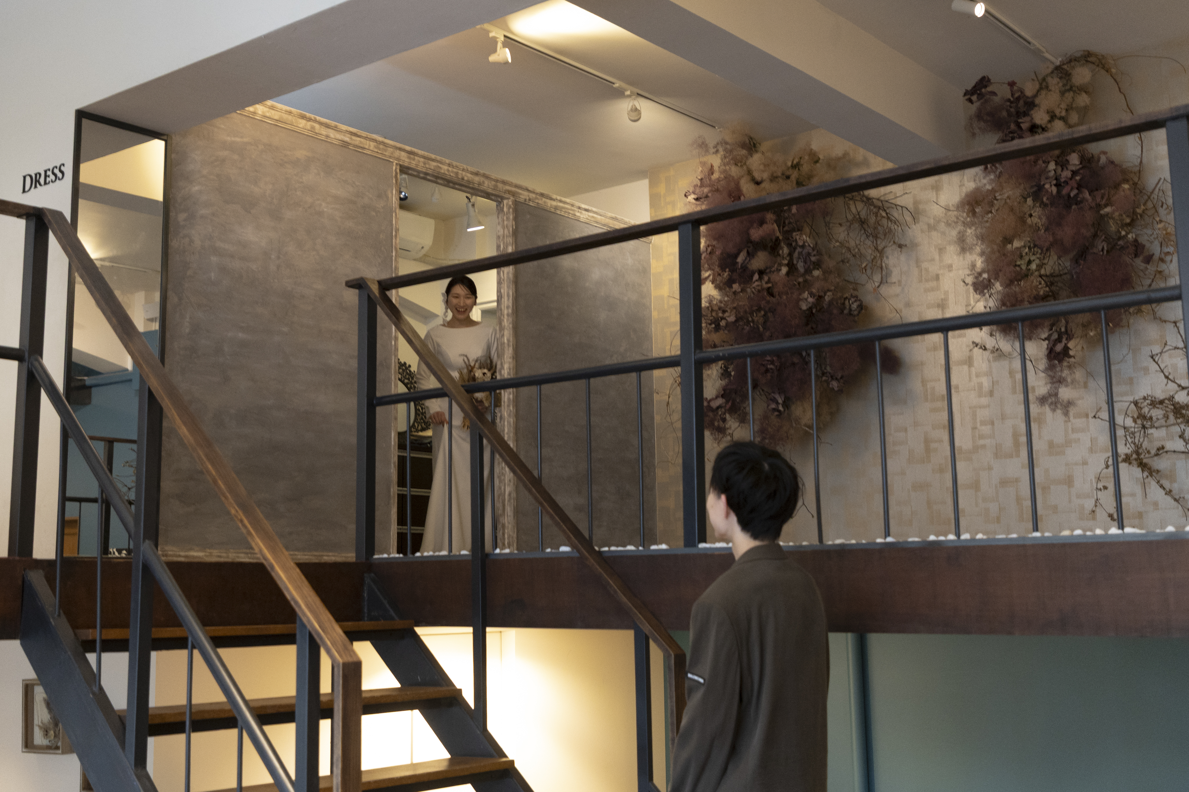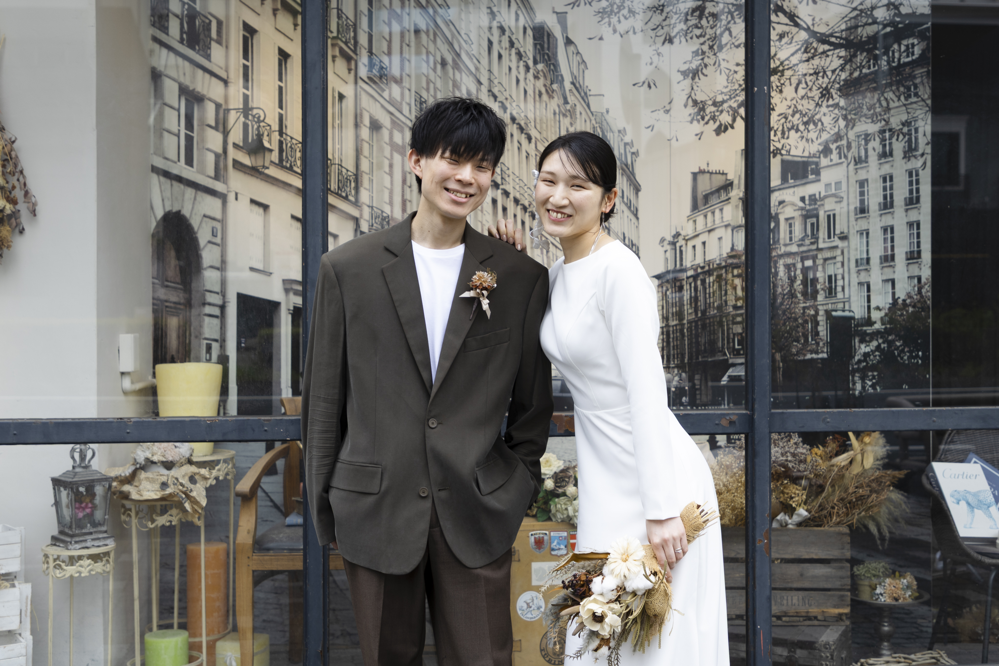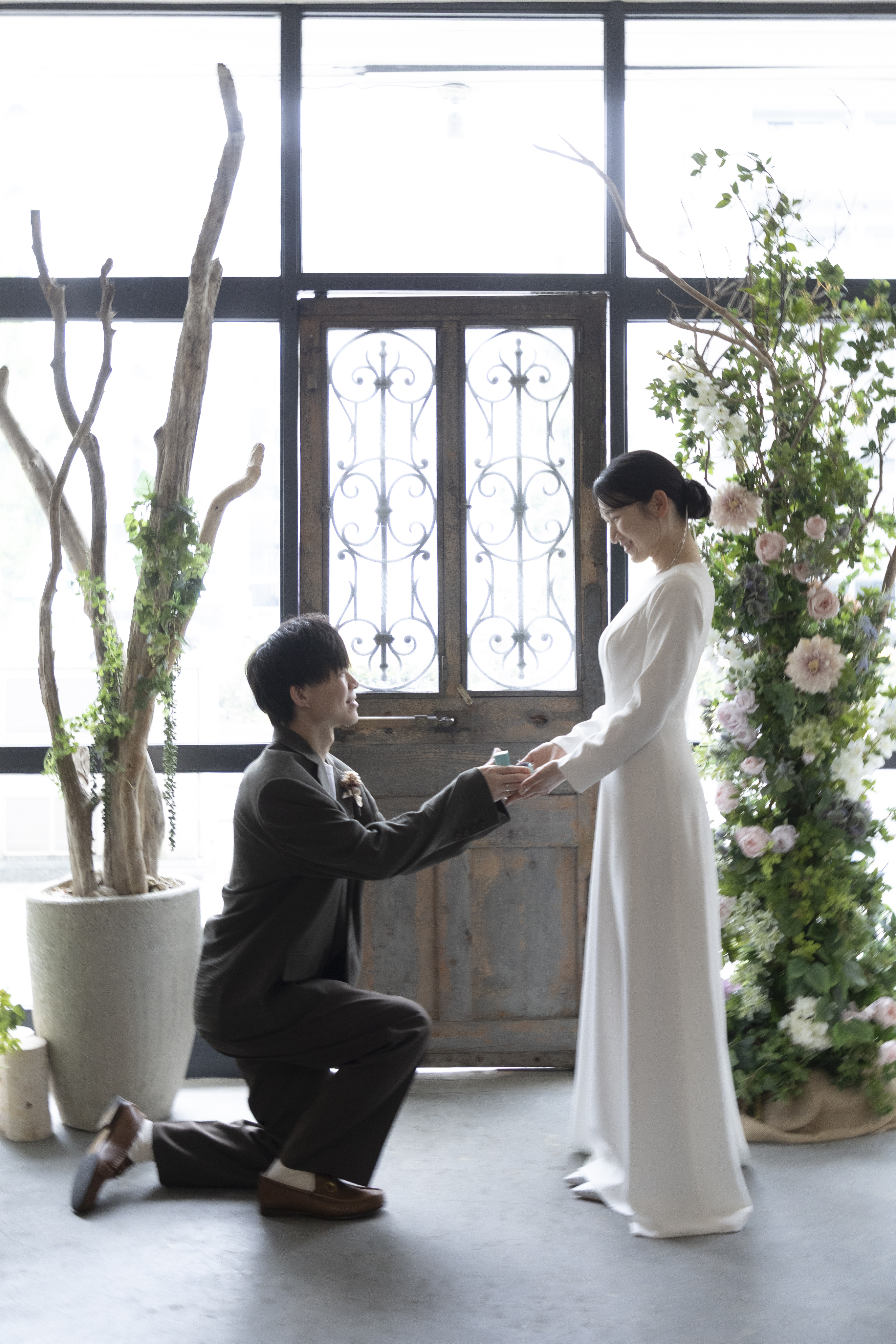 新郎様の落ち着いたカーキに、新婦様のシンプルなウェディングドレスで大人で落ち着いたスタジオにぴったりな衣装でしたね!