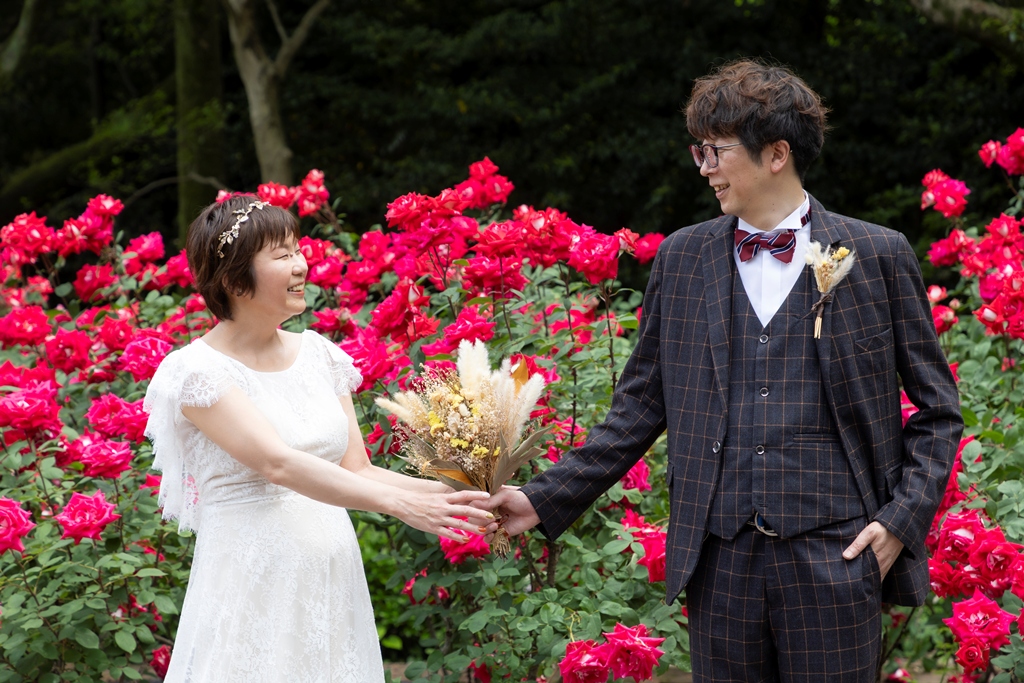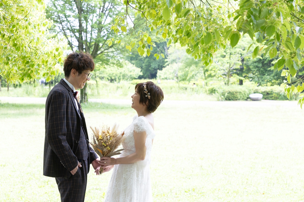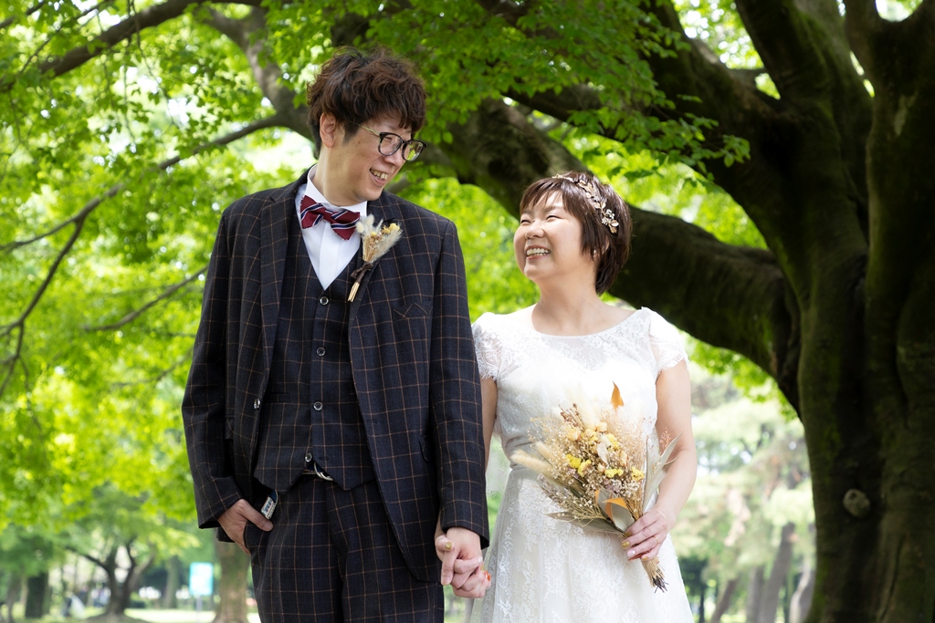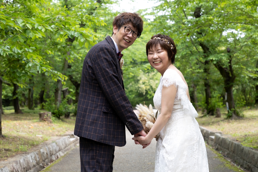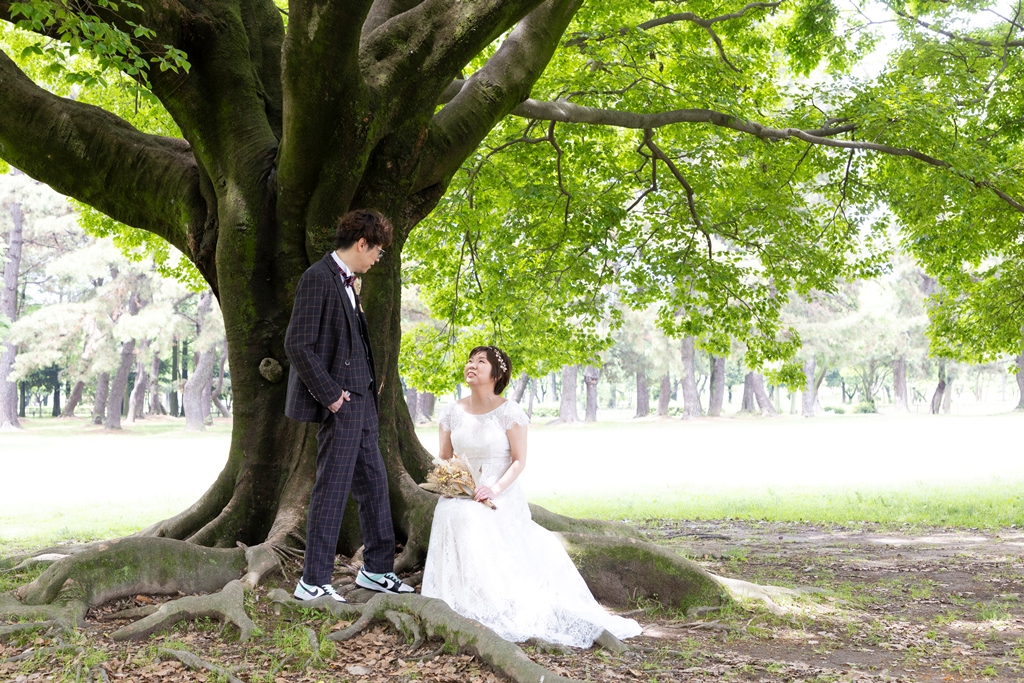 最初はスタジオ撮影を検討されていたお二人でしたが、家族をたくさん呼びたいということで公園での撮影をおすすめさせていただきました!