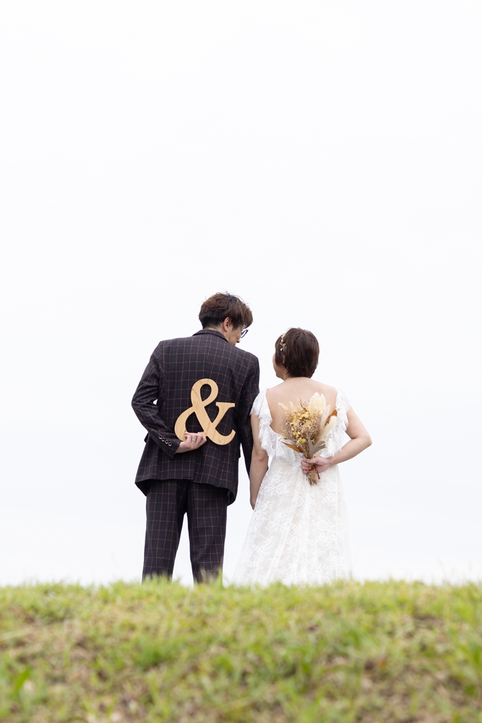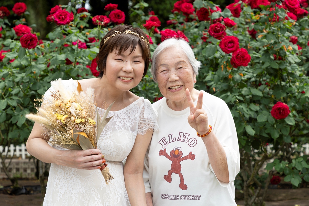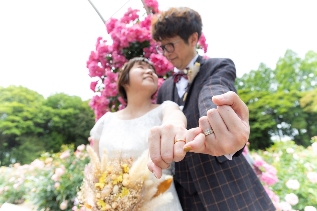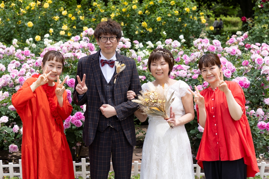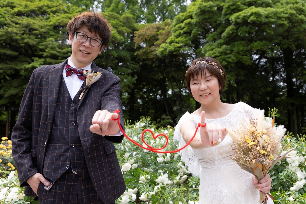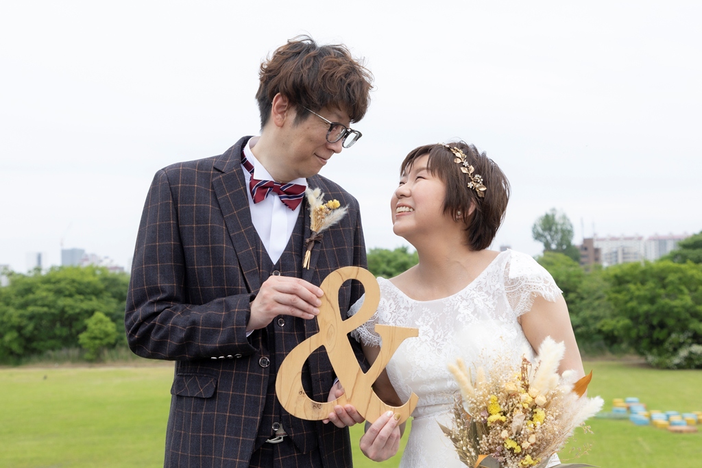 最初はスタジオ撮影を検討されていたお二人でしたが、家族をたくさん呼びたいということで公園での撮影をおすすめさせていただきました!