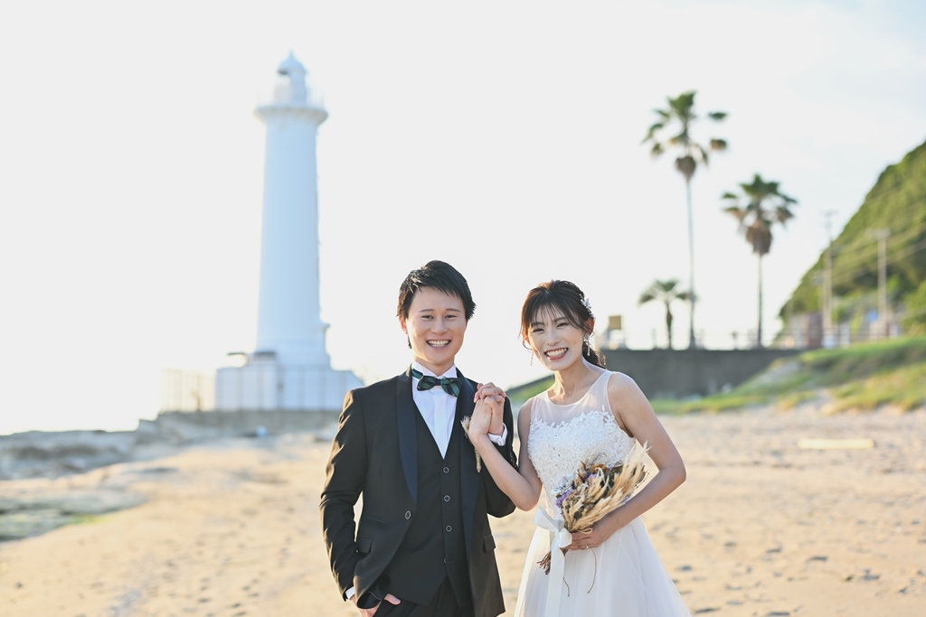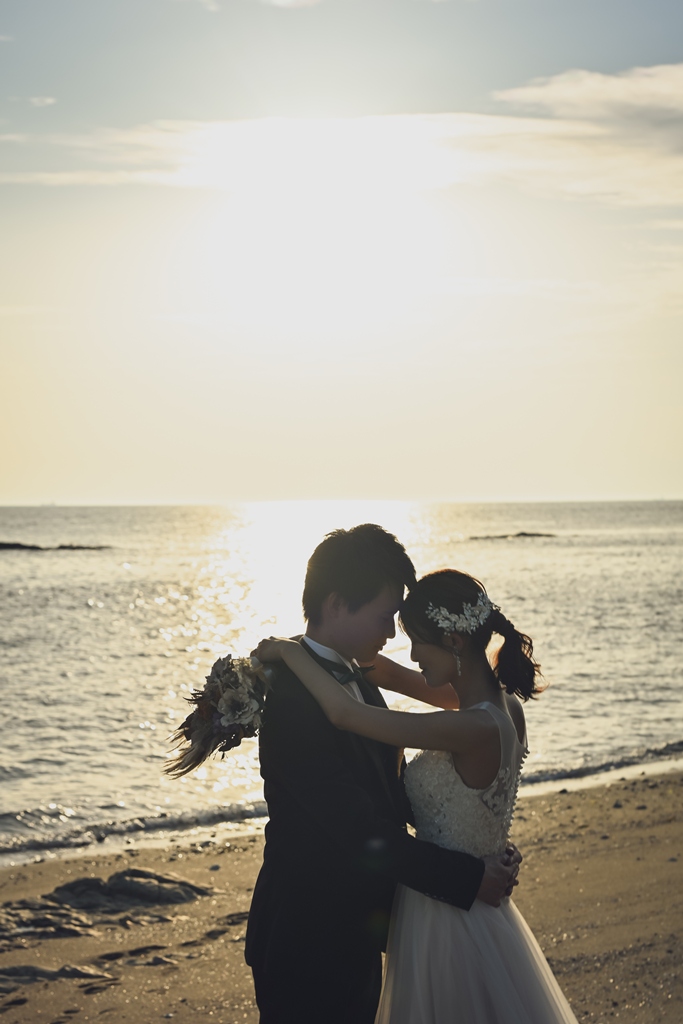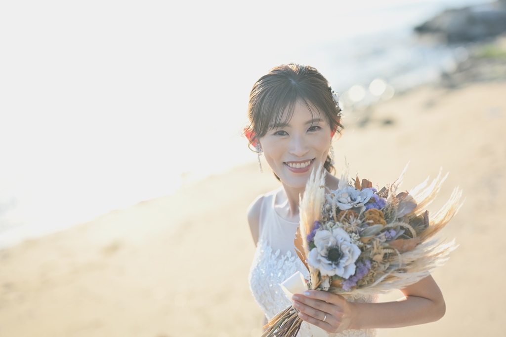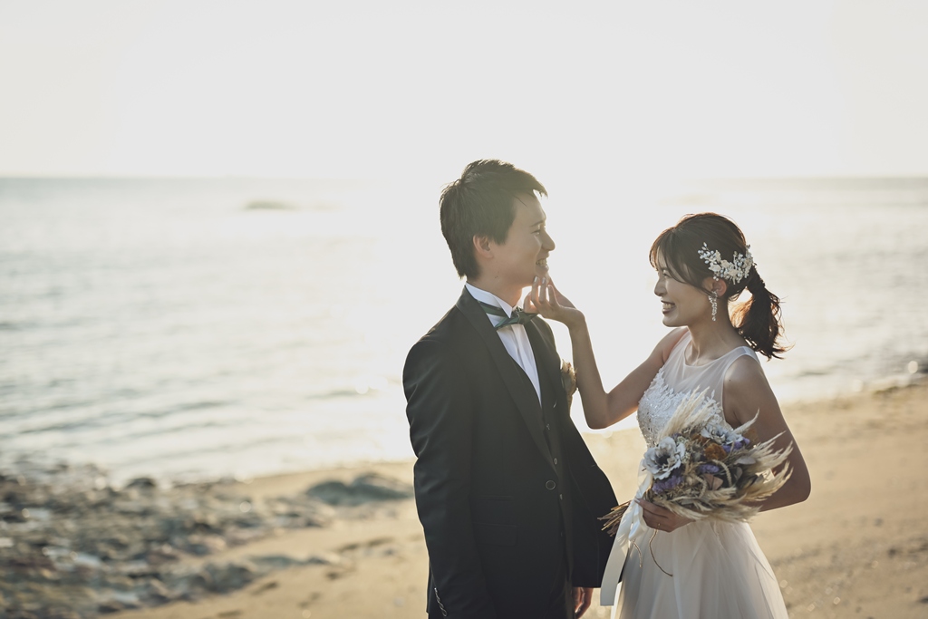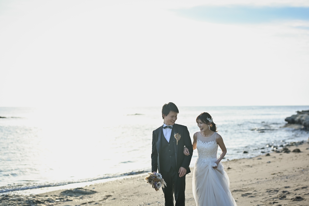 そして、数ある撮影サービスの中から私たちにその一日を託してくださったこと、心より感謝申し上げます。太陽がやさしく降りそそぐ海辺に、純白のドレスが美しく映え、風に揺れるベールがまるで祝福のようにおふたりを包み込む。
