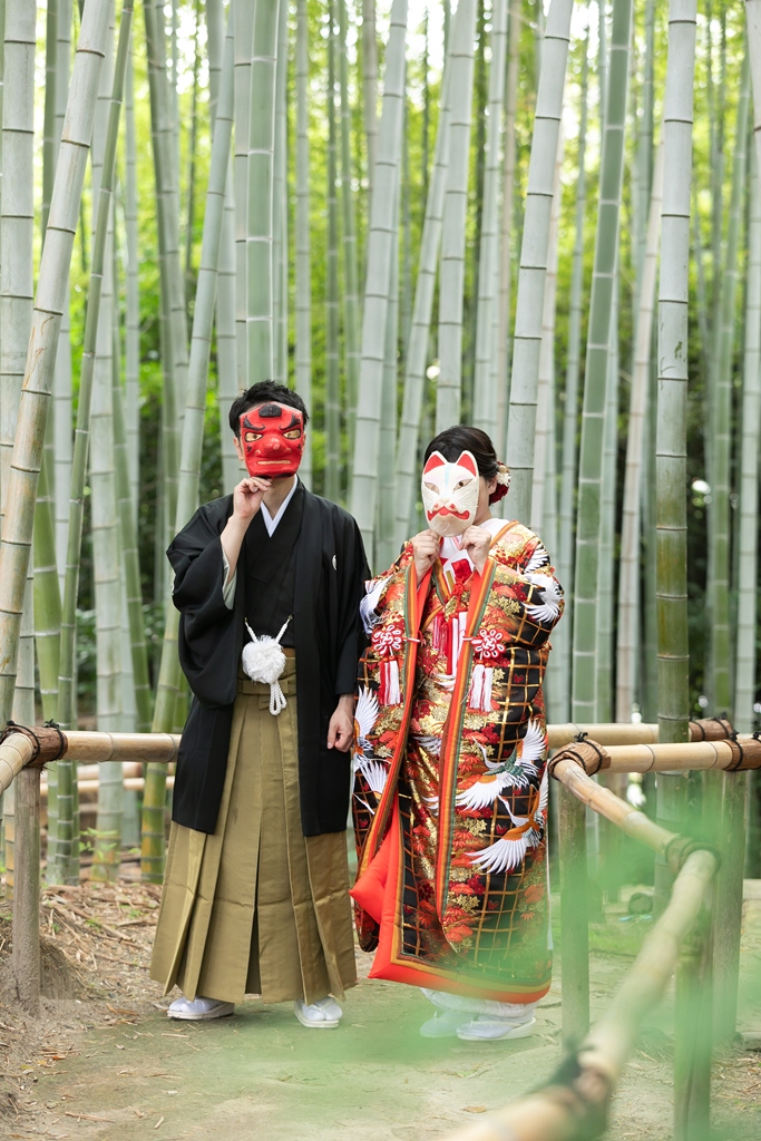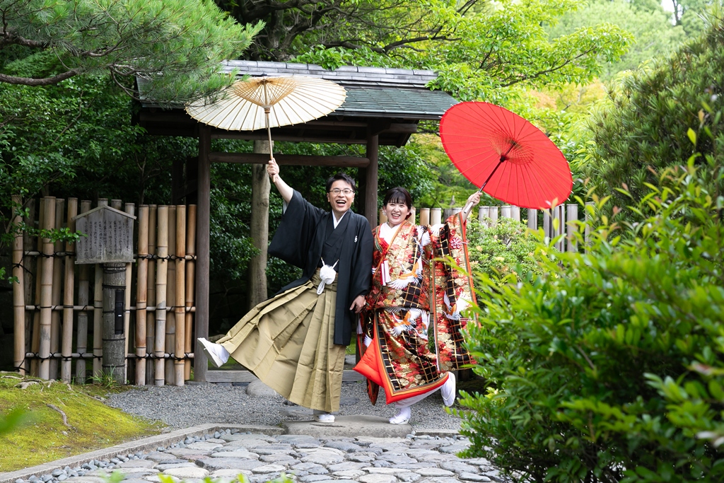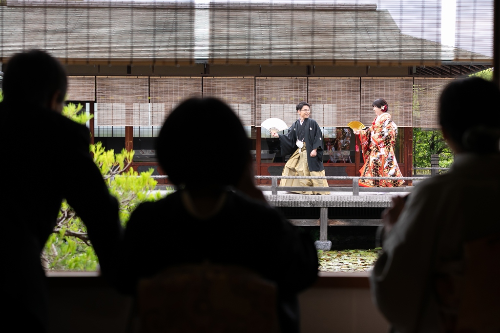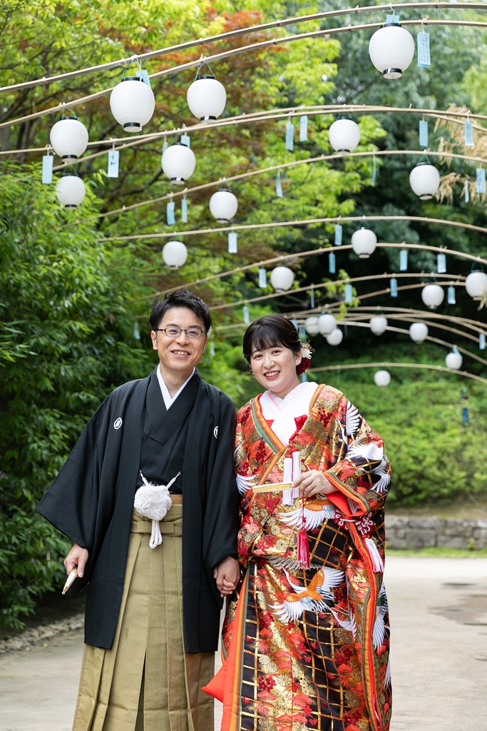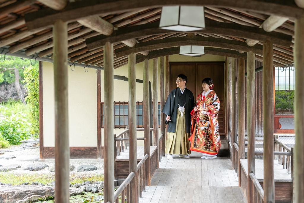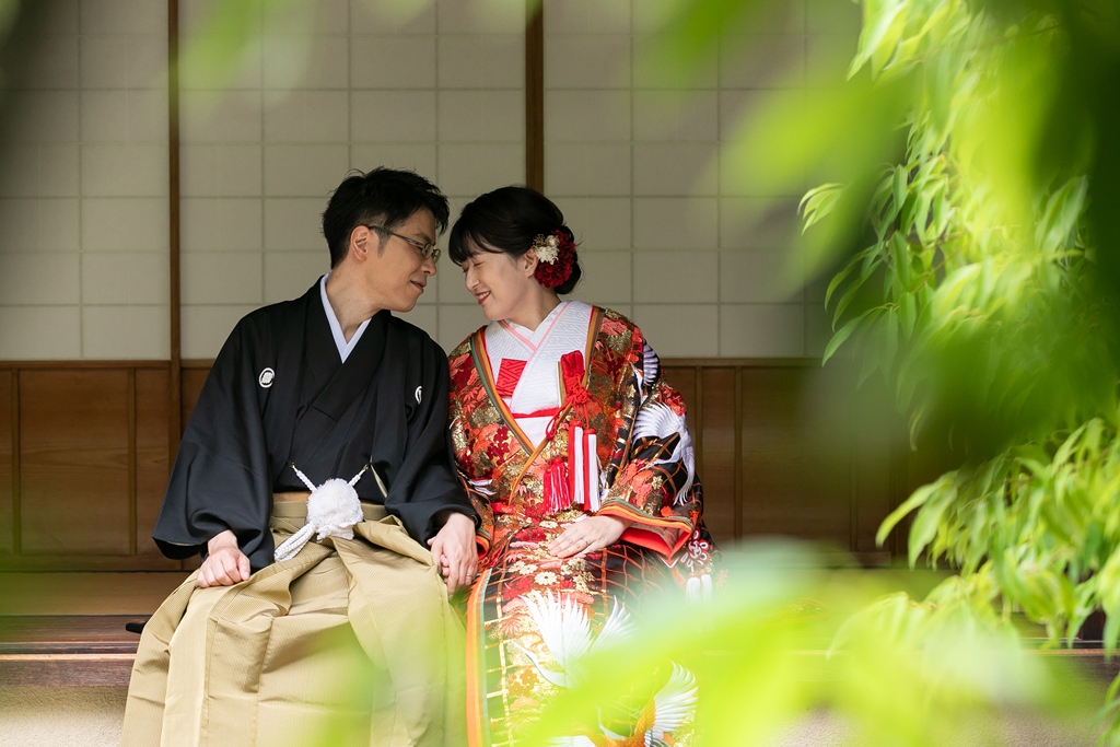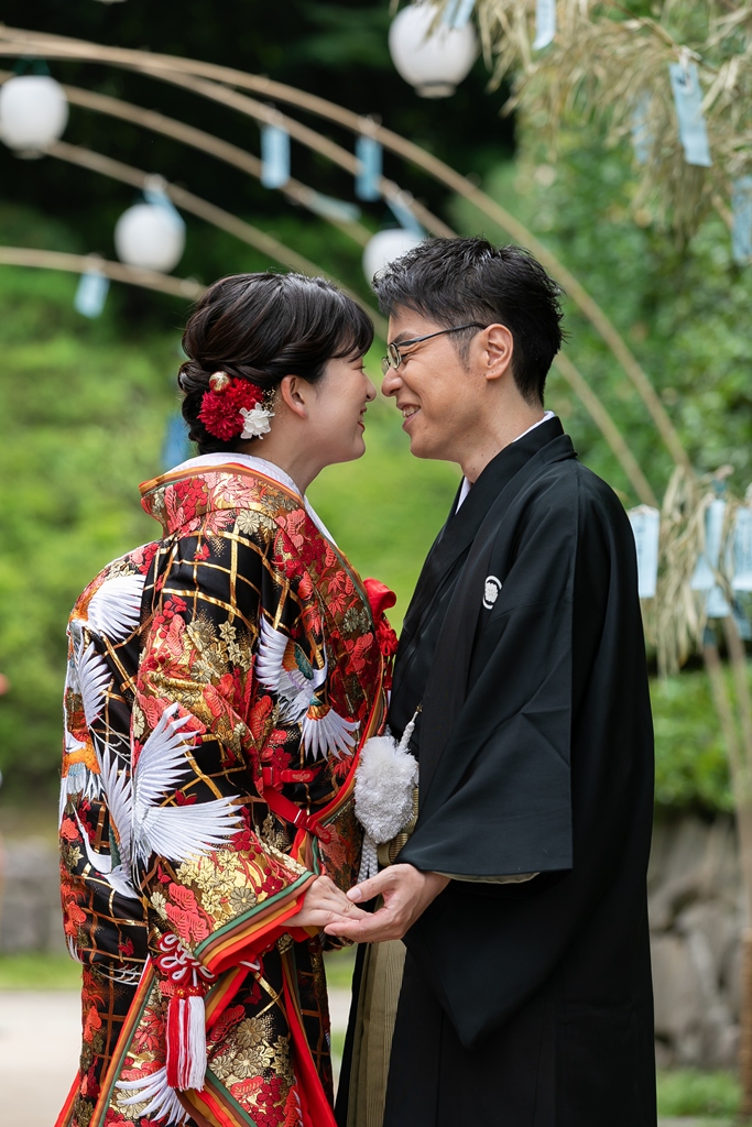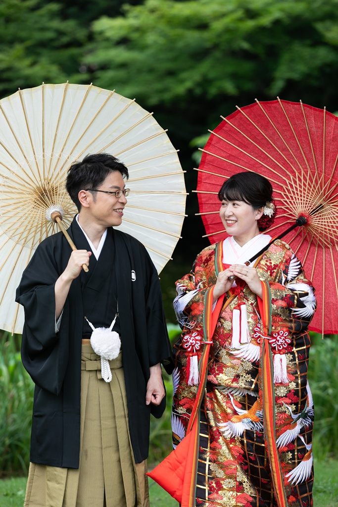 まず、白鳥庭園での和装撮影では、四季折々の自然が見せてくれる繊細な景色の中で、おふたりの姿がまるで日本の絵巻物から抜け出したかのように映えていました。緑に包まれた中での番傘ショットや、池にかかる橋の上でのツーショットなど、どの瞬間もまさに“和”の美を体現するような光景でした。お着物の色や柄、小物の一つひとつまで丁寧に選ばれたことが、写真の端々からしっかりと伝わってきました。