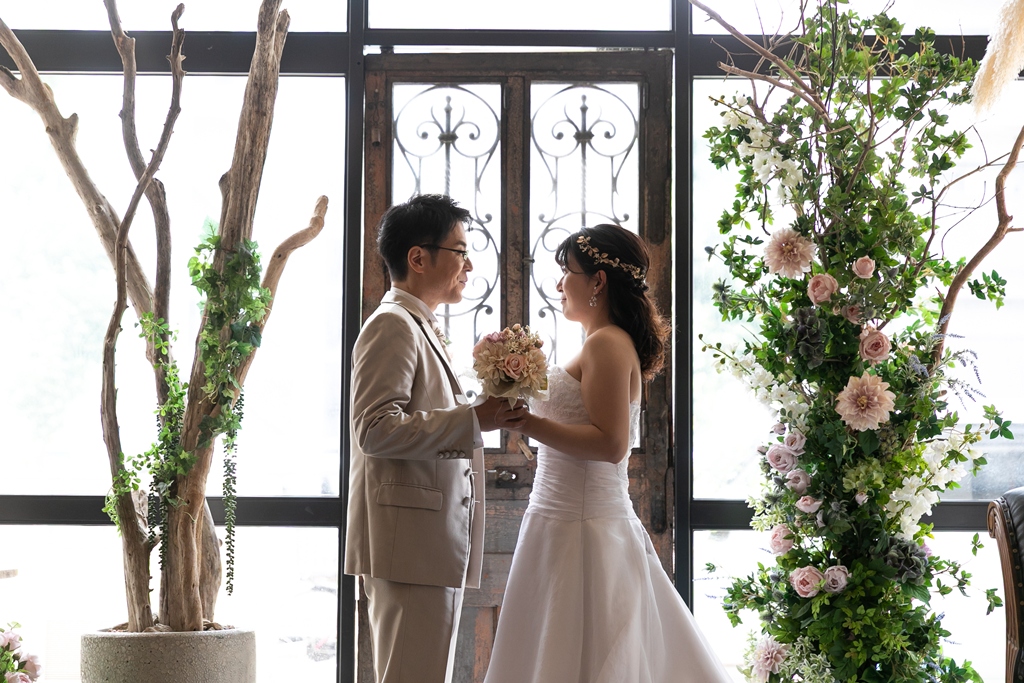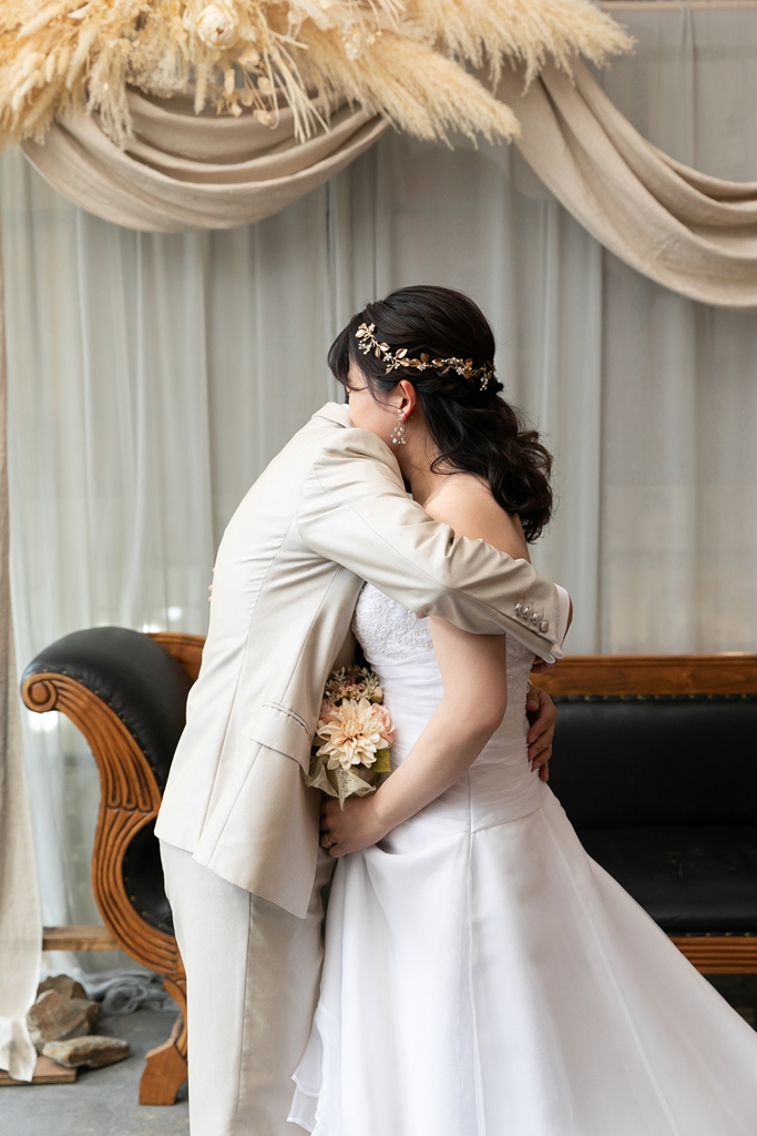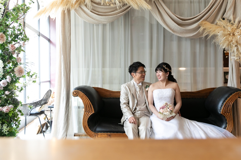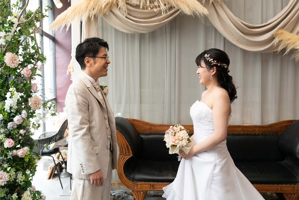 一方、名古屋スタジオでの洋装撮影では、スタジオならではの計算された光や空間の中で、おふたりの凛とした姿が一層際立っており、まるで映画のワンシーンのようなドラマチックな時間が流れていました。チャペルブースでは、自然な笑顔や、ふとしたしぐさにも深い意味が感じられ、長年歩んできた時間と、これから共に紡がれる未来のあたたかさが感じられる撮影となりました。