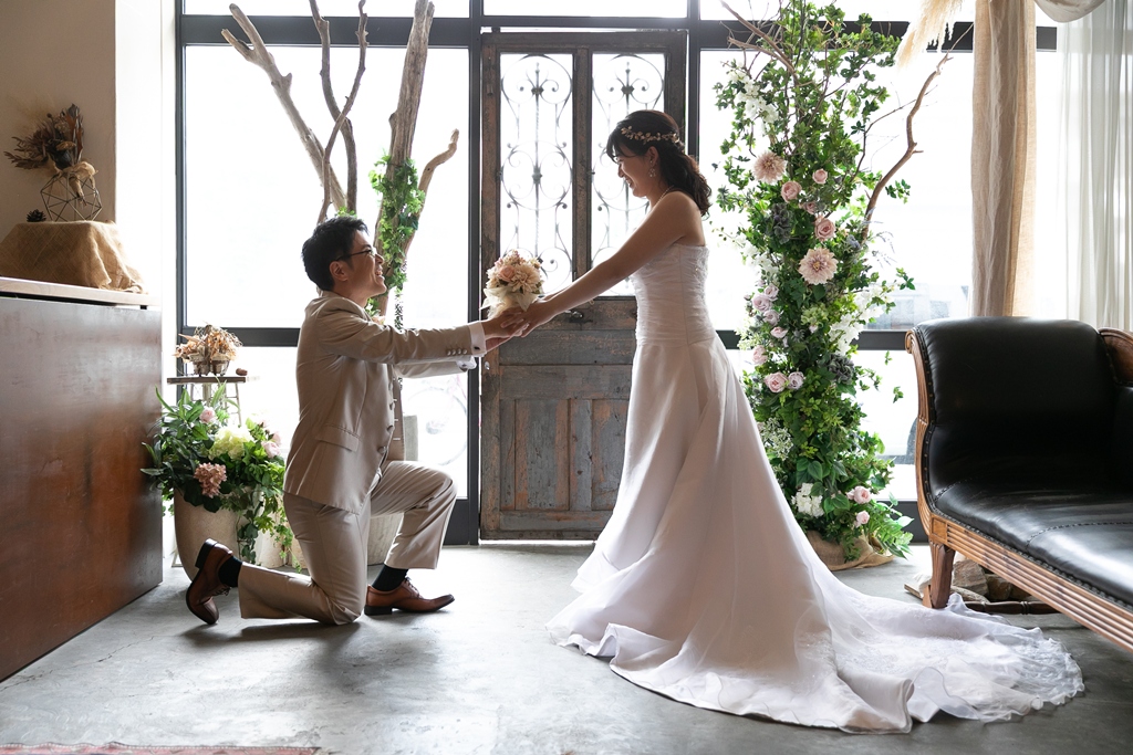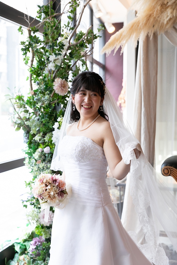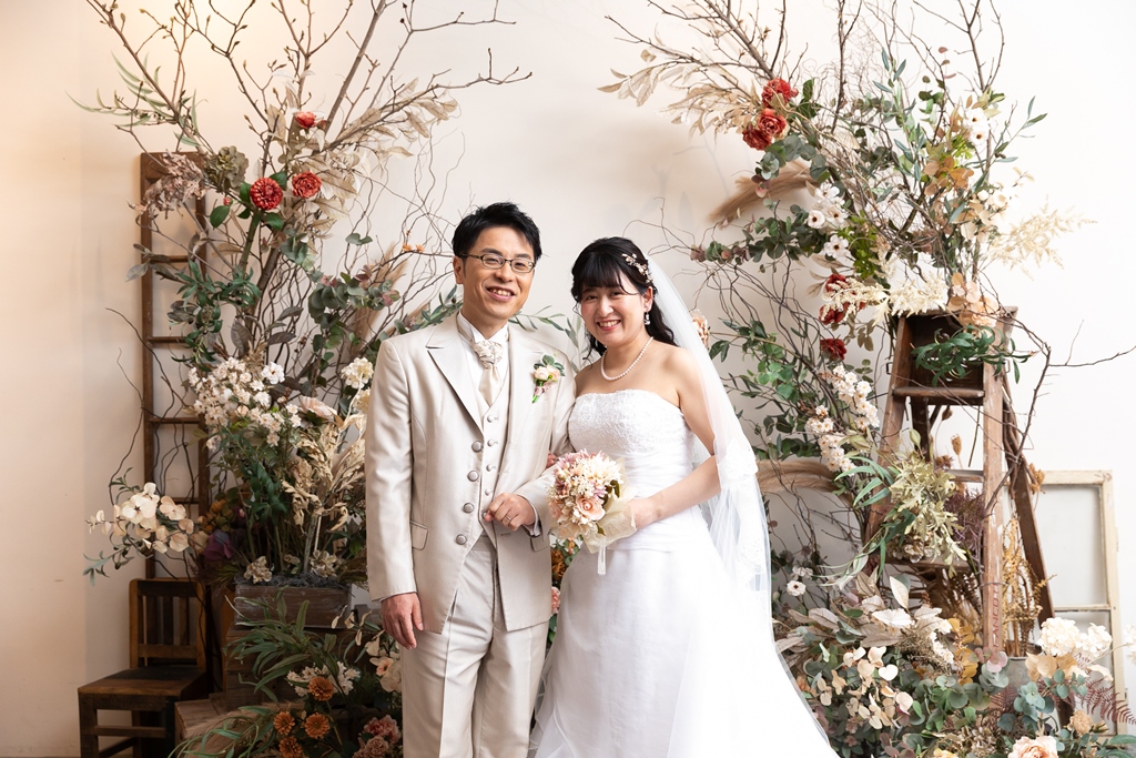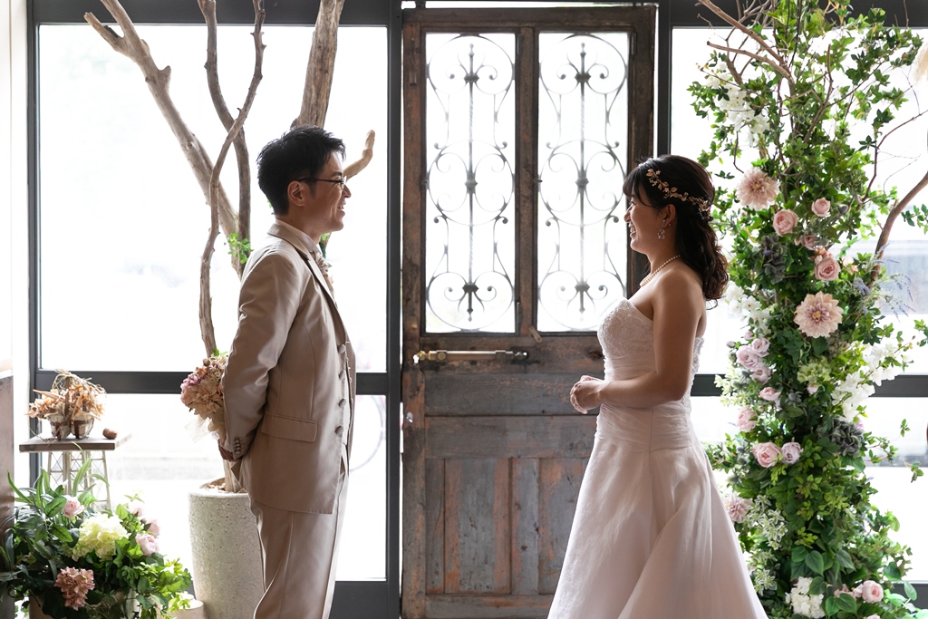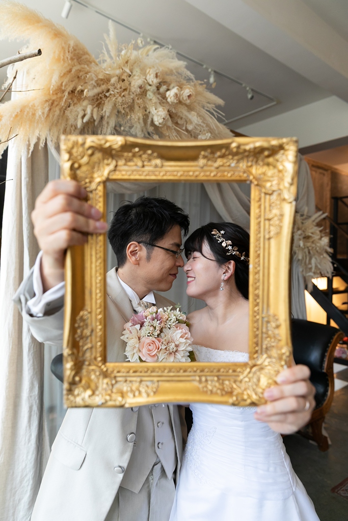 一方、名古屋スタジオでの洋装撮影では、スタジオならではの計算された光や空間の中で、おふたりの凛とした姿が一層際立っており、まるで映画のワンシーンのようなドラマチックな時間が流れていました。チャペルブースでは、自然な笑顔や、ふとしたしぐさにも深い意味が感じられ、長年歩んできた時間と、これから共に紡がれる未来のあたたかさが感じられる撮影となりました。