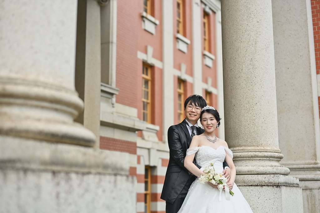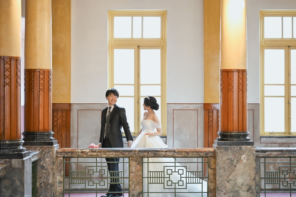 STAFF スタッフからお礼の言葉 このたびは、市政資料館という特別なロケーションでの洋装前撮りをお任せいただき、本当にありがとうございました。歴史を感じる重厚な建築とクラシカルな雰囲気が、おふたりの洗練された装いと美しい笑顔をより一層引き立てていて、まるで映画のワンシーンを見ているかのような感動がありました。