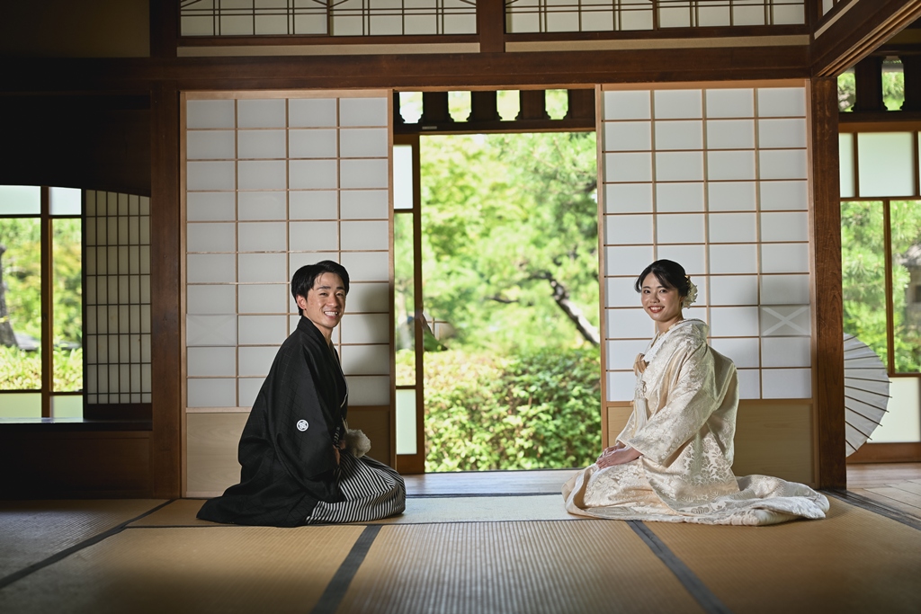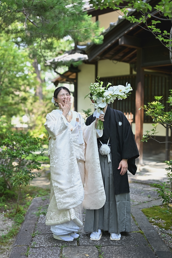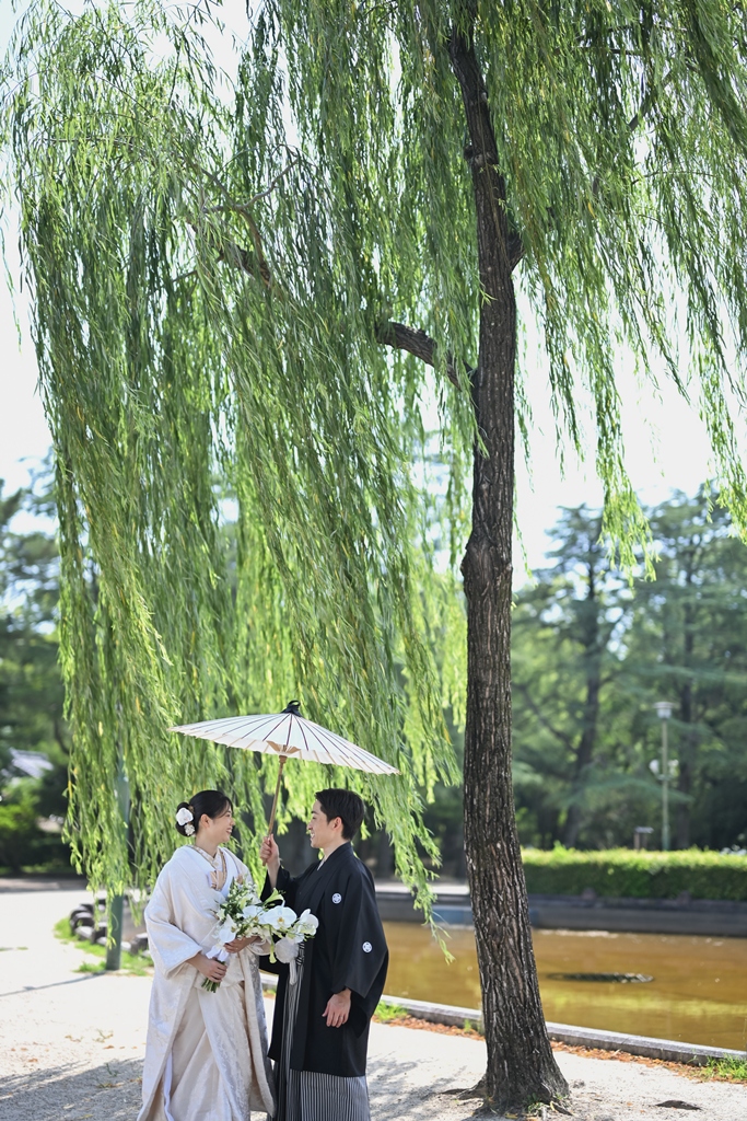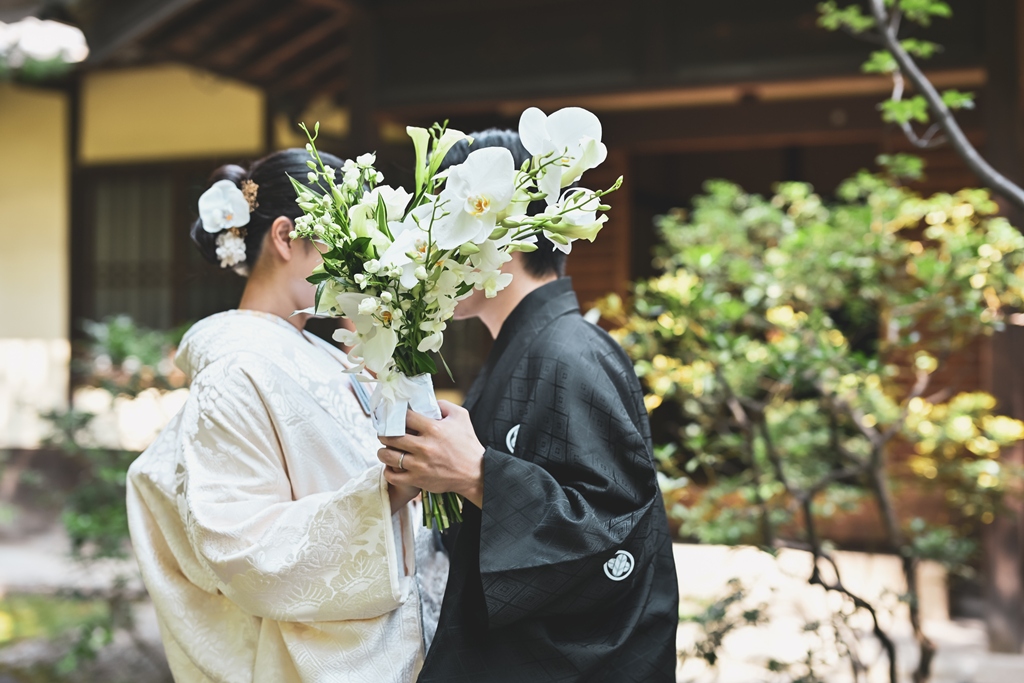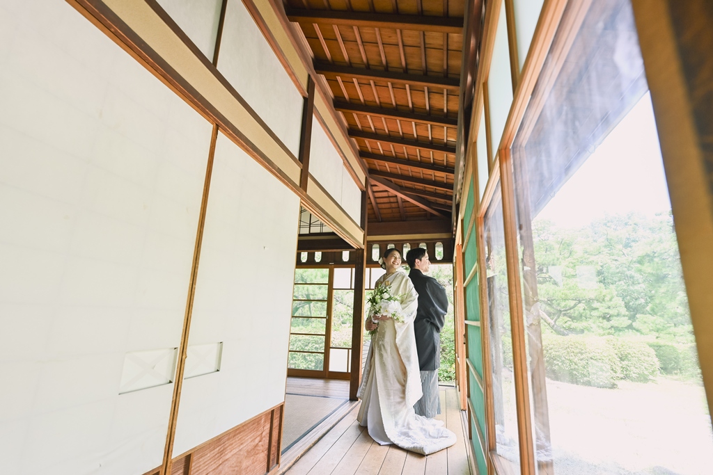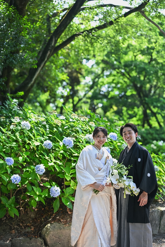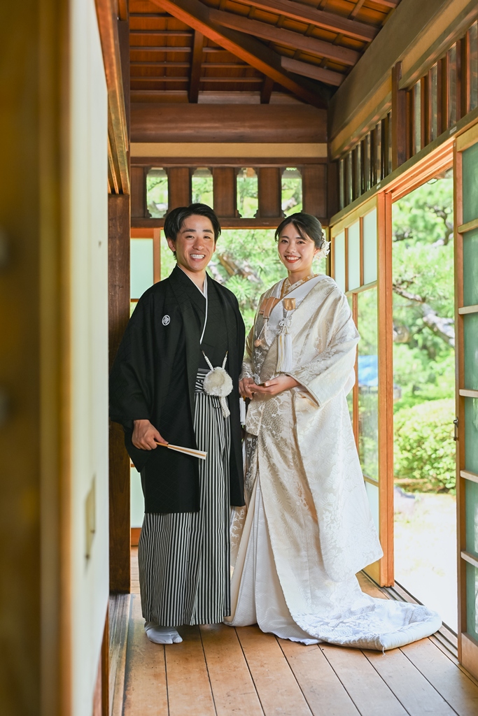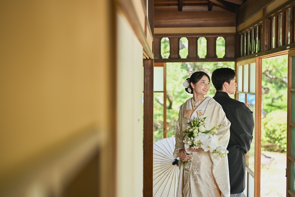 四季折々の風情が感じられる庭園の中で、おふたりの姿がまるで日本画のように映え、まさに「和」の美しさを極めた一日となりました。