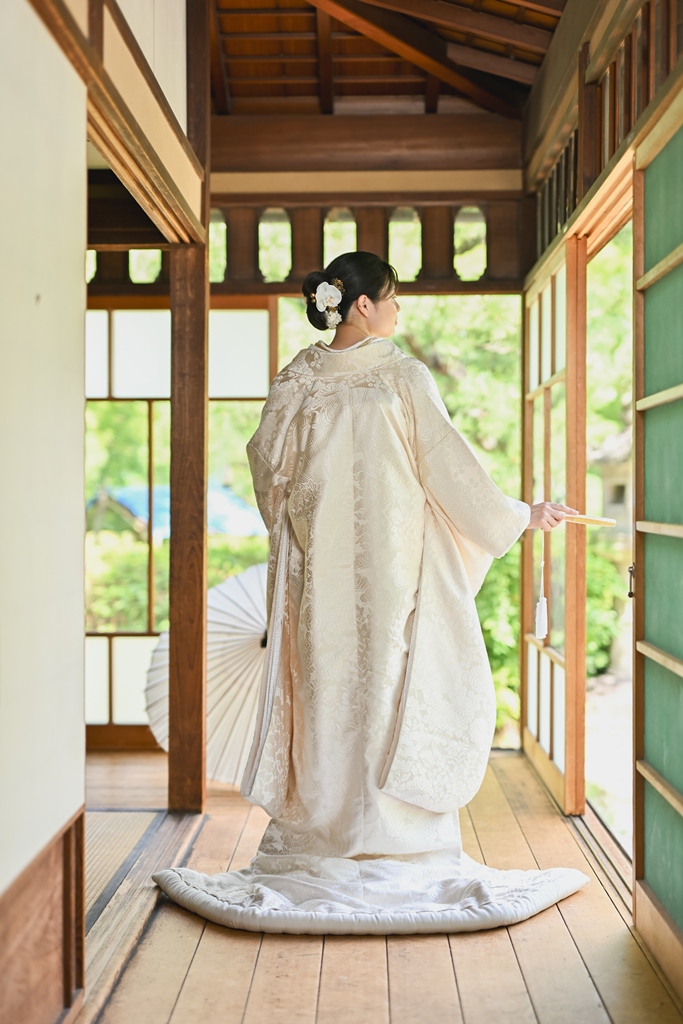 日常から少し離れたこの静謐な空間で、凛とした白無垢の佇まいや、華やかな色打掛が放つ存在感が、周囲の景観と呼応し、見る人の心に深く刻まれる瞬間を生み出していました。