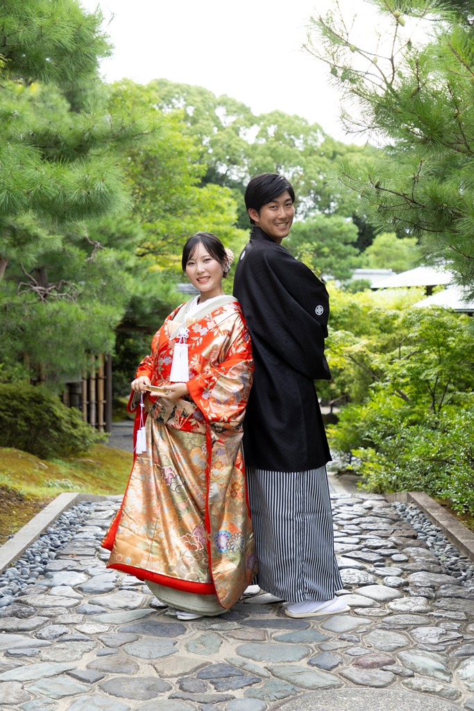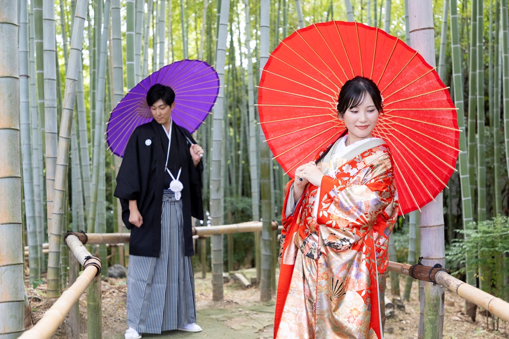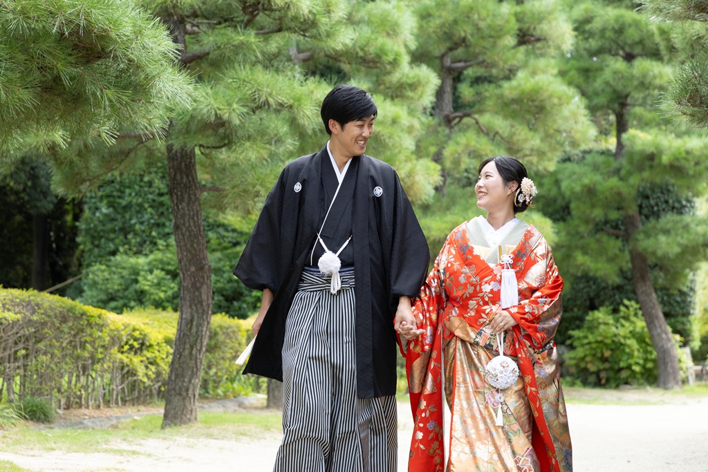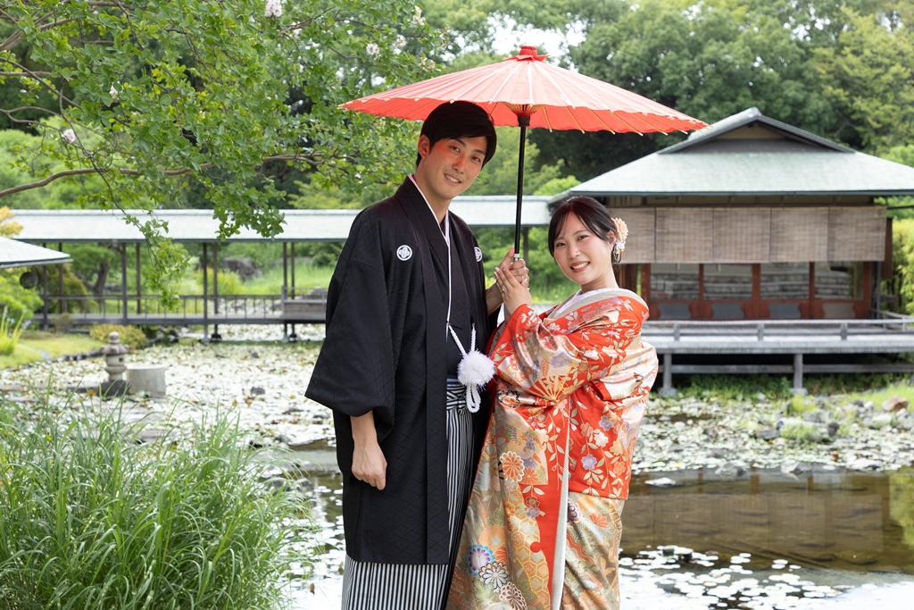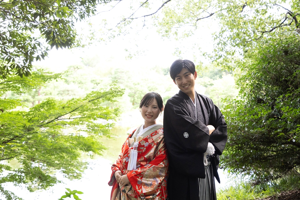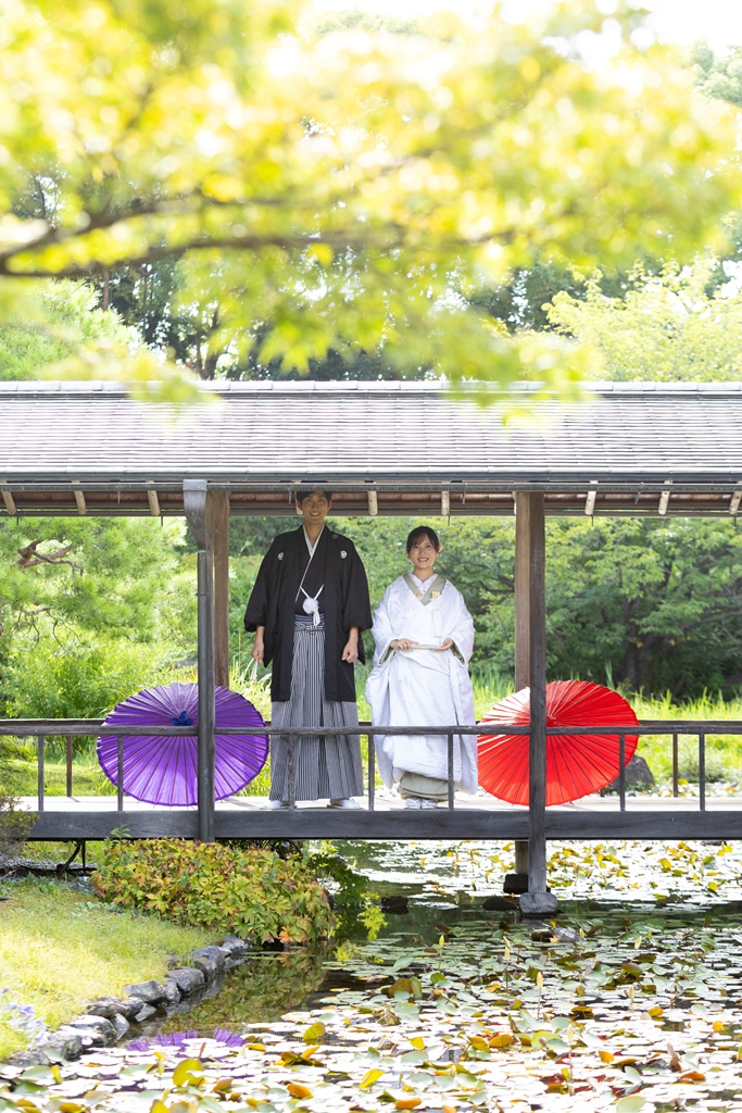 四季折々の自然が織りなす美しい風景の中で、お二人が歩まれる姿は、まるで一幅の日本画のように凛として優美であり、私たちスタッフにとっても深い感動を与えてくださいました。白鳥庭園は、静けさと風雅を兼ね備えた日本庭園として、訪れるたびに心を和ませてくれる特別な場所です。澄んだ池に映るお二人の姿、風に揺れる木々と重なり合うお着物の色合いは、まさに和装ならではの格調高い美しさを際立たせていました。撮影のひとときが、まるで時の流れを忘れてしまうほどに幻想的で、自然と調和したお二人のお姿が印象的に心に残っています。