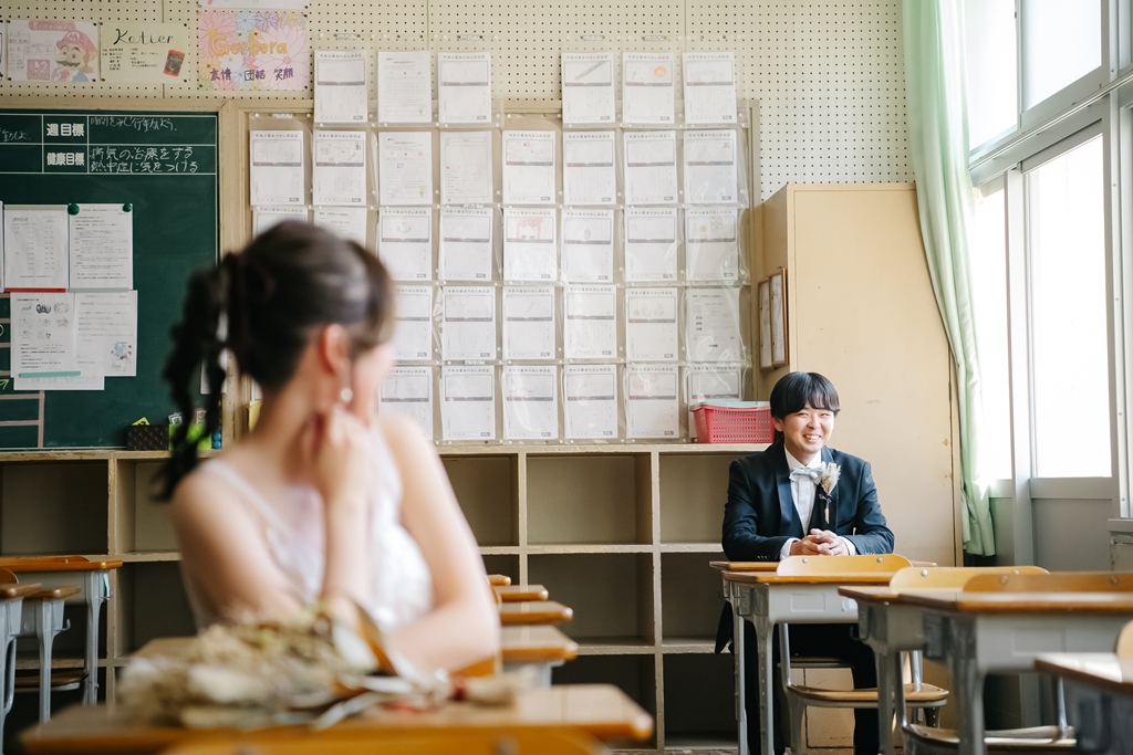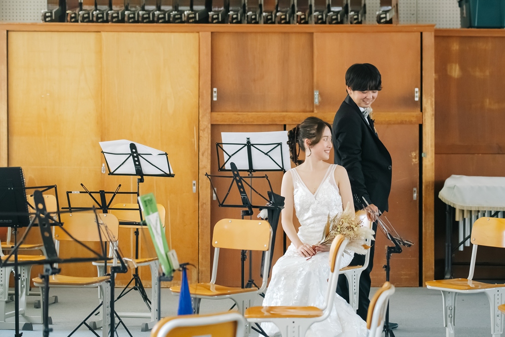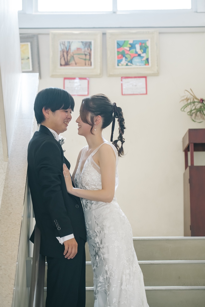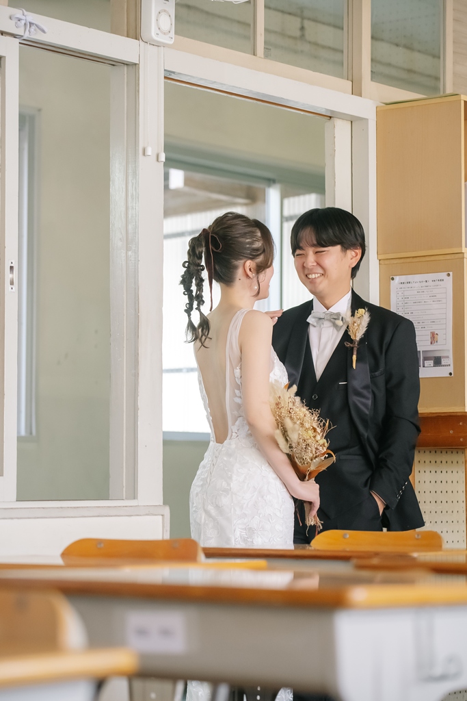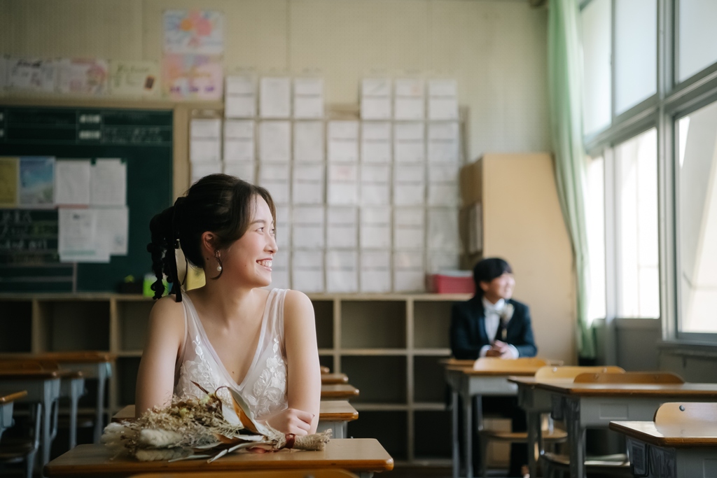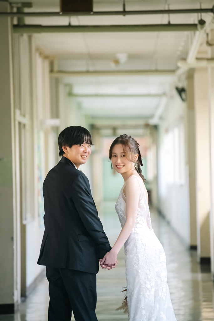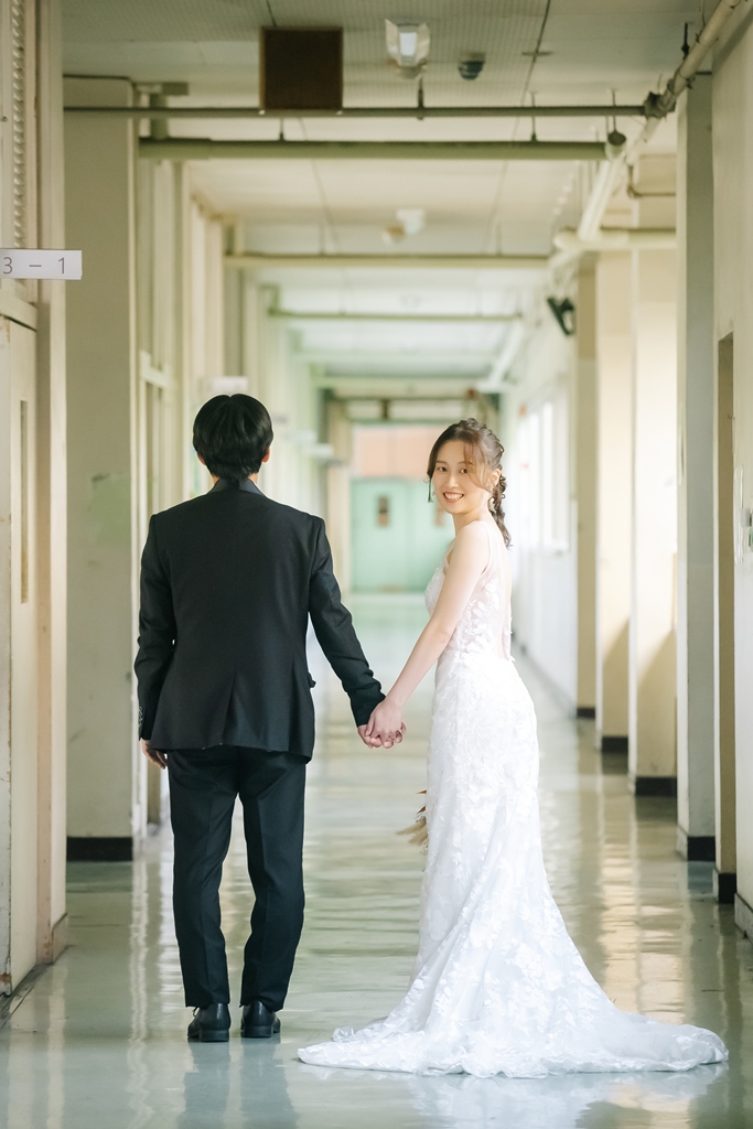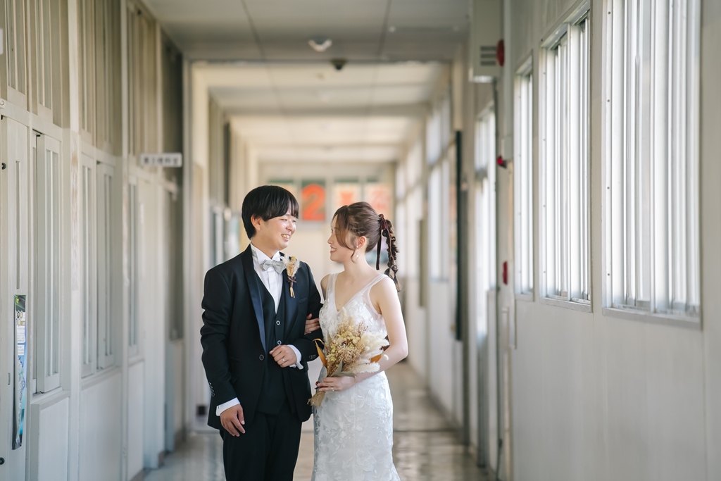 学校という慣れ親しんだ空間だからこそ、普段の笑顔や自然な仕草が写真に映え、一瞬一瞬が未来に残るかけがえのない思い出となります。教室や校庭、廊下の風景までが、お二人だけの物語の舞台となり、洋装の華やかさと融合することで、これまでにない特別な前撮り体験が生まれました。