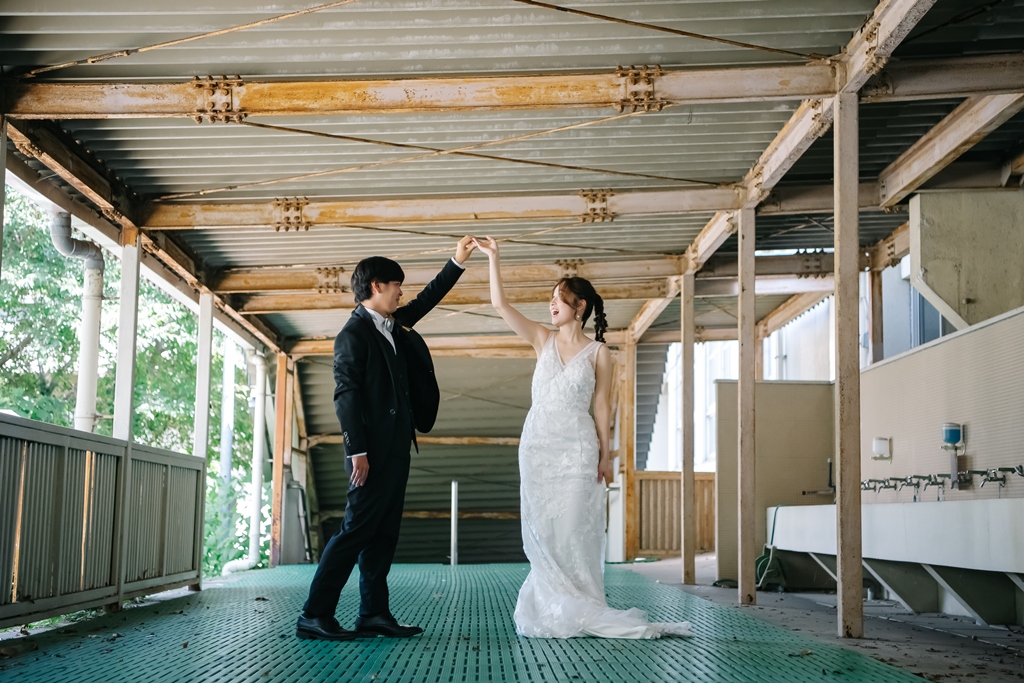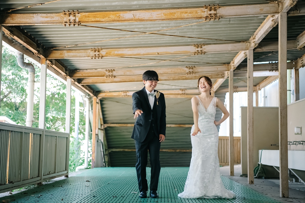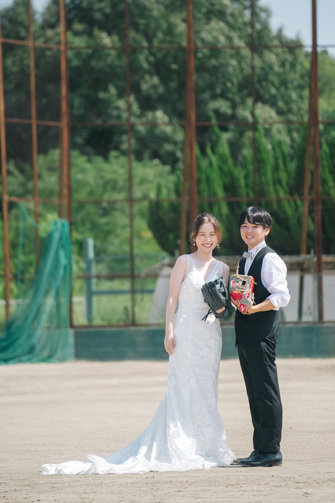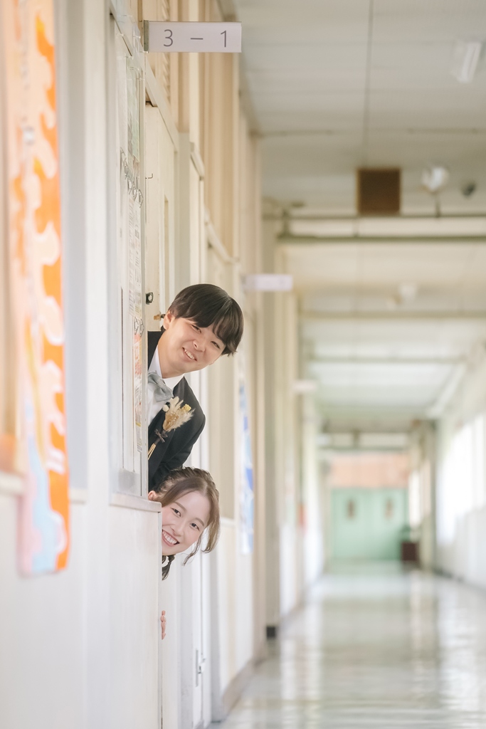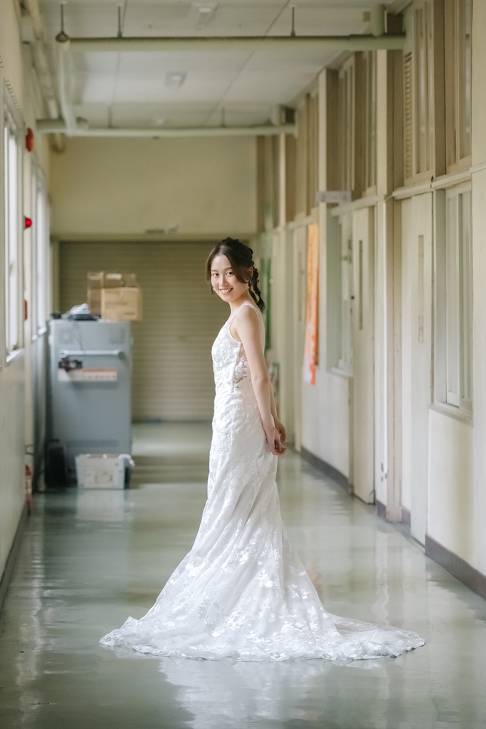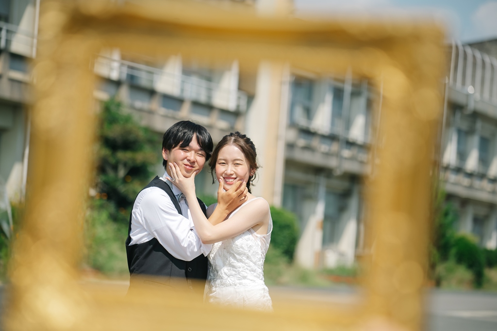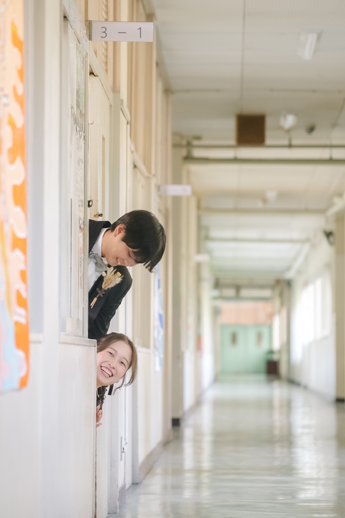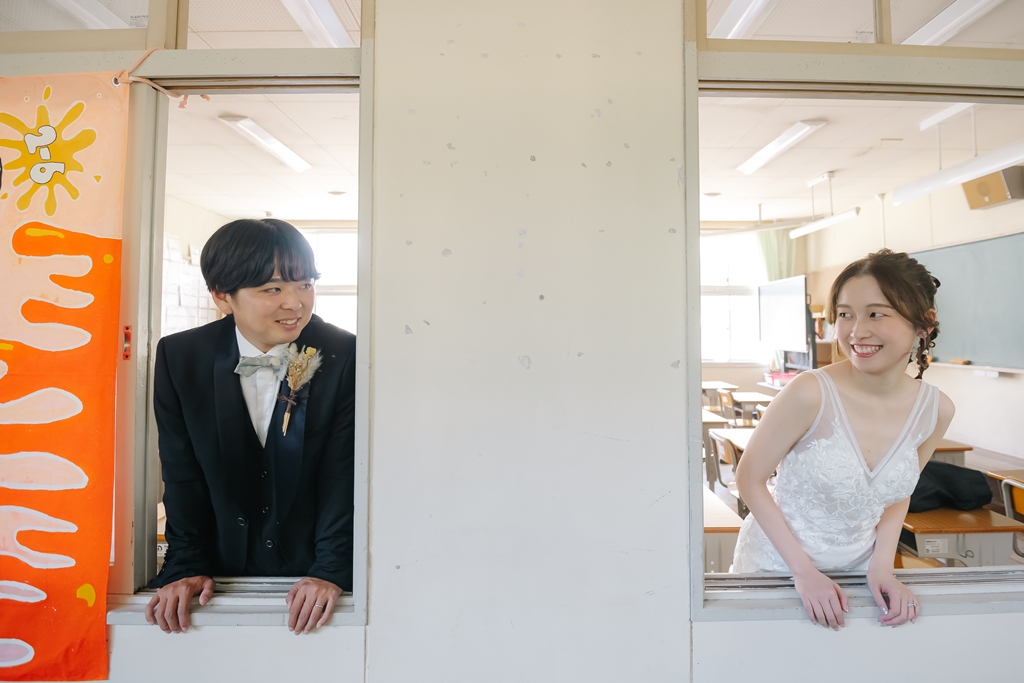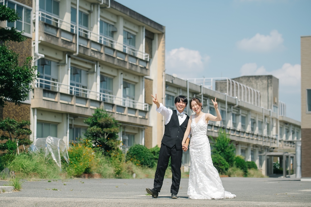 学校という慣れ親しんだ空間だからこそ、普段の笑顔や自然な仕草が写真に映え、一瞬一瞬が未来に残るかけがえのない思い出となります。教室や校庭、廊下の風景までが、お二人だけの物語の舞台となり、洋装の華やかさと融合することで、これまでにない特別な前撮り体験が生まれました。