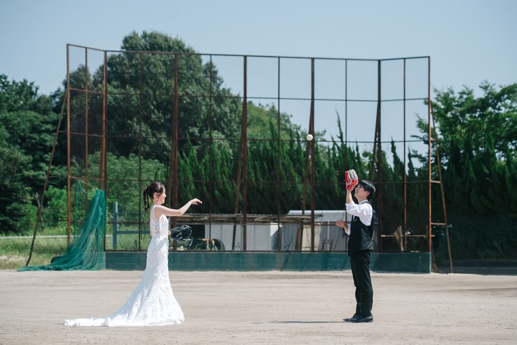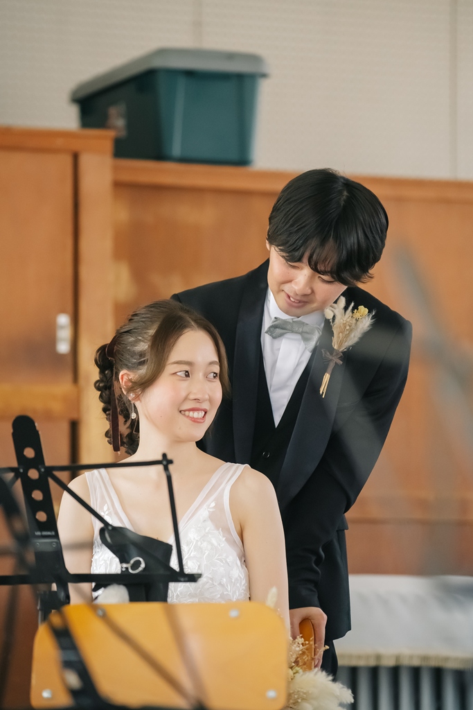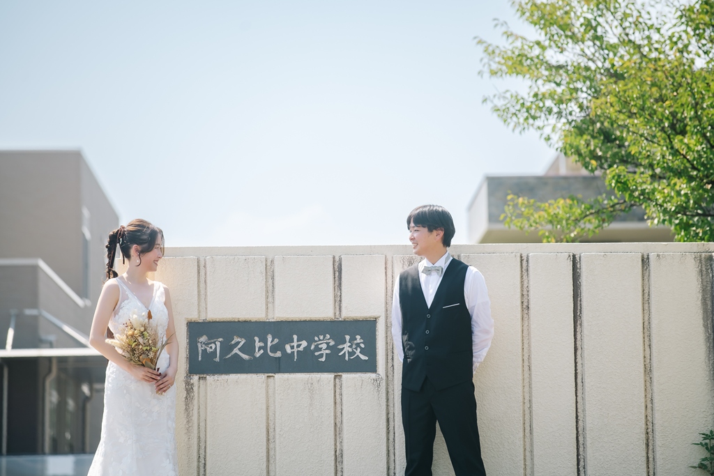 洋装でのスタイリッシュな魅力を存分に楽しみつつ、阿久比中学校という思い出の場所でしか生まれない温かさも感じられる、まさにお二人だけの特別な前撮り。どうぞ、この瞬間を大切に、末永く幸せな時間を重ねてください。
