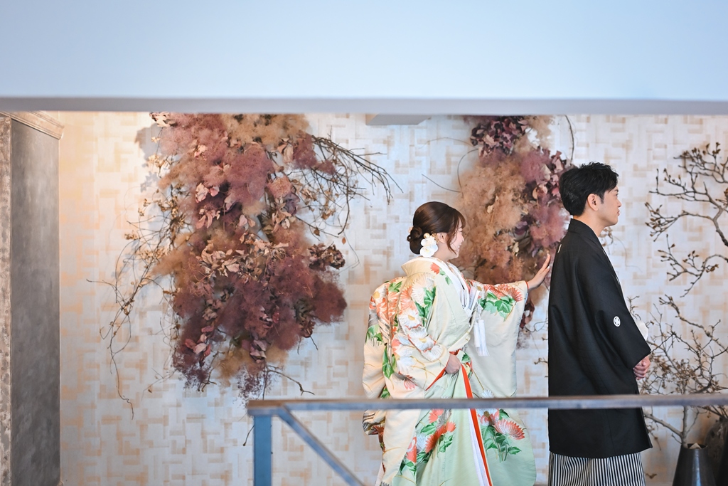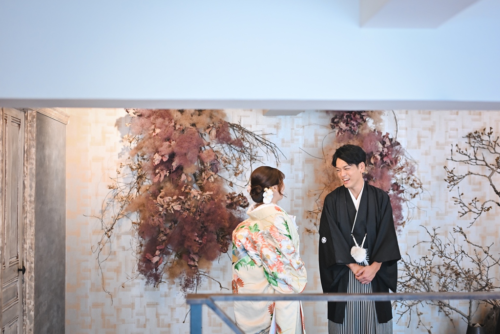 おふたりの大切な一日にご一緒できましたこと、心より嬉しく思っております。まずは和装での撮影では、柔らかな光に包まれた静かな空間の中で、白無垢や色打掛の質感が美しく引き立っておりました。