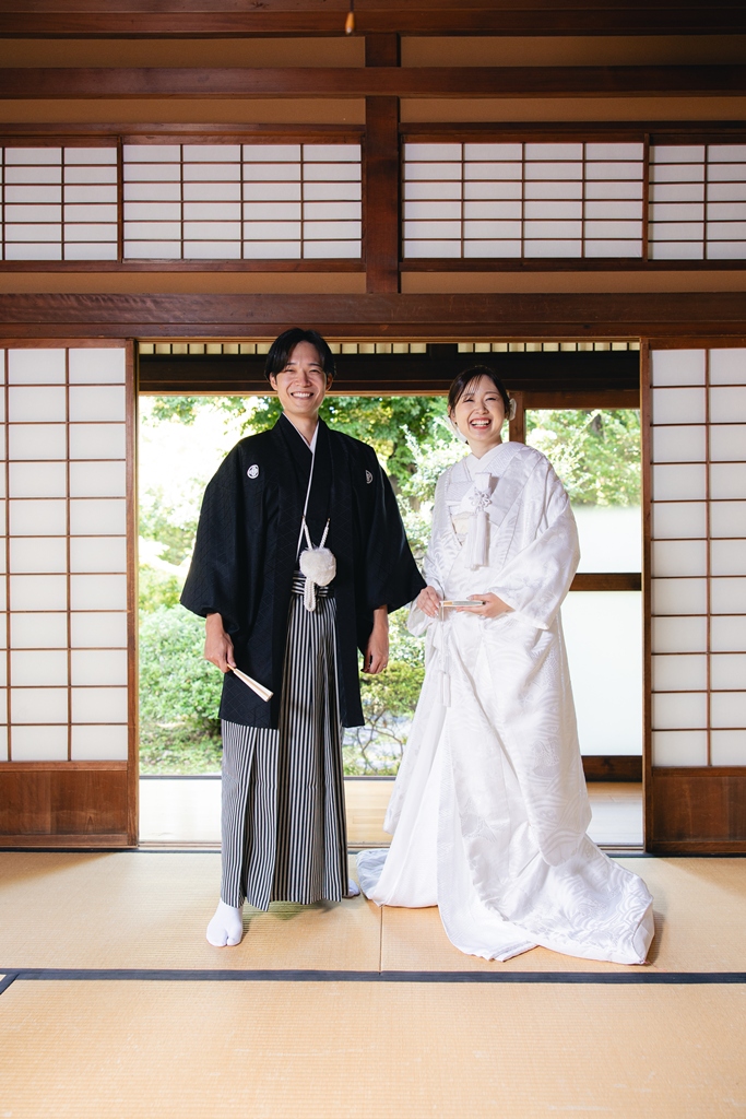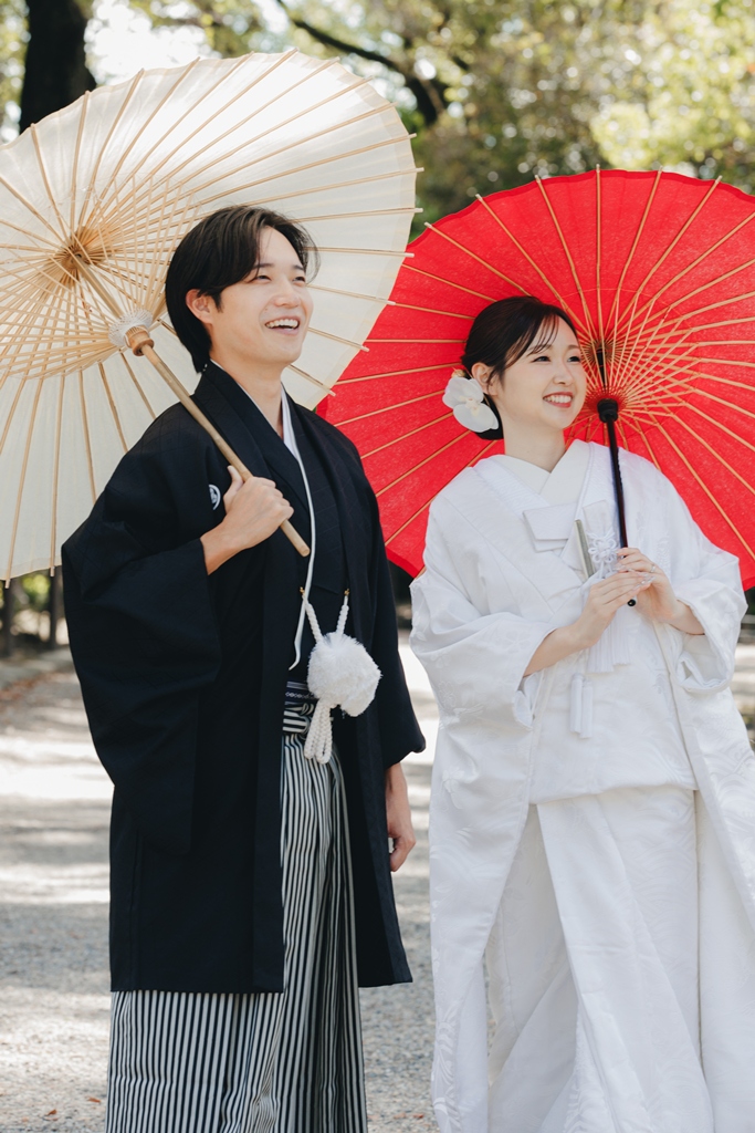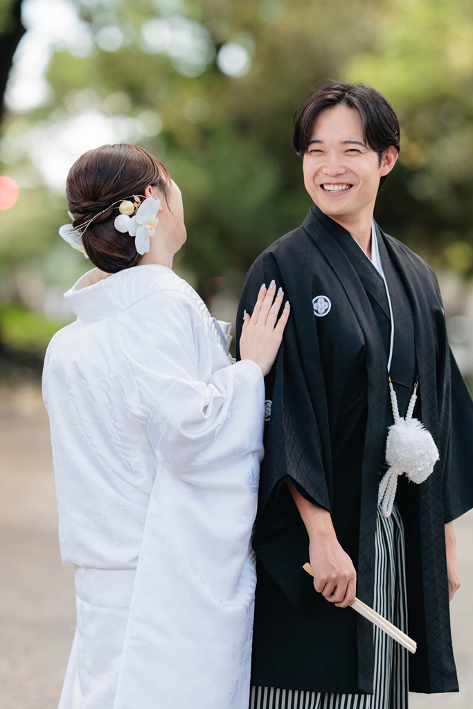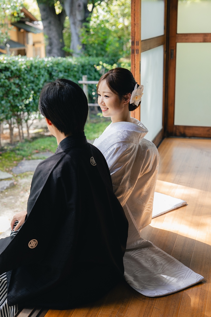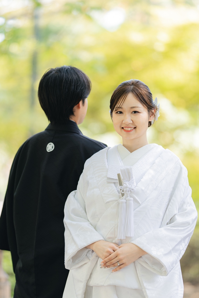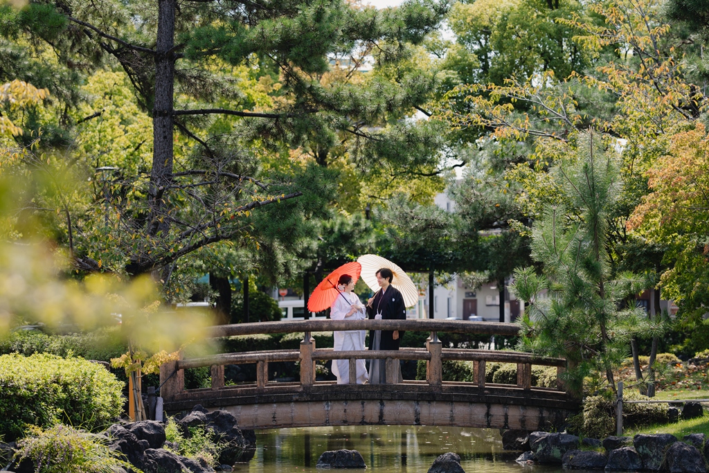 静かに揺れる木々、柔らかい光、趣のある建造物が調和し、おふたりの特別な一日を優雅に包み込んでくれました。撮影当日、和装の凛とした気品をまとったおふたりが、ゆっくりと公園内を歩かれる姿は本当に美しく、