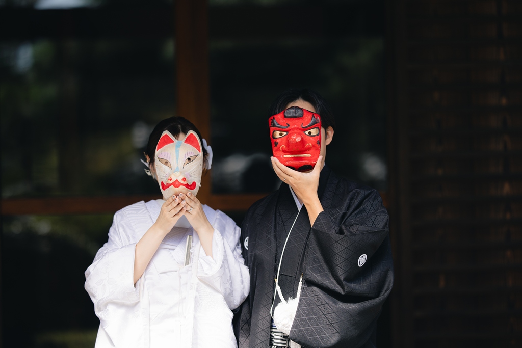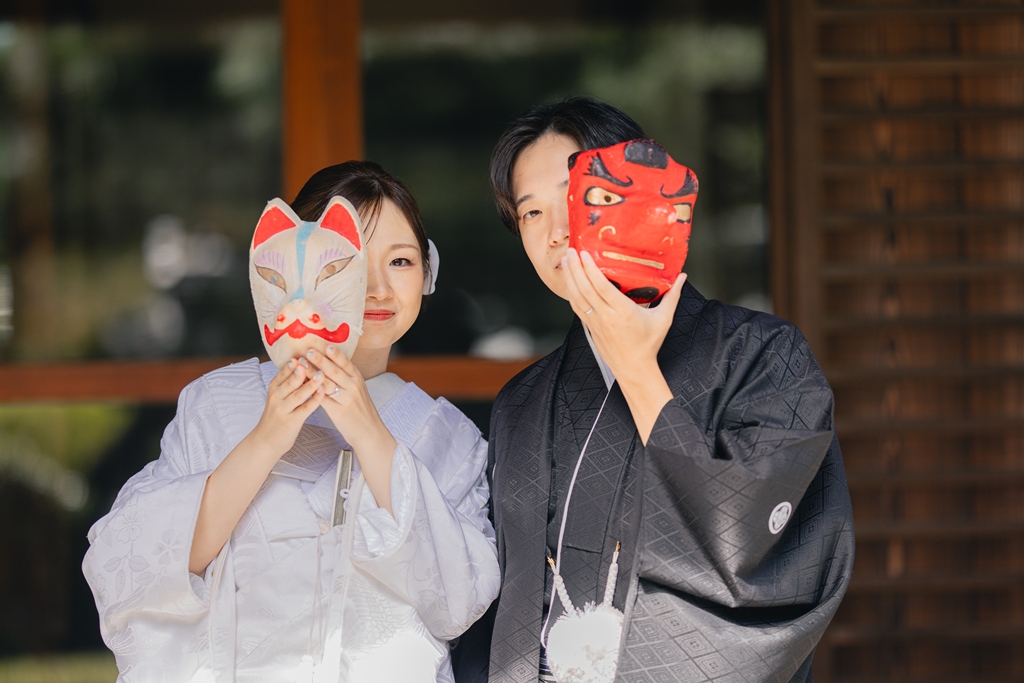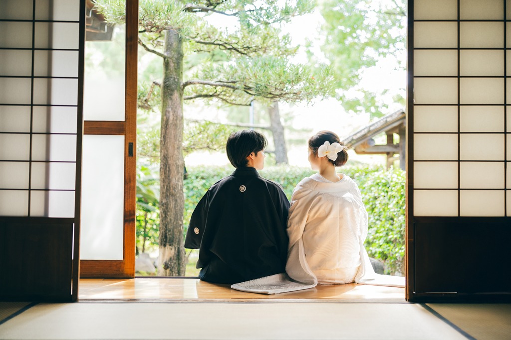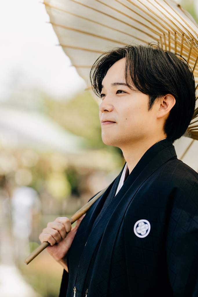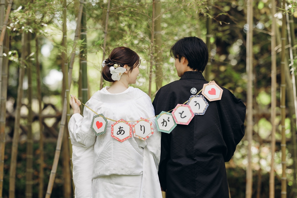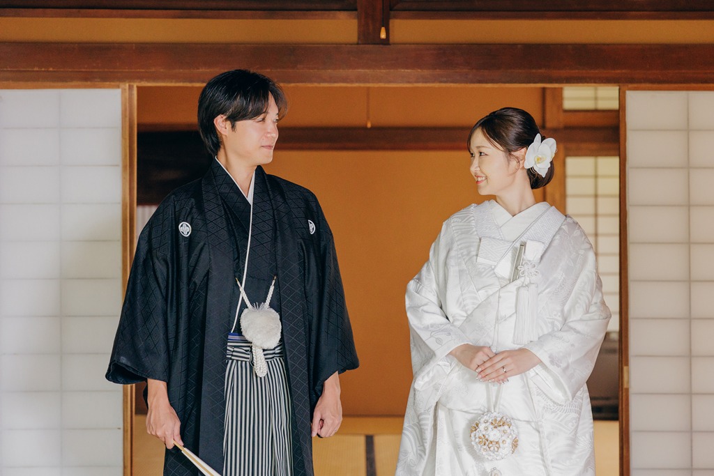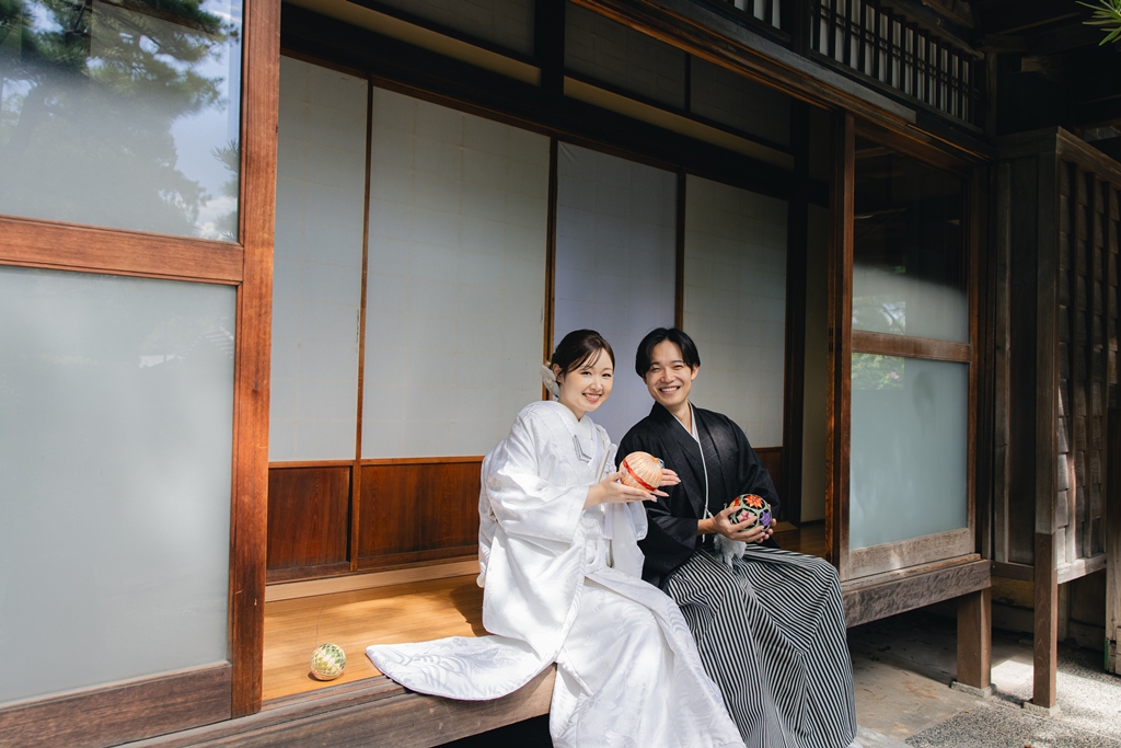 静かに揺れる木々、柔らかい光、趣のある建造物が調和し、おふたりの特別な一日を優雅に包み込んでくれました。撮影当日、和装の凛とした気品をまとったおふたりが、ゆっくりと公園内を歩かれる姿は本当に美しく、