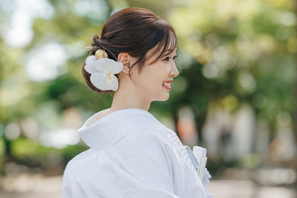 おふたりが立つ場所ごとに景色が表情を変え、四季の彩りや自然の光と重なりながら、一瞬一瞬が絵になる特別な時間となっていました。白無垢の柔らかな白さは中村公園の穏やかな雰囲気の中で優しく輝き、