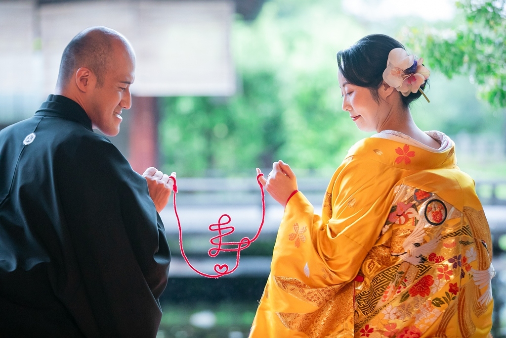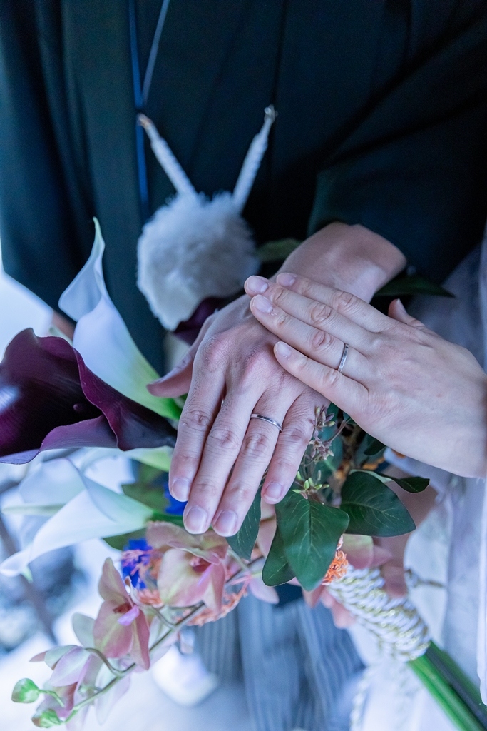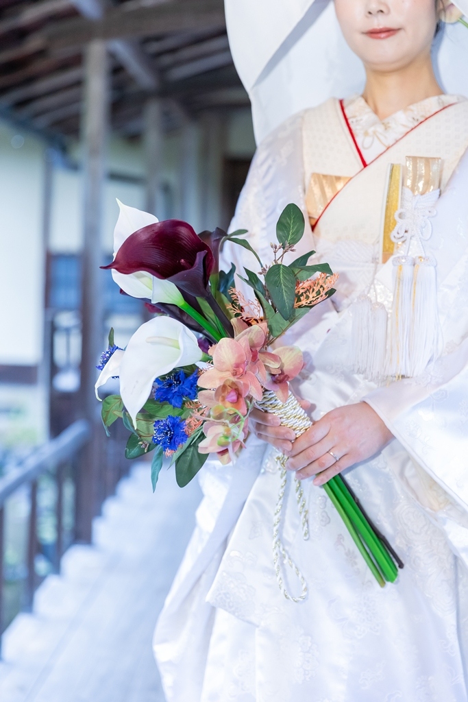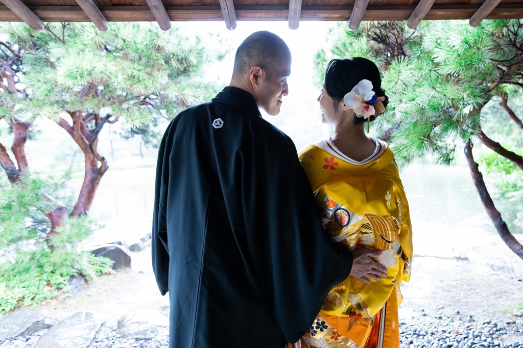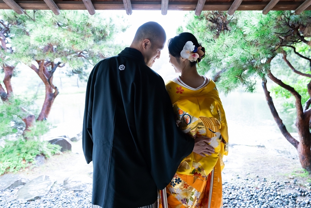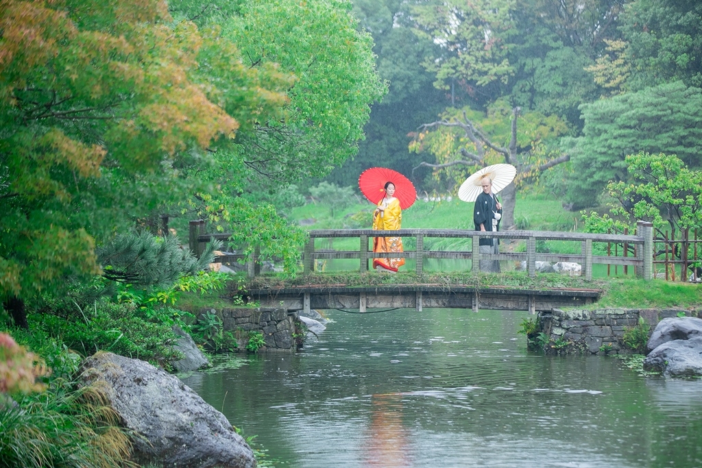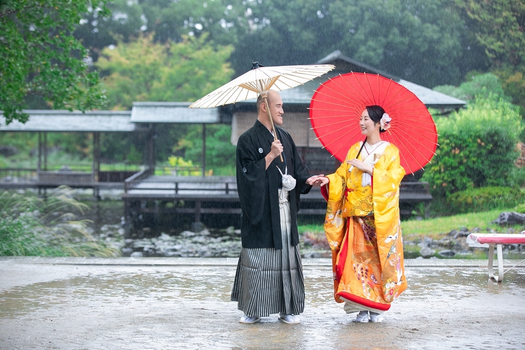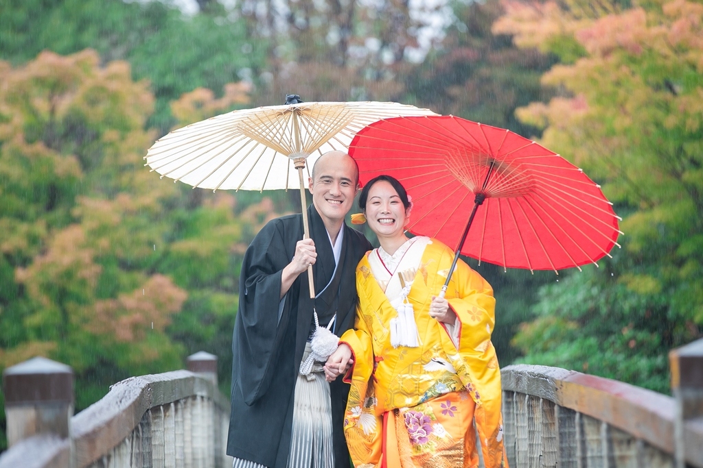 和装ならではの品格と凛とした佇まいを纏ったおふたりが、雨の中和傘をさしながら撮影しているのが、スタッフ一同胸が熱くなる思いで見守っておりました。