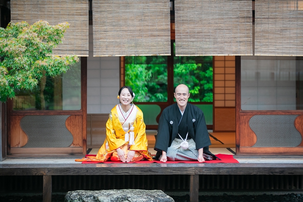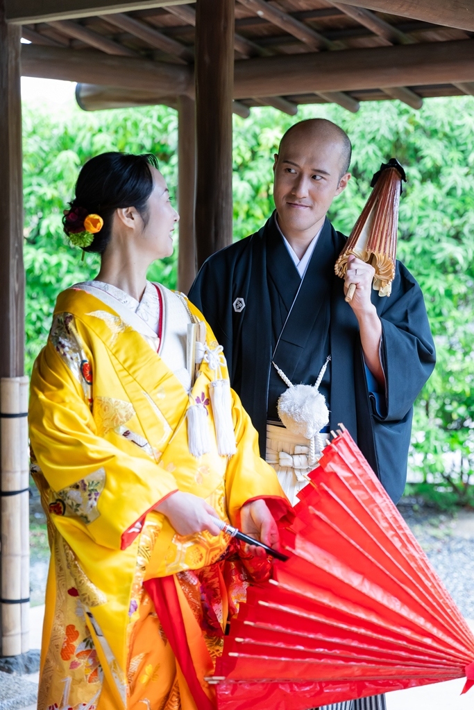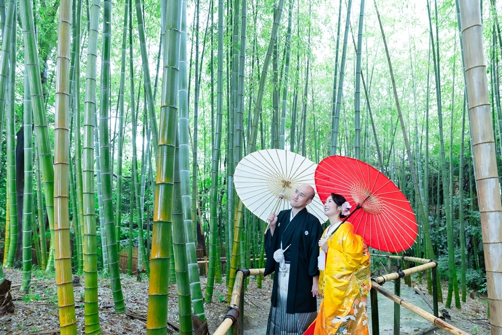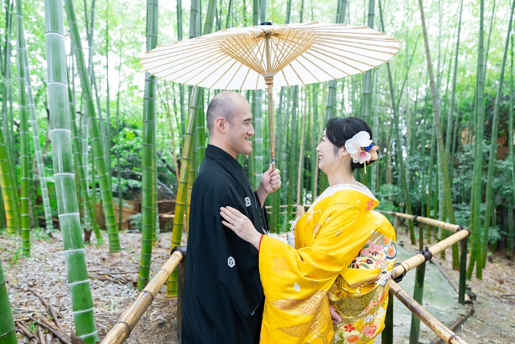竹林との撮影も、黄色の色打掛がとても映えてお二人の表情が明るく見えます!