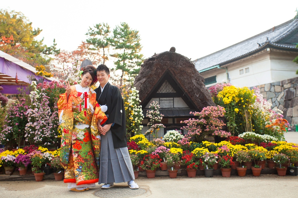 名古屋城では菊まつりでしょうか?色鮮やかなお花がたくさん咲いていていつもとはまた違った名古屋城の情景を楽しめました。そして名古屋城の前でお姫様抱っこ!新婦様の照れながらも嬉しそうな顔が印象的です!
